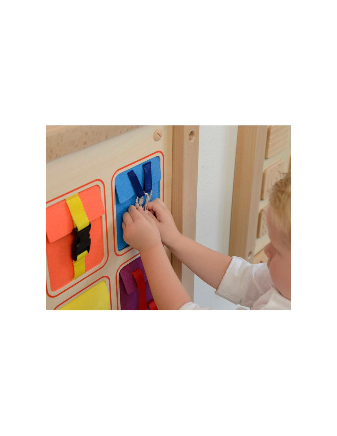MASTERKIDZ Wooden Flex Wall Manipulation Board with Colorful Pockets, Buckles and Velcro
