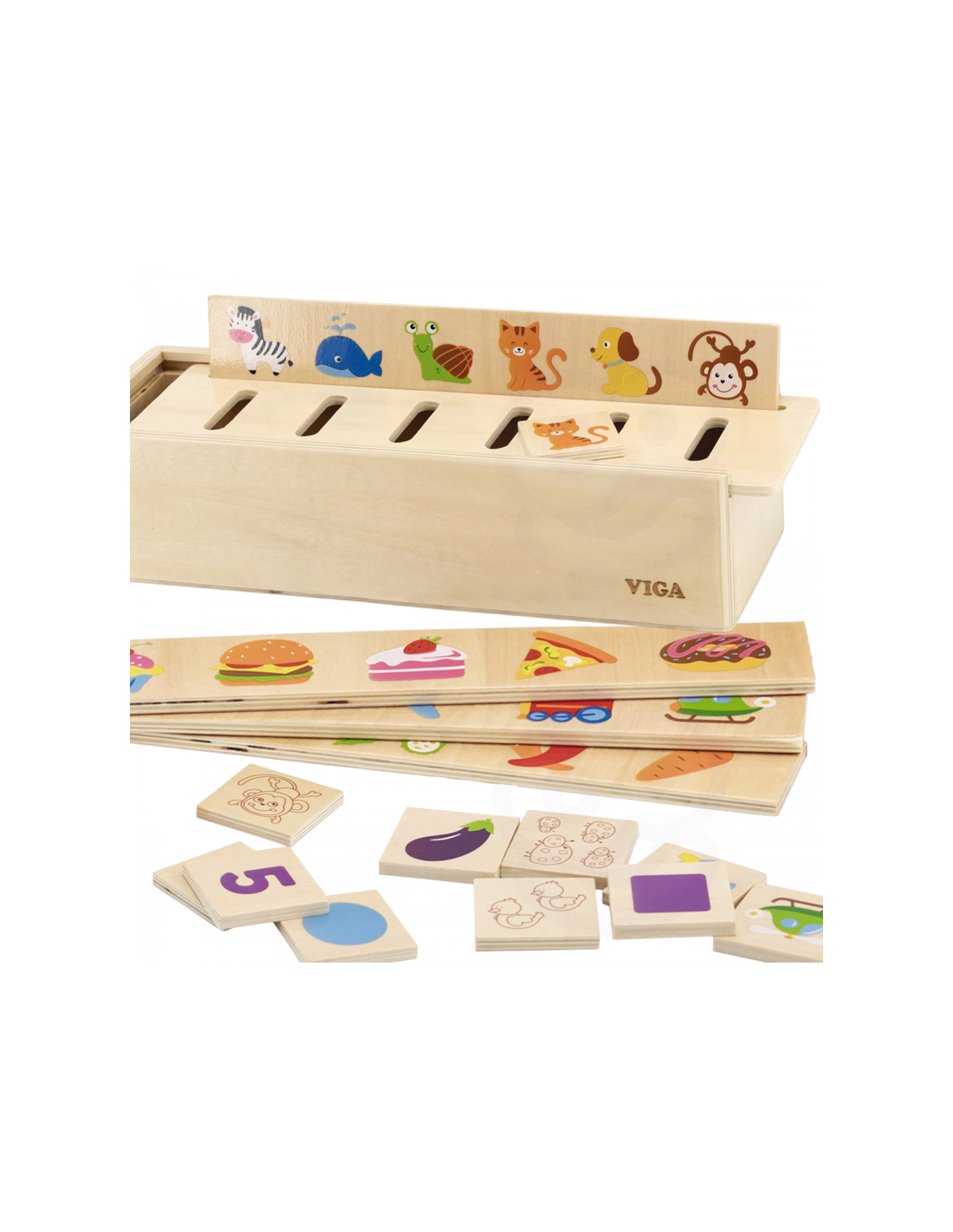 Drewniany Edukacyjny Sorter od renomowanej marki VIGA to idealna zabawka dla dzieci, które zaczynają poznawać świat. Ładne, z wysokiej jakości drewna pudełko posiada 6 przegródek na zdejmowanym wieczku, w które wrzuca się drewniane klocki z odpowiednią kategorią. Zestaw zawiera 4 długie deseczki oraz 48 sztuk drewnianych klocków z kategoriami warzyw, owoców, transportu, kształtów, zwierząt i liczb. Należy umieścić jedną z desek na wieczku, a następnie znaleźć pasujący obrazek, aby włożyć go do odpowiedniej przegródki. Dzięki tej zabawie twoje dziecko nauczy się podstawowych materiałów z życia codziennego i nauczy się je kategoryzować.