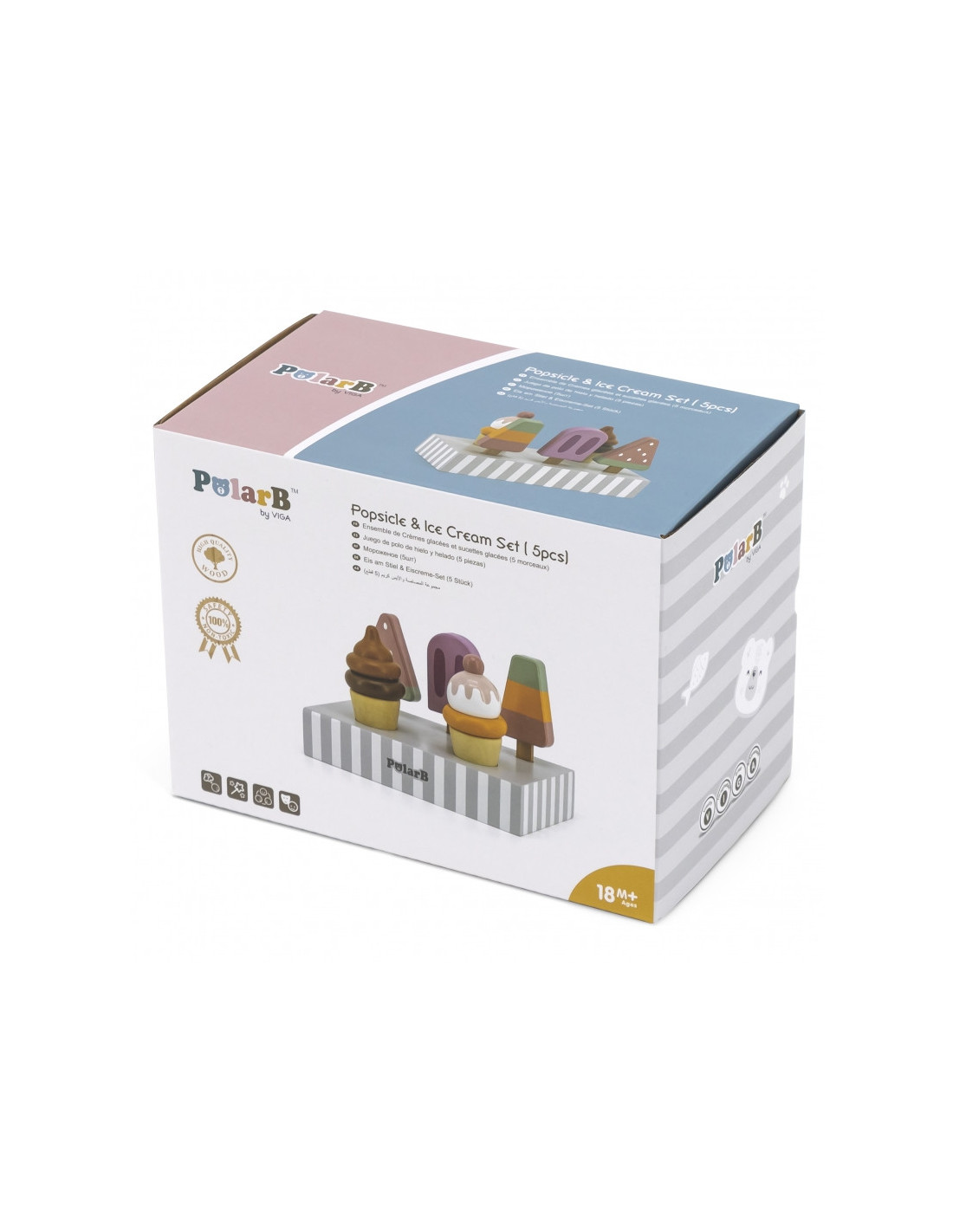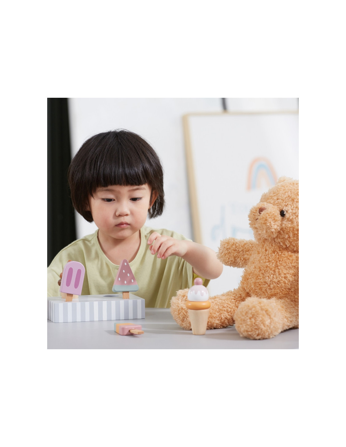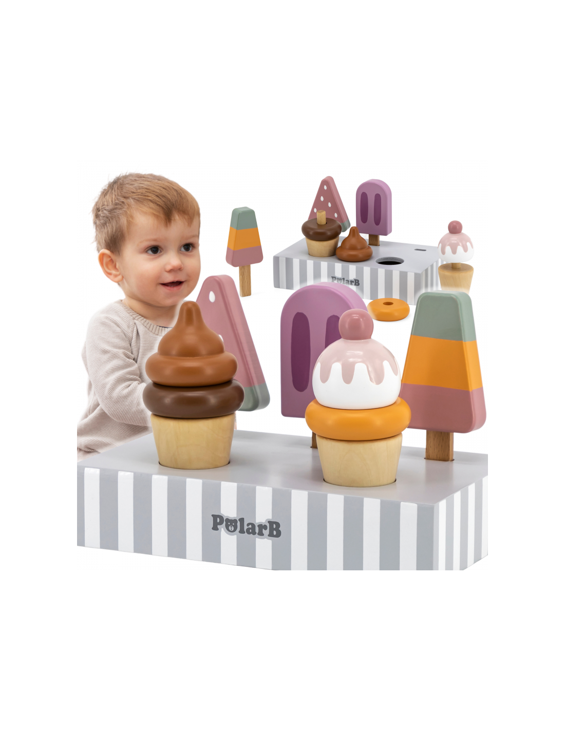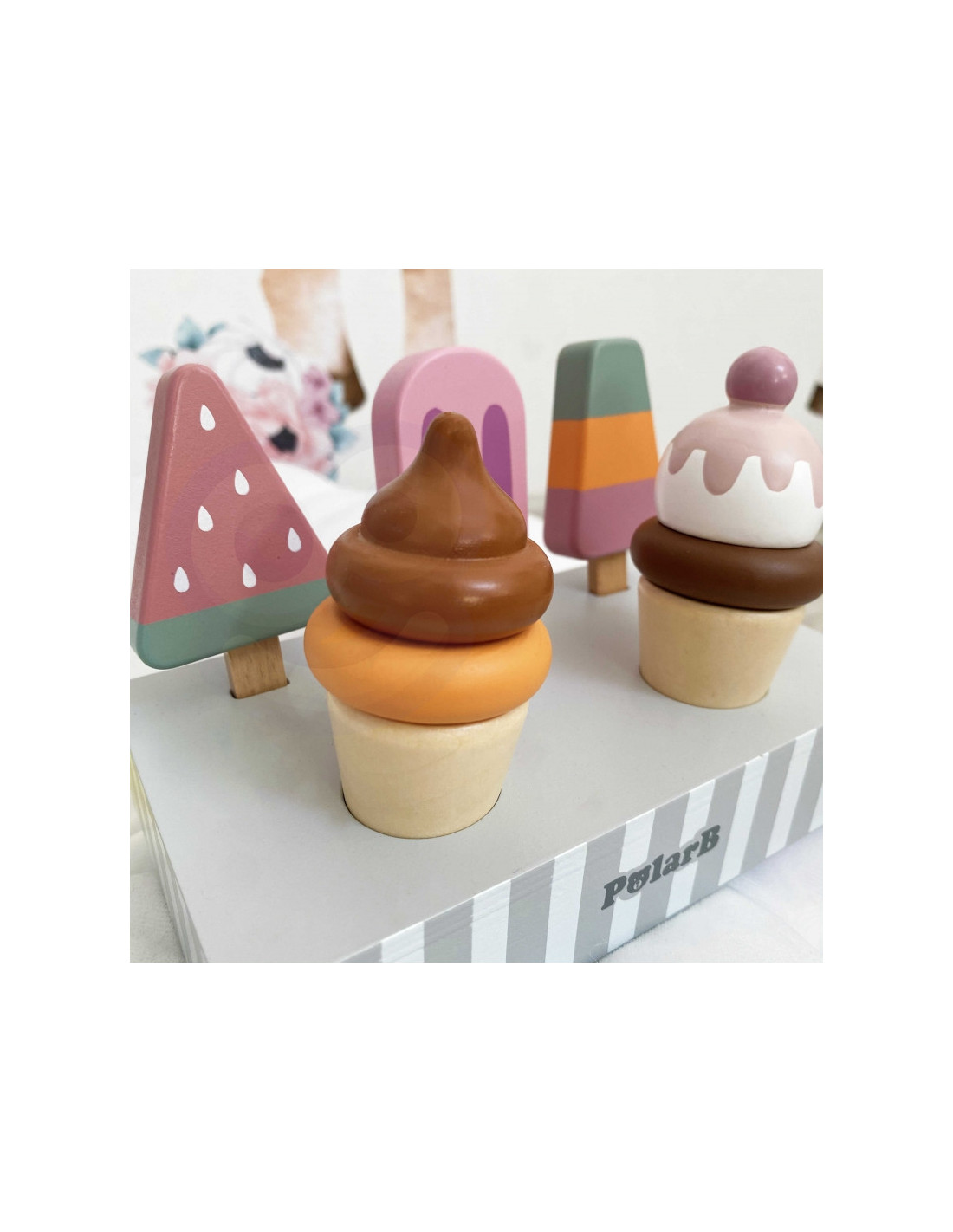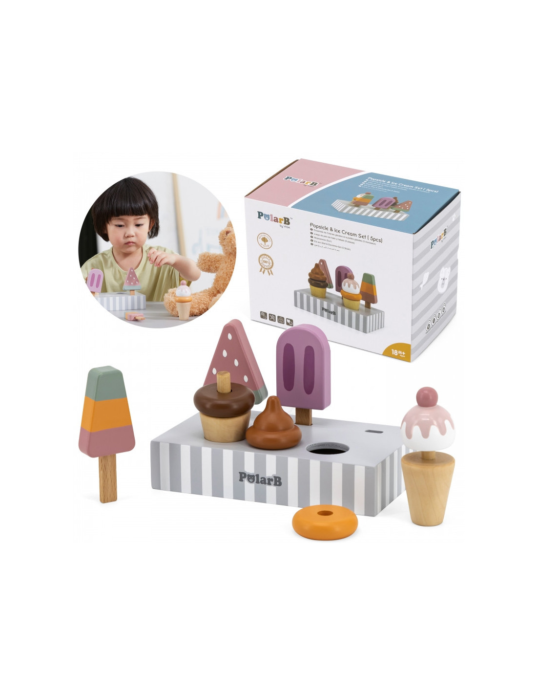 Drewniany zestaw pięciu lodów idealnych na deser w upalny dzień. Lody w pięknej, smakowitej kolorystyce wykonane ze starannością o każdy szczegół. Ten drewniany zestaw świetnie sprawdzi się w zabawie w sklep, jak również jako akcesoria wyposażenia dziecięcej kuchni. Świetna jakość wykonania, urocza kolorystyka, praktyczność i funkcjonalność. Zabawa w dom, zabawa w sklep i naśladowanie ról dorosłych - to kreatywny sposób na kształtowanie relacji społecznych, oraz rozwijanie i poznawanie słownictwa.