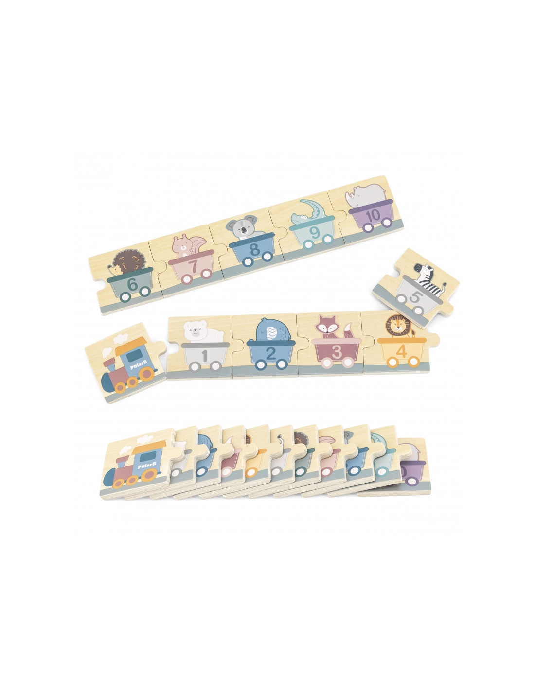- - z dodatkowych puzzli dziecko układa pociąg ze zwierzątkami w odpowiedniej kolejności.