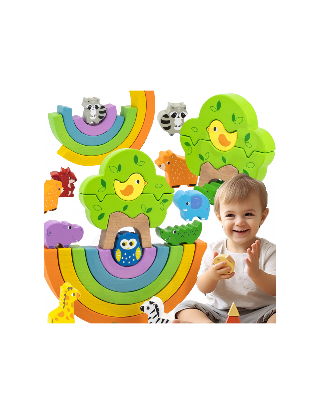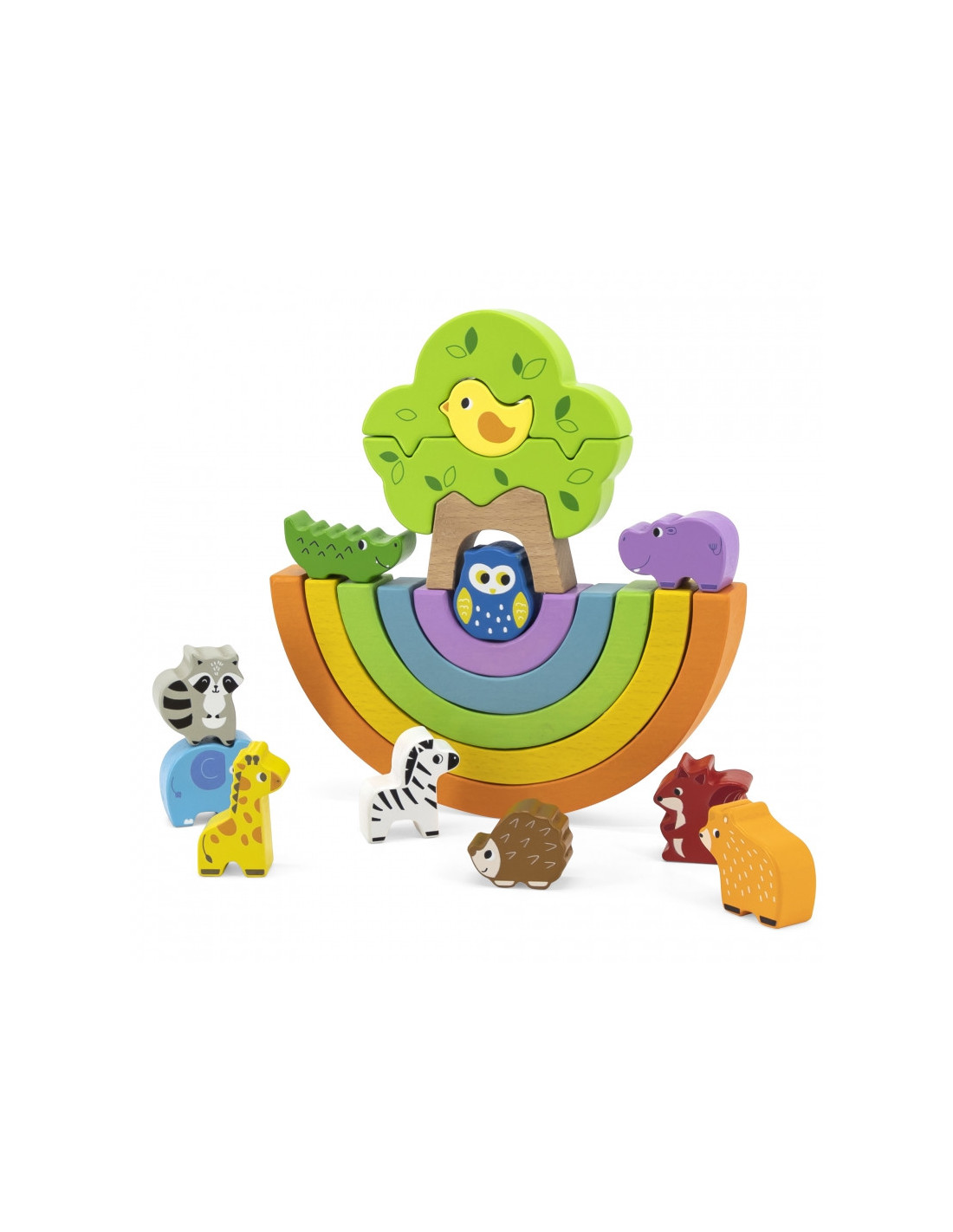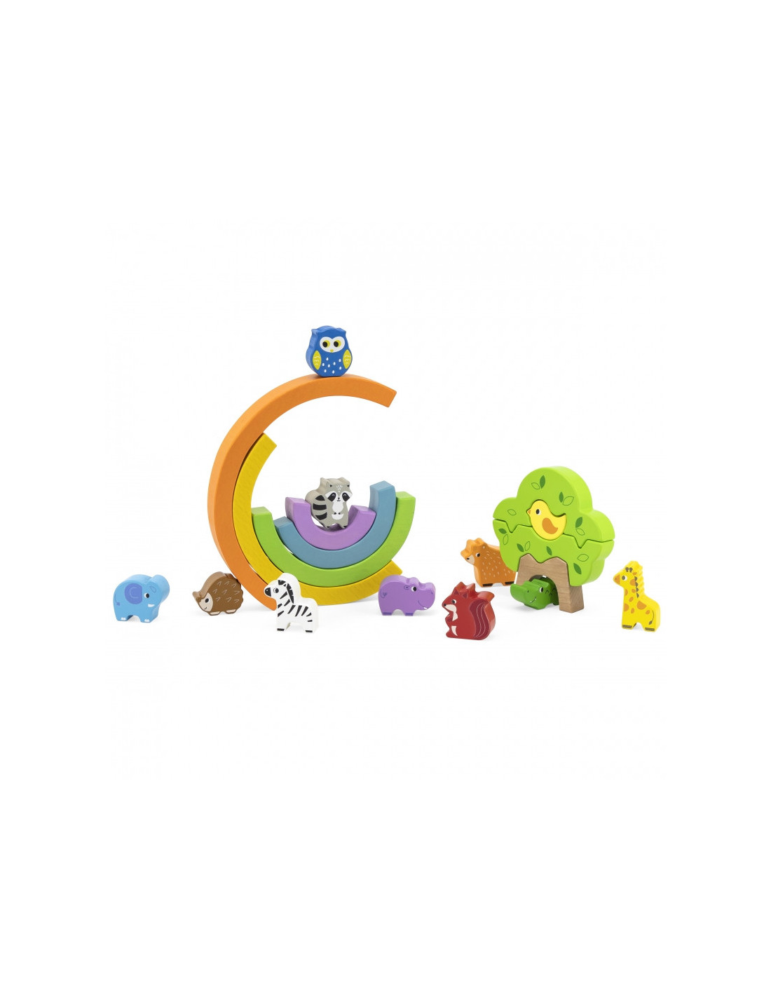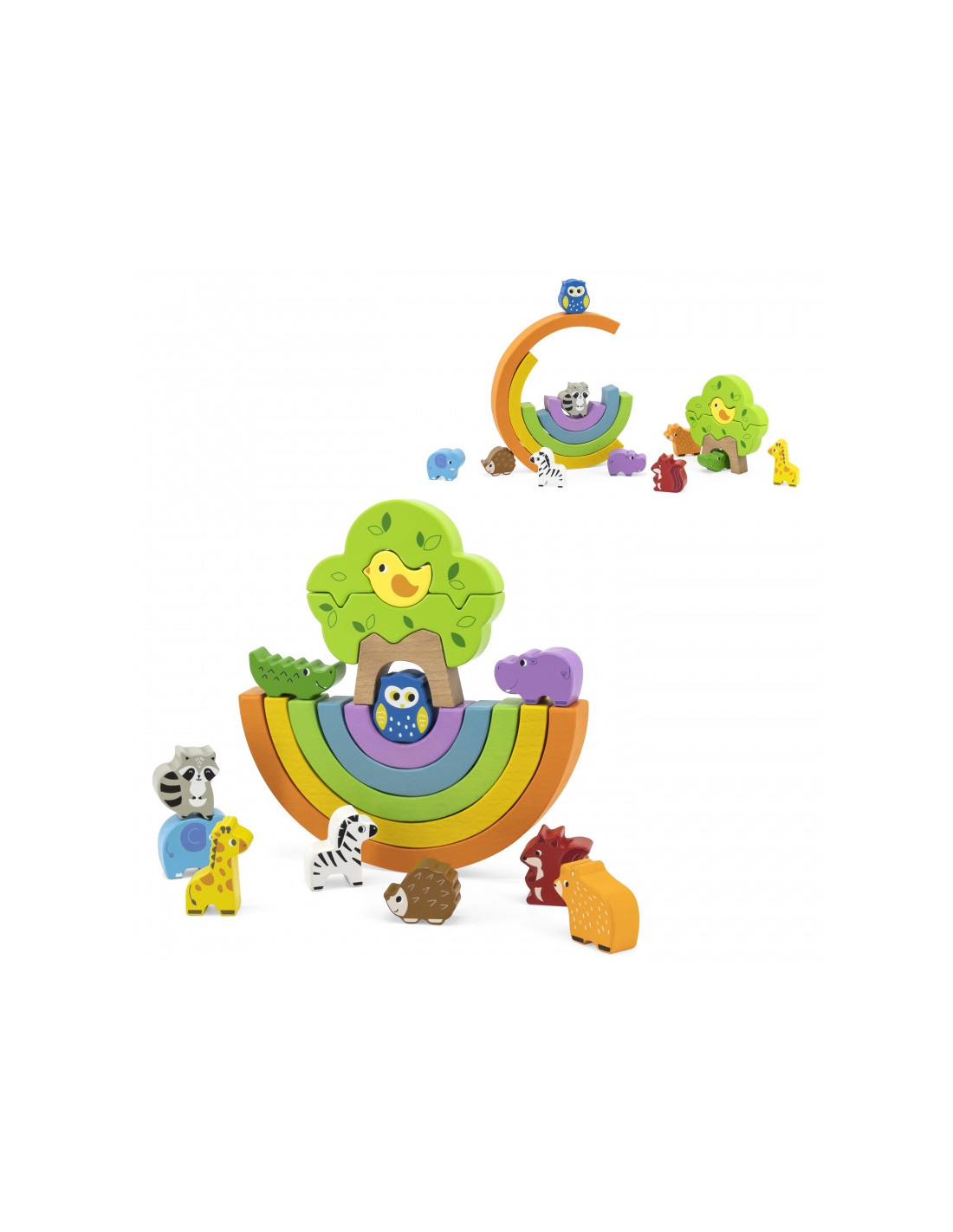 - - zestaw składa się z 5 kolorowych łuków, 11 zwierzątek oraz 3 klocków, z których powstaje drzewko,