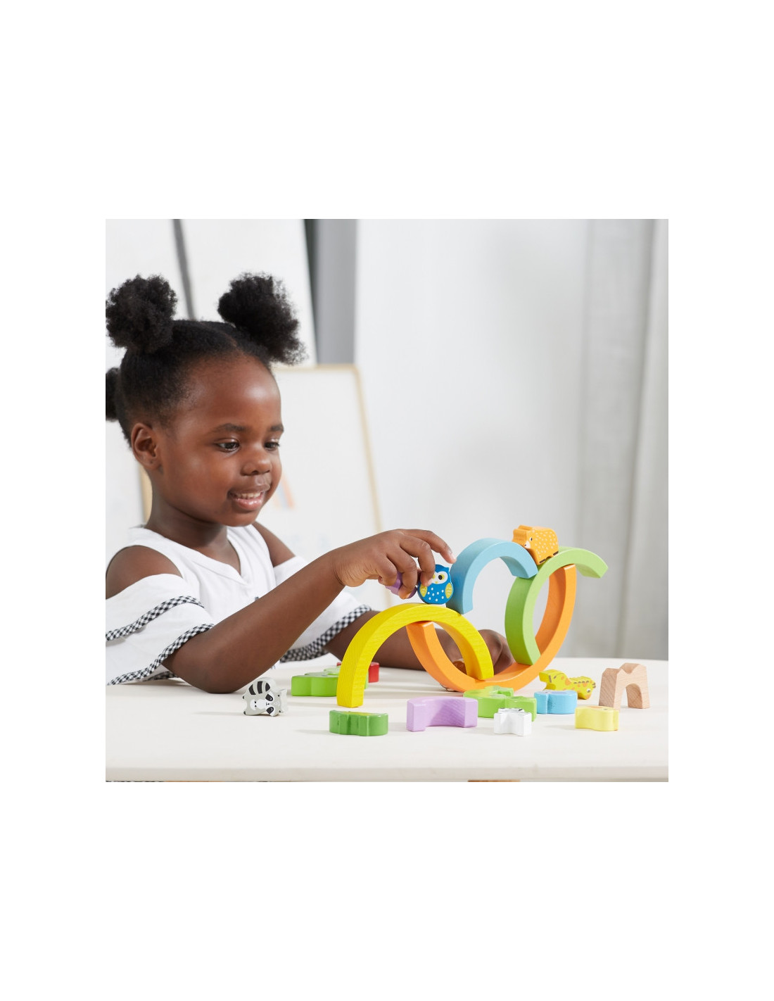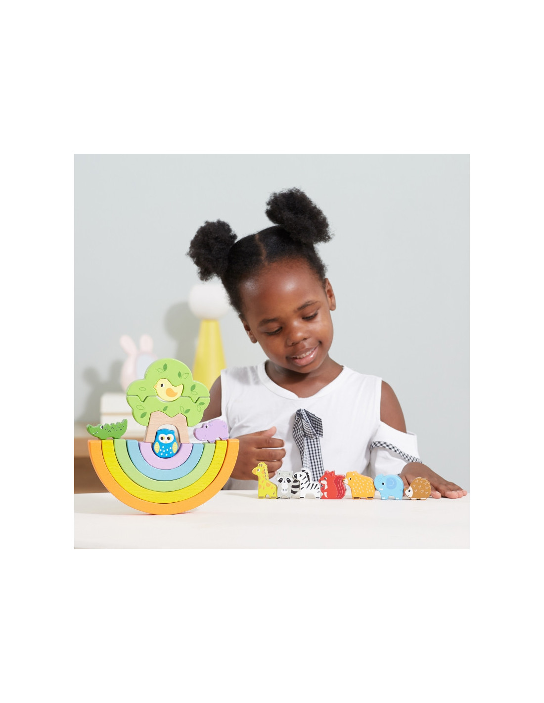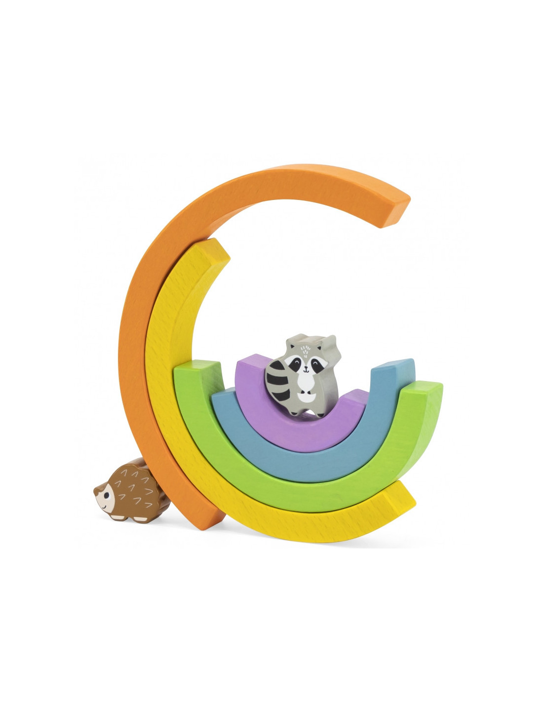 - - zestaw składa się z 5 kolorowych łuków, 11 zwierzątek oraz 3 klocków, z których powstaje drzewko,