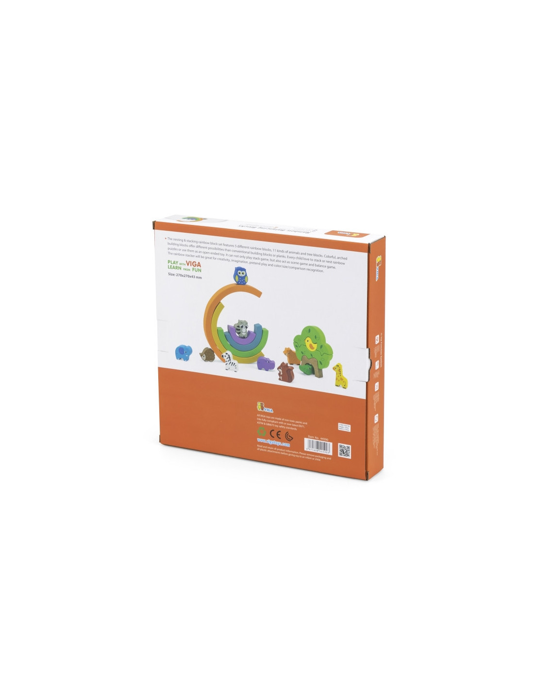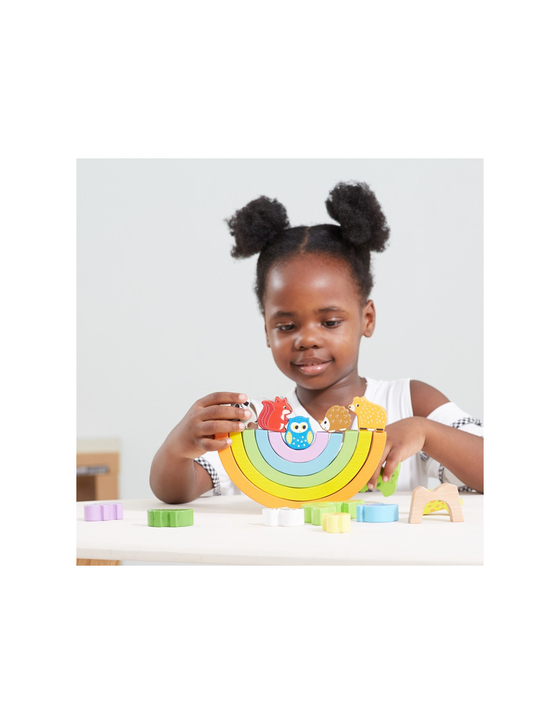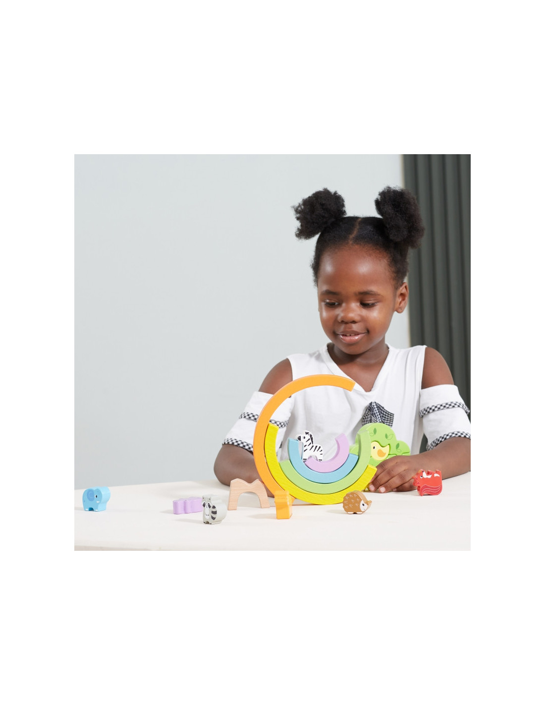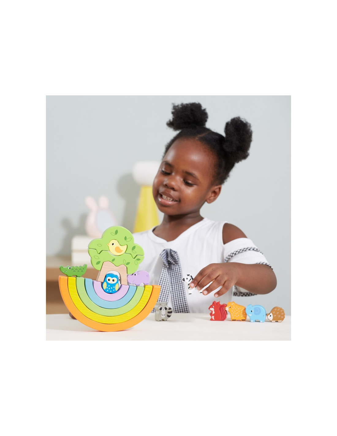 - - zestaw składa się z 5 kolorowych łuków, 11 zwierzątek oraz 3 klocków, z których powstaje drzewko,