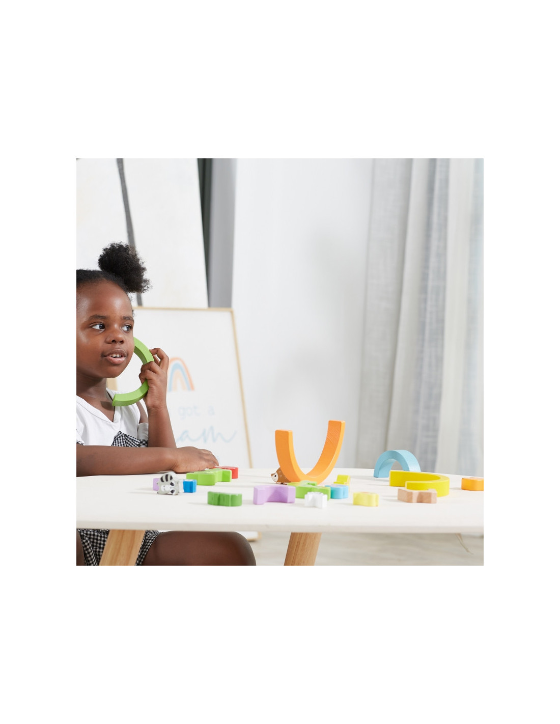 Drewniana Tęcza rozbudzi już od samego początku wyobraźnię dziecka. Dziecko może ustawić z klocków tęczę, odkryć w jakiej kolejności układają się kolory. Te kolorowe łuki kryją w sobie znacznie więcej możliwości zabawy. Można stworzyć z nich barwny tunel, ustawiać jedna na drugich. Dzięki dołączonym do zestawu zwierzątkom, dziecko może budować im z łuków domki, ustawiać przeszkody, które mogą pokonać. To idealna zabawka na odgrywanie różnych scenek.