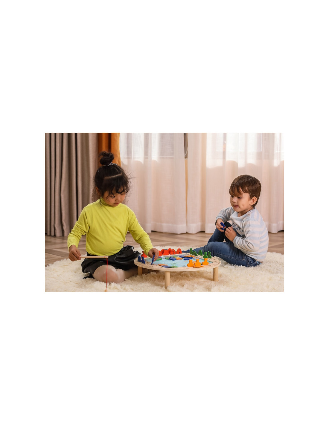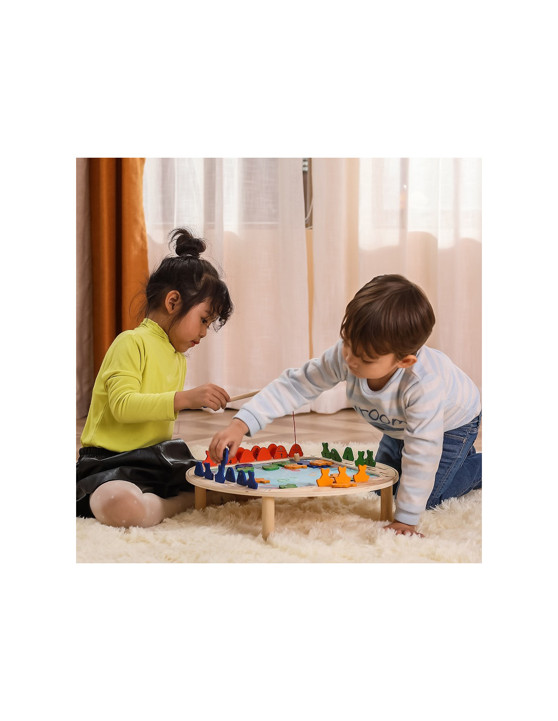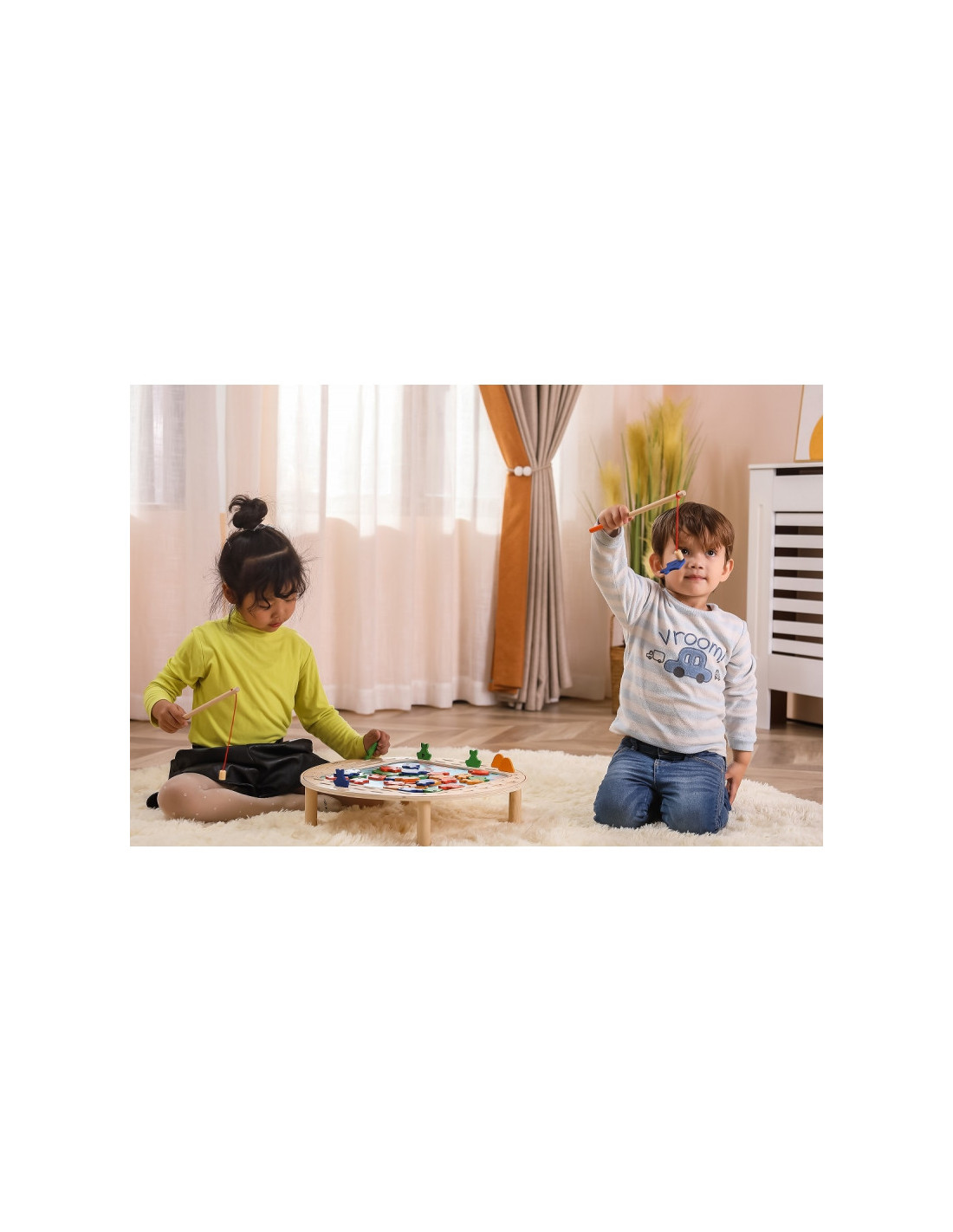 - - zabawka zawiera - drewniany stół do gry, 4 wędki oraz 40 rybek,
