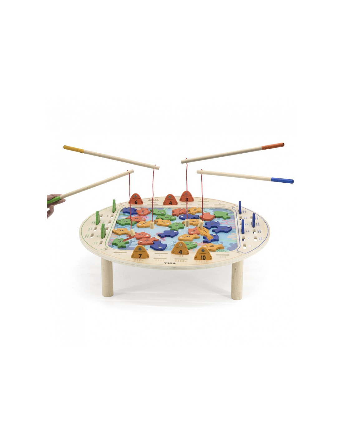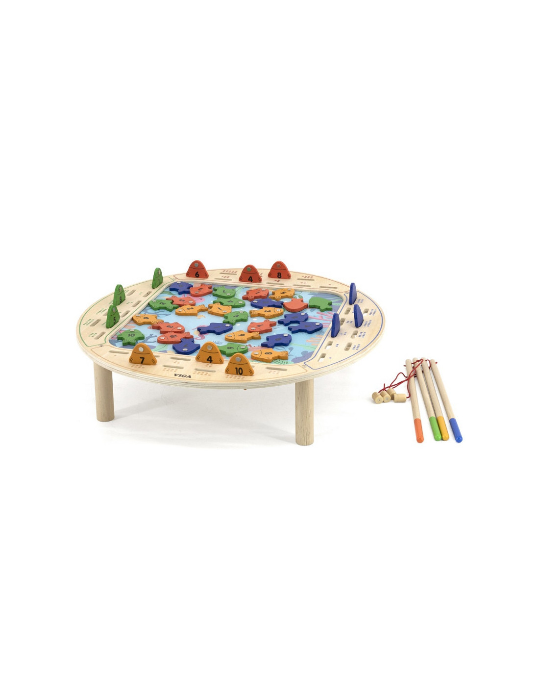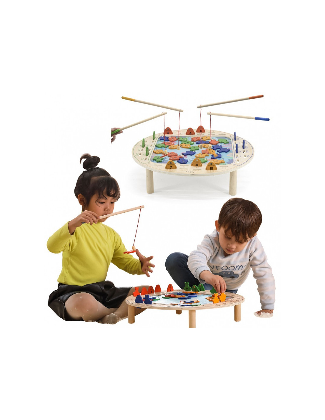 - - zabawka zawiera - drewniany stół do gry, 4 wędki oraz 40 rybek,