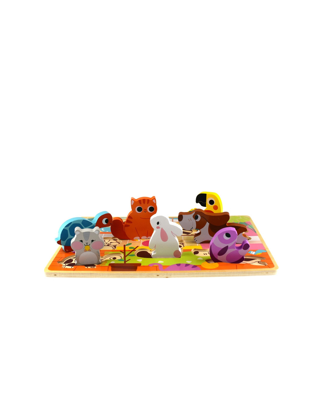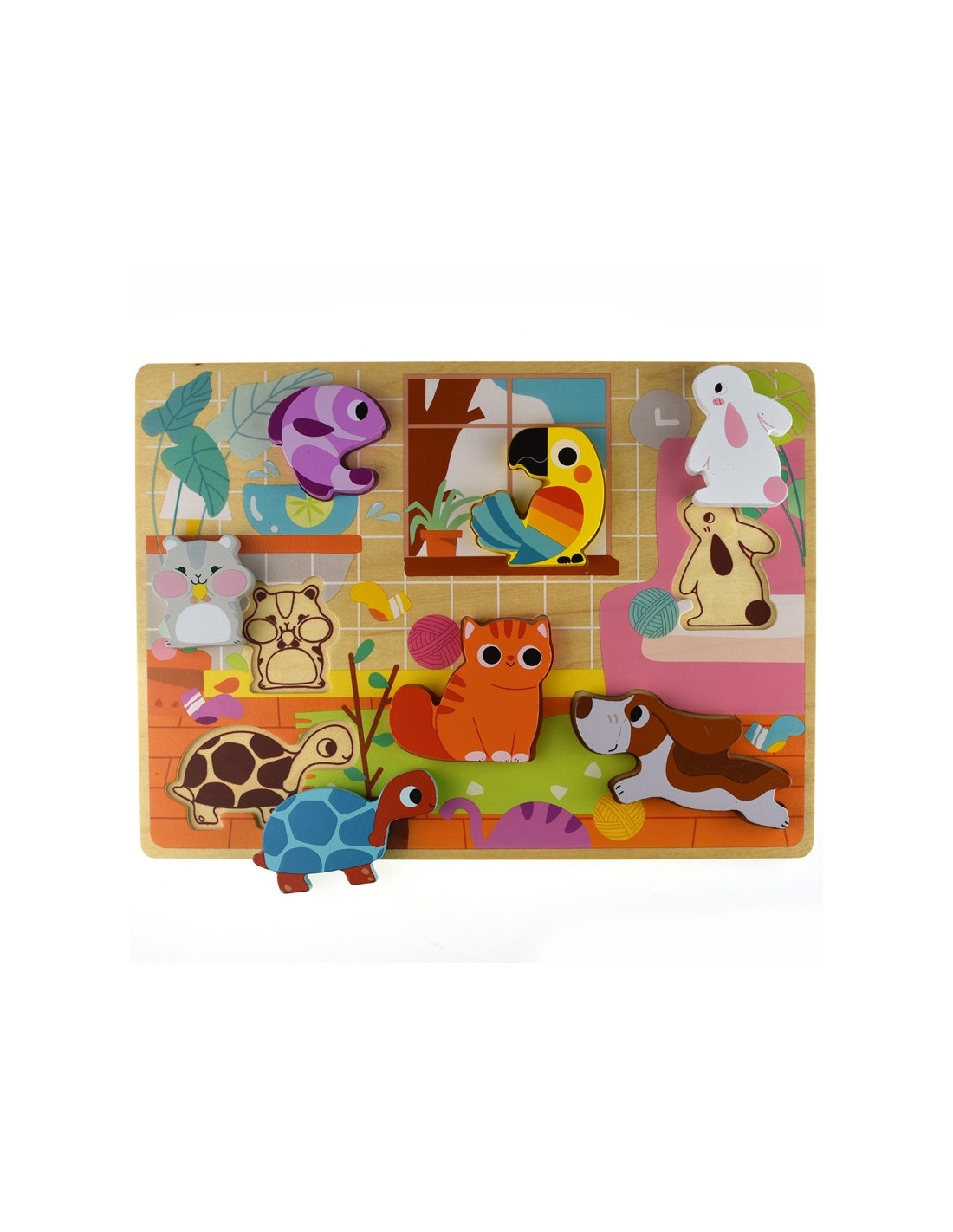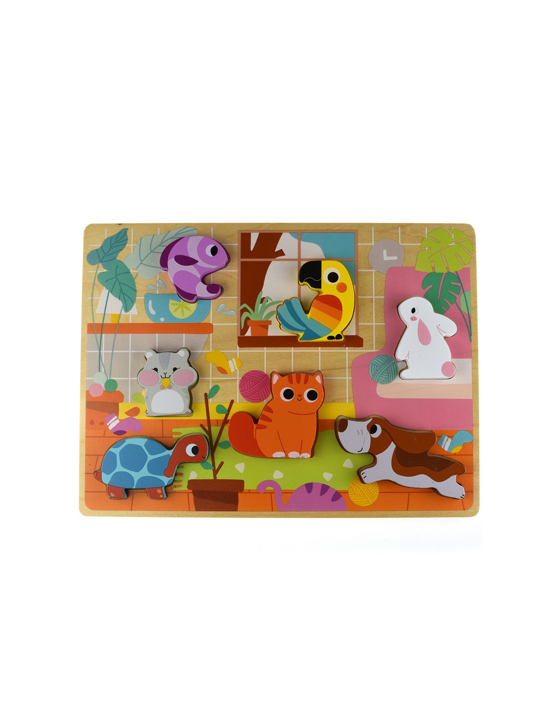 - - zestaw zawiera: tablicę z wgłębieniami i 7 elementów przedstawiających zwierzątka w domu,