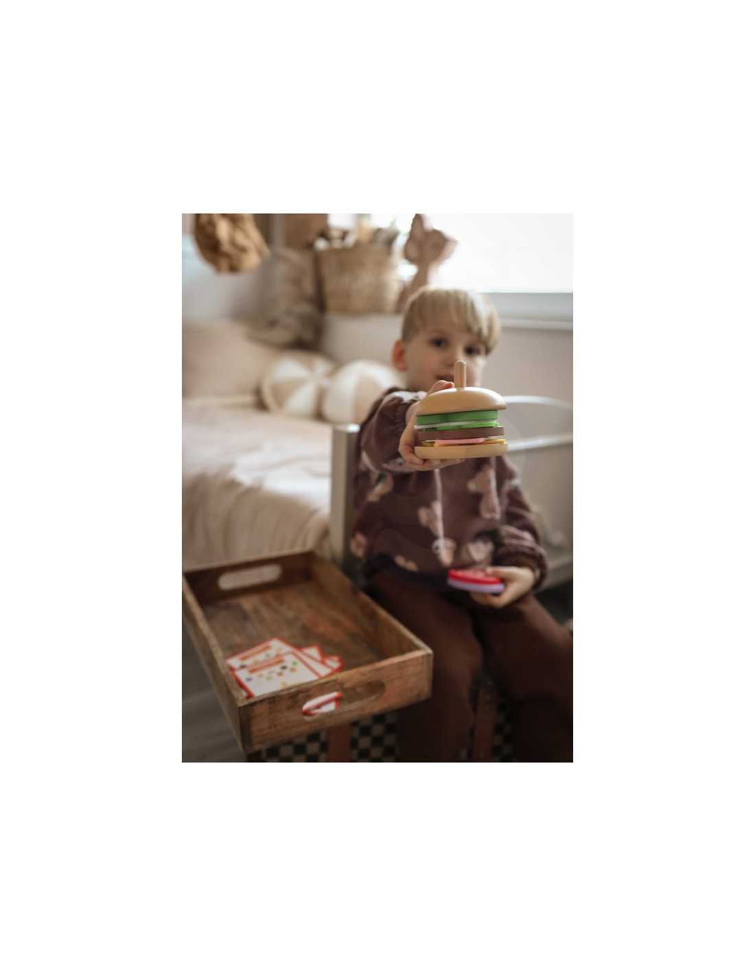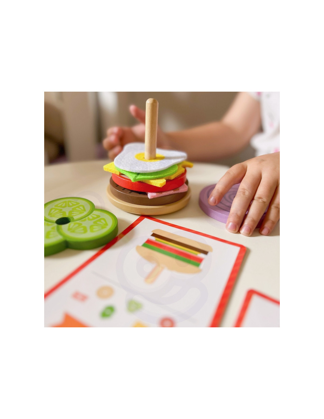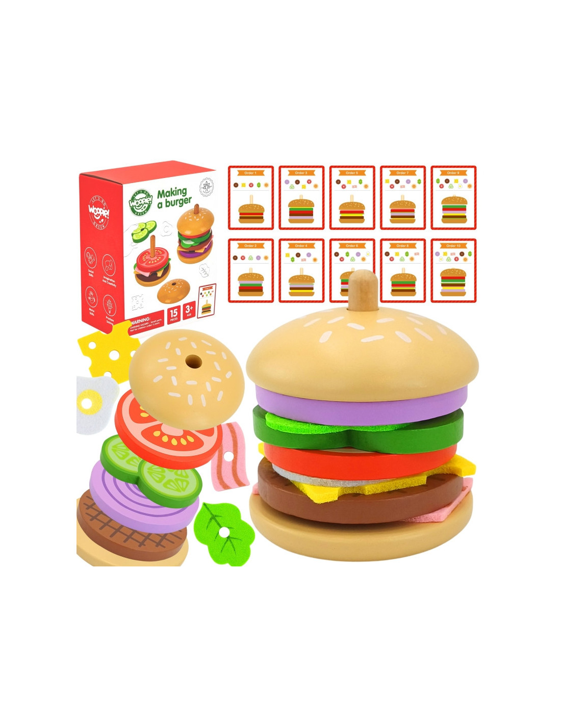 Drewniany Burger od marki WOOPIE GREEN to smakowita porcja edukacyjnej zabawy dla każdego małego kucharza! Zestaw pozwala dzieciom odtwarzać wzory burgerów z kart lub tworzyć własne kompozycje. Dzięki kolorowym składnikom i kartom z ilustracjami maluchy uczą się logicznego myślenia, rozwijają koncentrację, kreatywność oraz pamięć. Dodatkową atrakcją jest możliwość odgrywania ról – dziecko może wcielić się w rolę kucharza i serwować pyszne dania swoim gościom!
