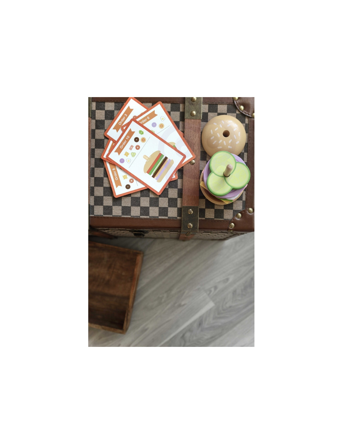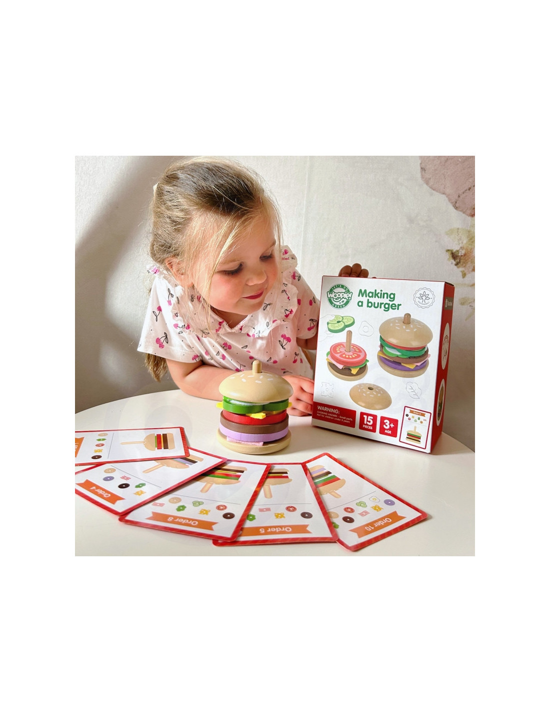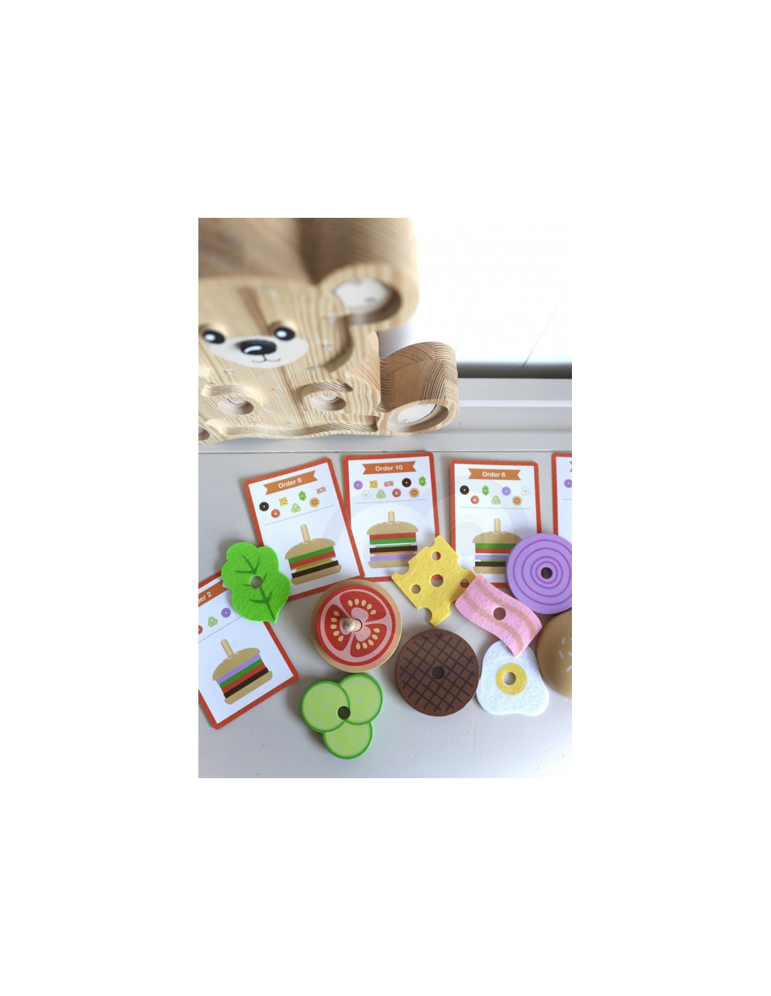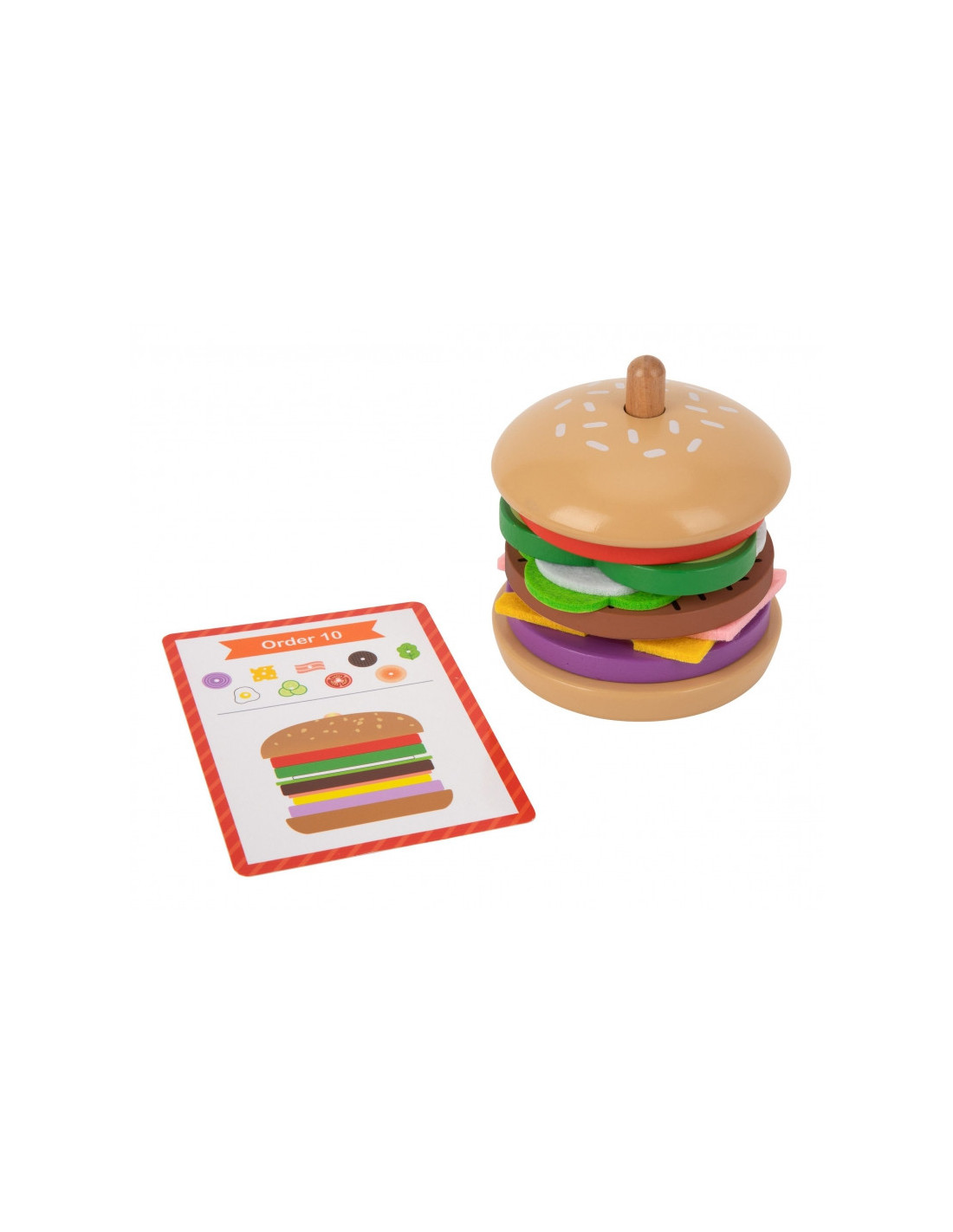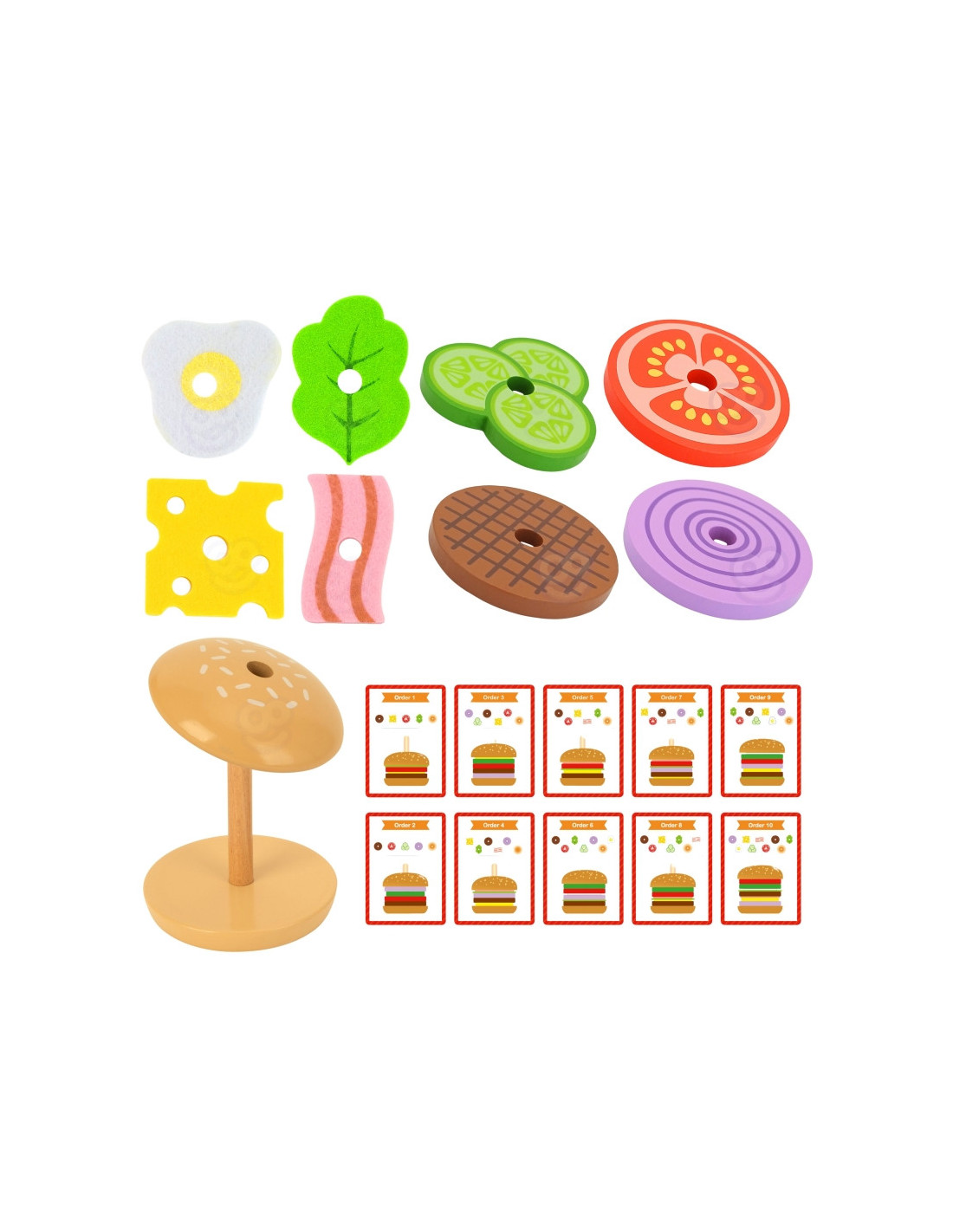 - - zestaw zawiera 15 elementów: 2 bułki, 8 składników burgera, 5 kart z 10 wzorami