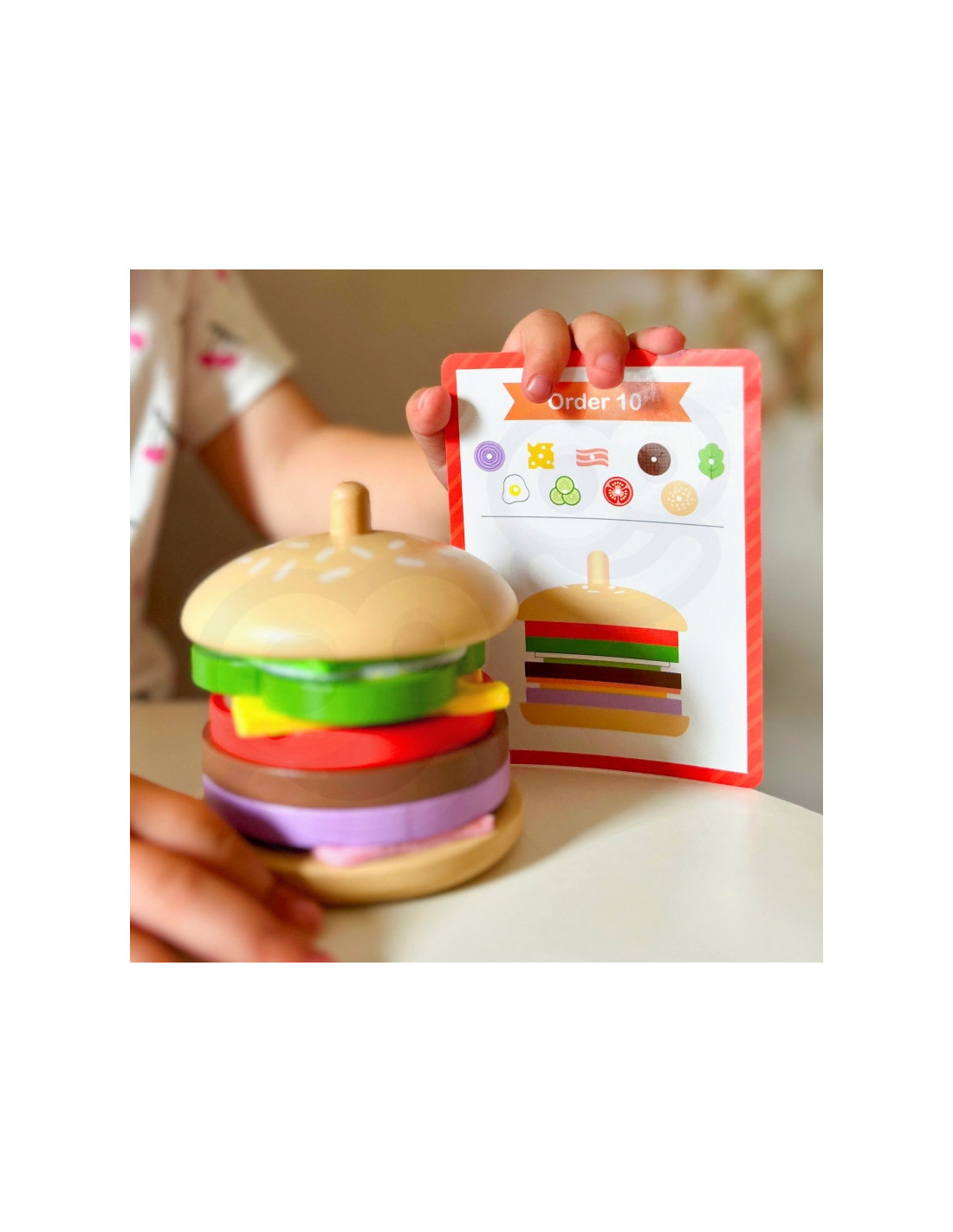 Dziecko wybiera potrzebne składniki, a następnie patrząc na grubość i kolor układa składniki zgodnie z kolejnością. Zabawę można urozmaicić o grę w zapamiętywanie i odtwarzanie z pamięci obrazka przez malucha. Można również zakryć na karcie składniki, a dziecko na podstawie samego wyglądu może dobrać potrzebne składniki i ułożyć hamburgera. Dziecko może również wymyślić swój własny wygląd burgera - ogranicza tylko kreatywność i wyobraźnia