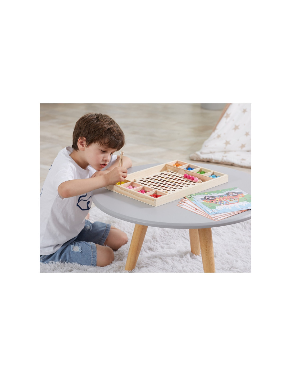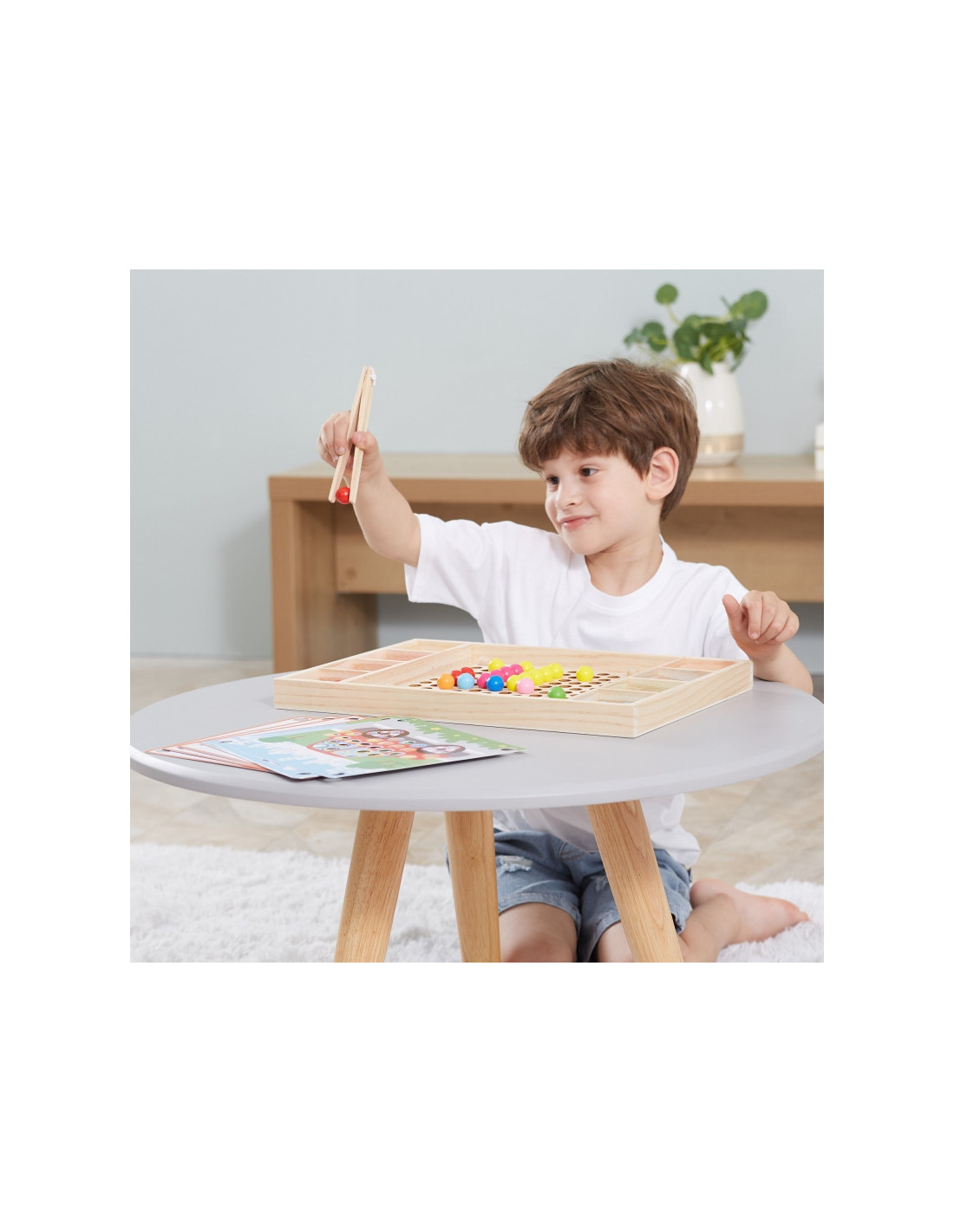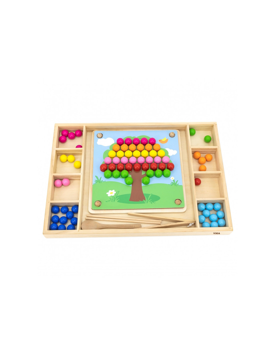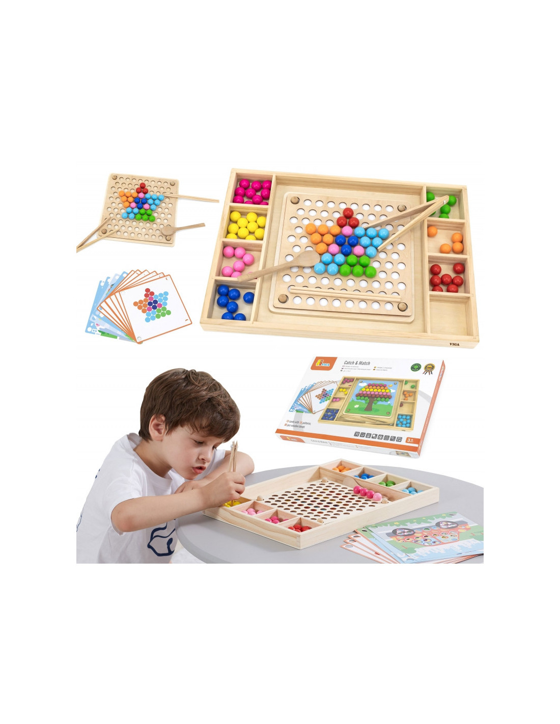 Drewniana gra "Złap i dopasuj" marki Viga. Zadanie dzieci jest nie tylko dopasowywać kolory według wzoru na papierze, ale także tworzyć więcej wzorów dzięki swojej wyobraźni. Ta gra może ćwiczyć koordynację ręka-oko i koncentrację dziecka. Dzieci mogą przymocować ulubiony papier do drewnianej tacy. Za pomocą pałeczek, łyżki lub spinacza przyczepić kulki do otworów na desce według wzorów i kolorów, a na koniec ułożyć je w piękny obrazek.