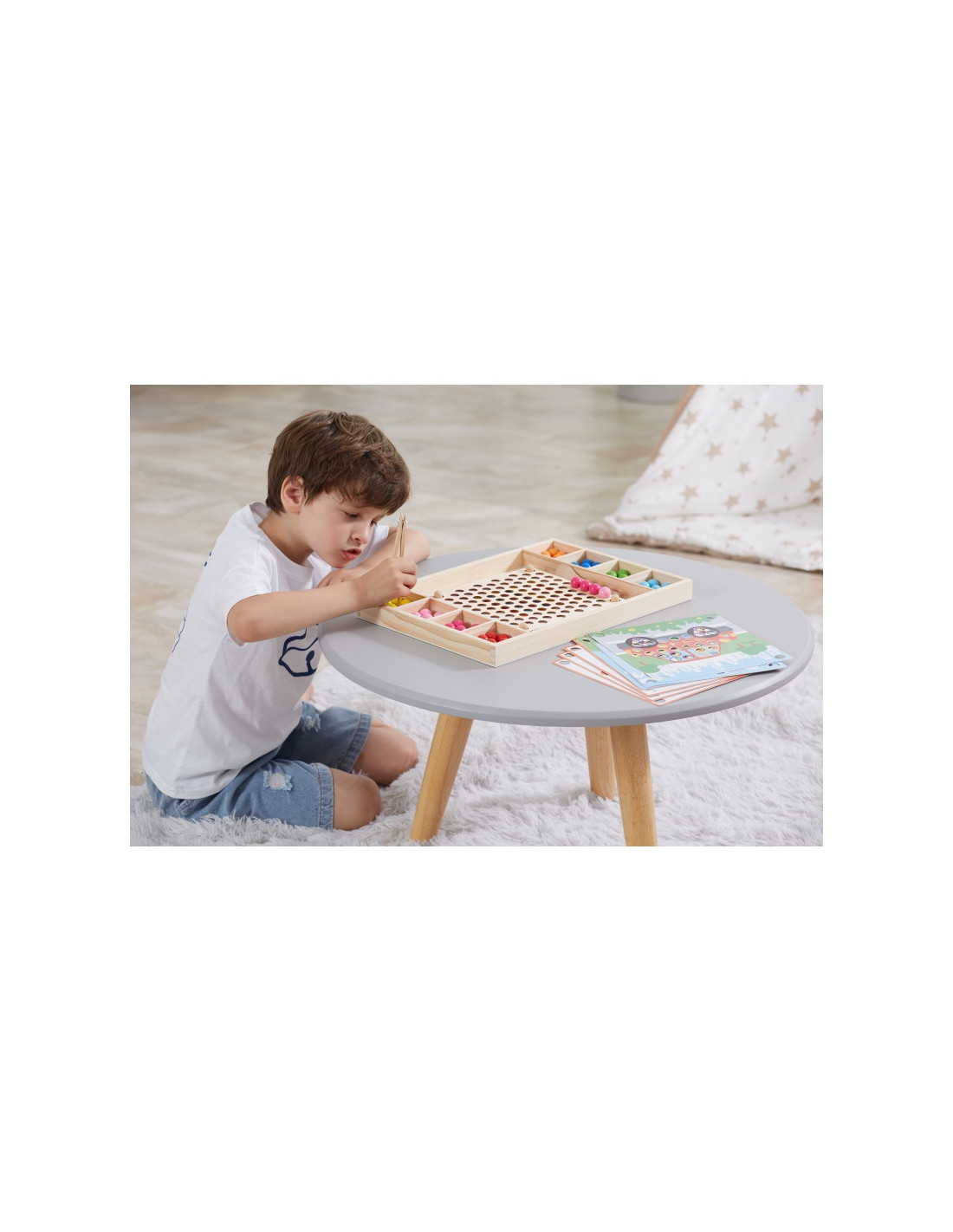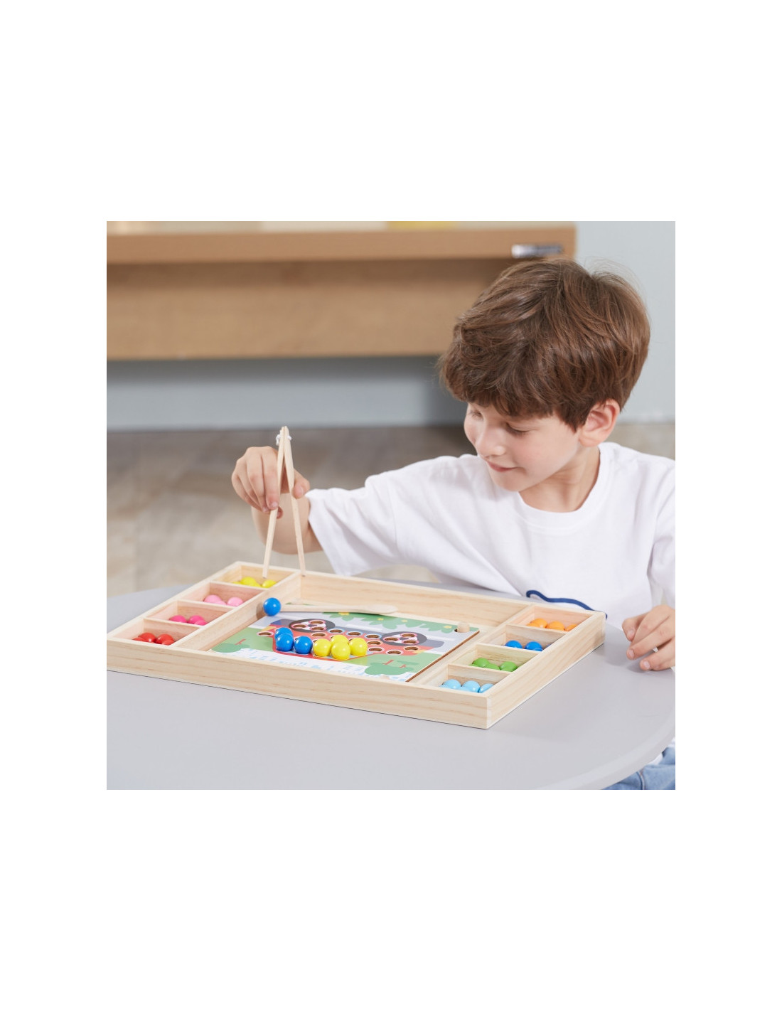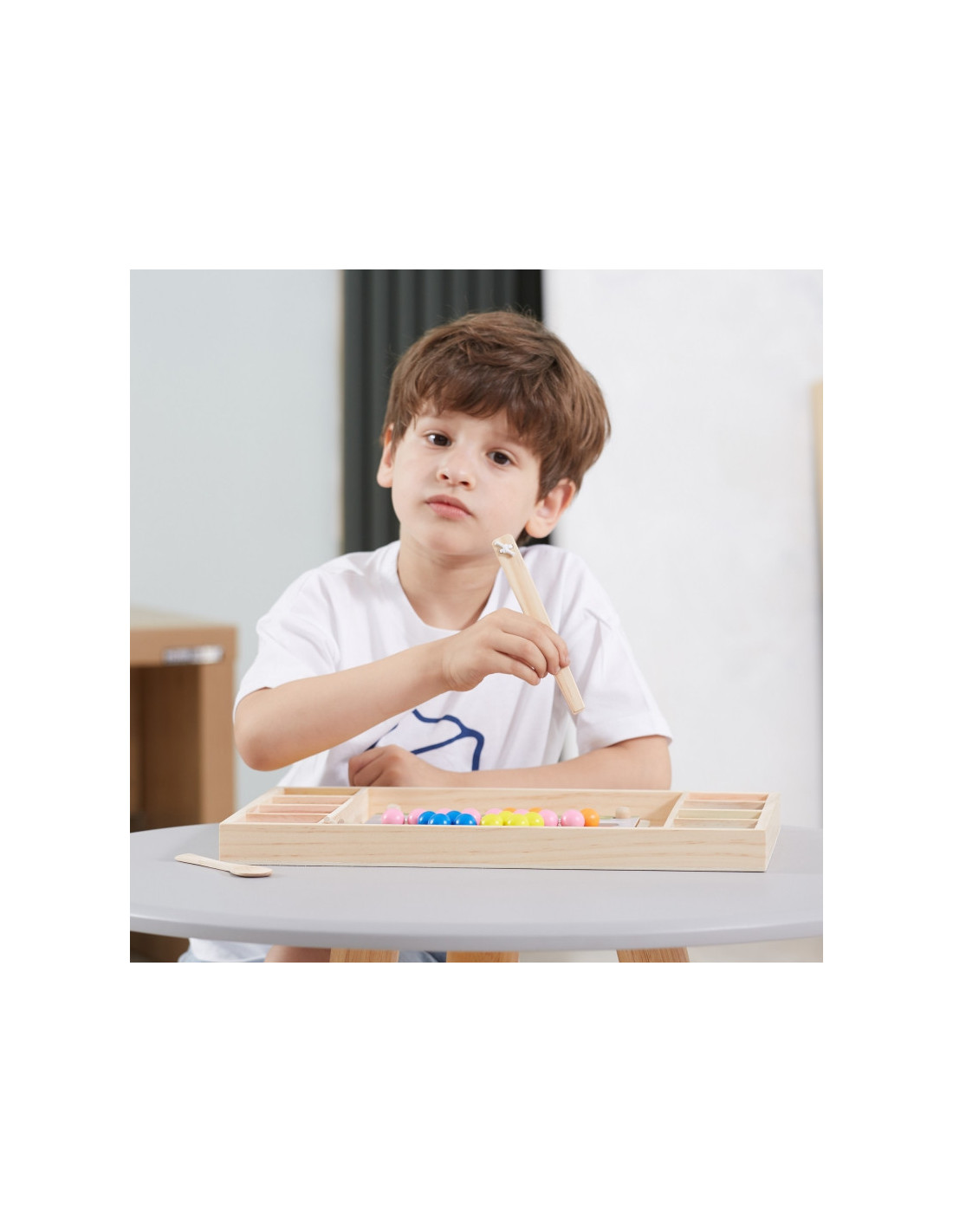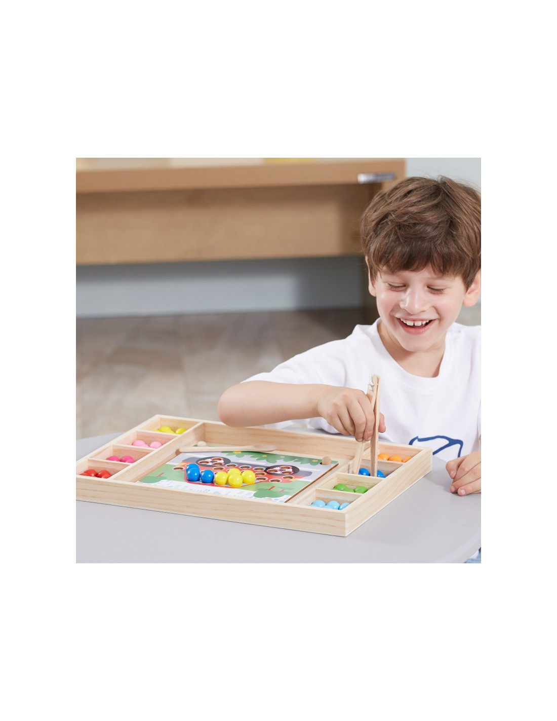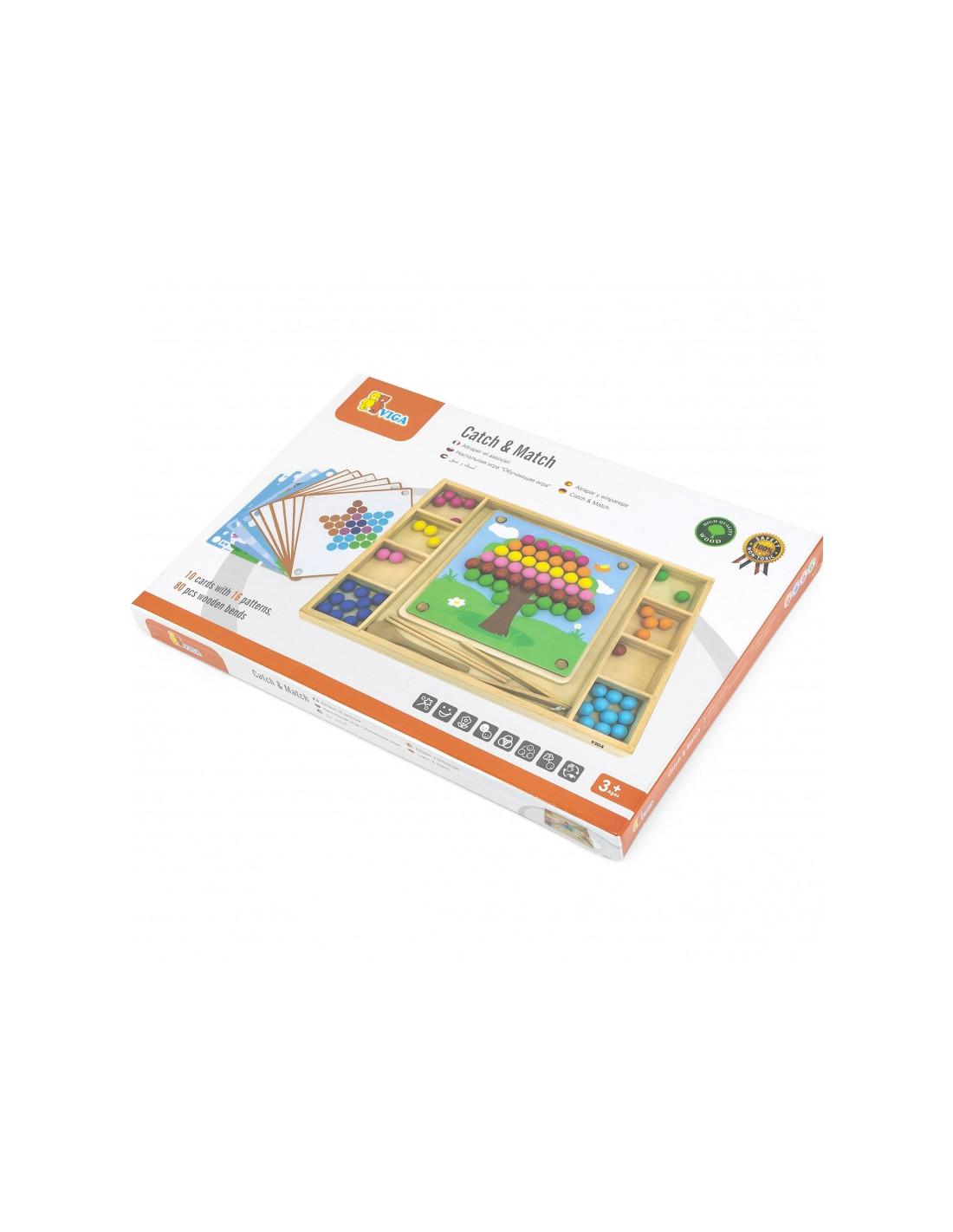 Drewniana gra "Złap i dopasuj" marki Viga. Zadanie dzieci jest nie tylko dopasowywać kolory według wzoru na papierze, ale także tworzyć więcej wzorów dzięki swojej wyobraźni. Ta gra może ćwiczyć koordynację ręka-oko i koncentrację dziecka. Dzieci mogą przymocować ulubiony papier do drewnianej tacy. Za pomocą pałeczek, łyżki lub spinacza przyczepić kulki do otworów na desce według wzorów i kolorów, a na koniec ułożyć je w piękny obrazek.