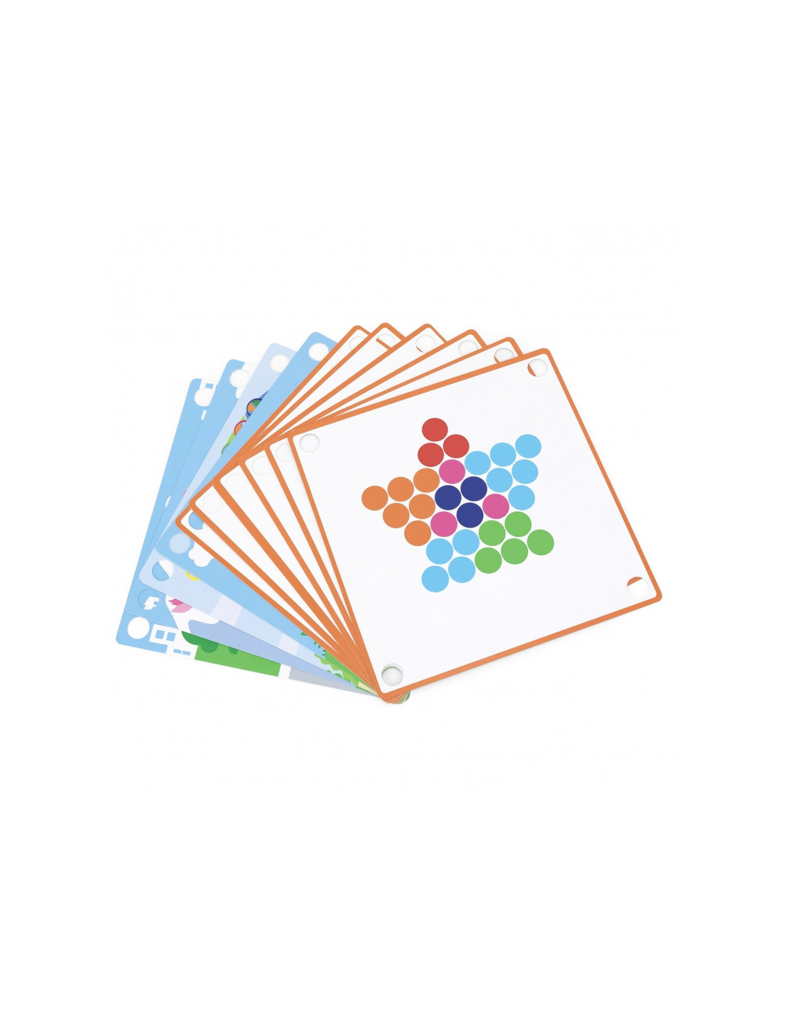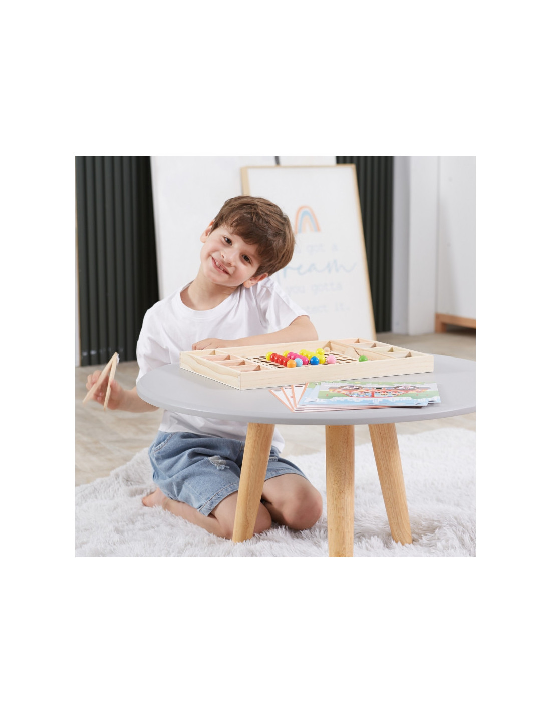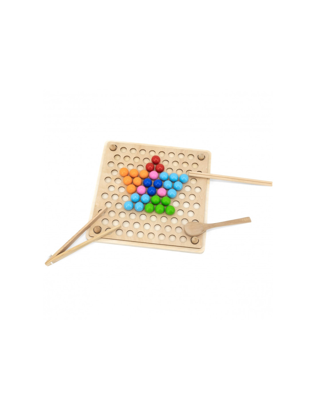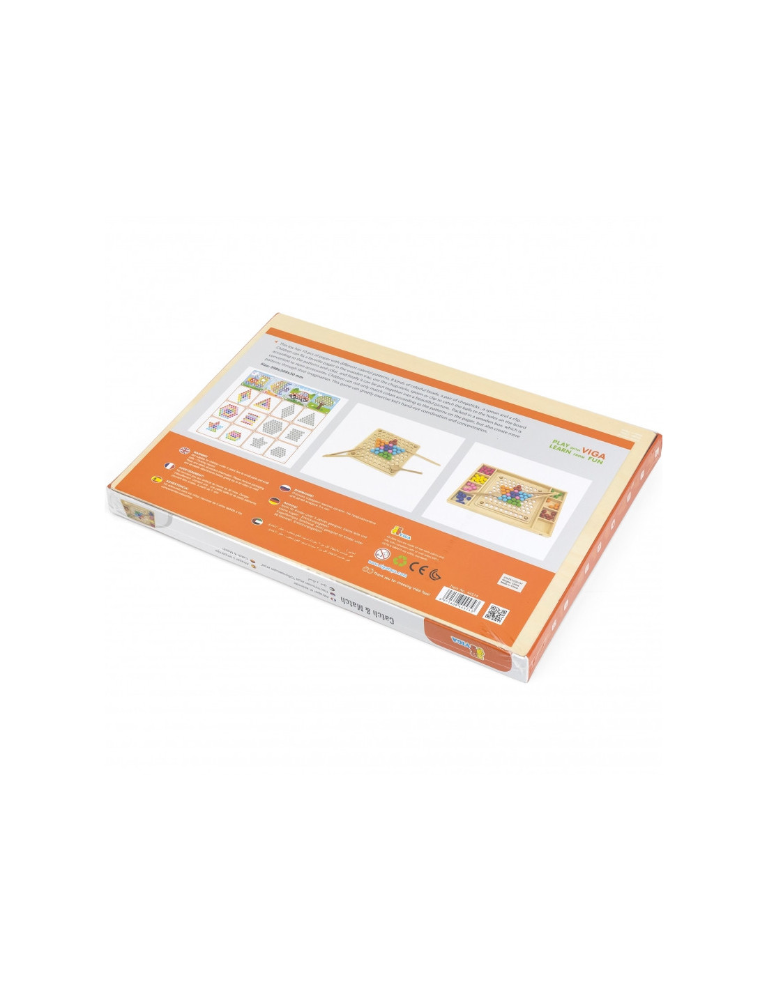 Drewniana gra "Złap i dopasuj" marki Viga. Zadanie dzieci jest nie tylko dopasowywać kolory według wzoru na papierze, ale także tworzyć więcej wzorów dzięki swojej wyobraźni. Ta gra może ćwiczyć koordynację ręka-oko i koncentrację dziecka. Dzieci mogą przymocować ulubiony papier do drewnianej tacy. Za pomocą pałeczek, łyżki lub spinacza przyczepić kulki do otworów na desce według wzorów i kolorów, a na koniec ułożyć je w piękny obrazek.