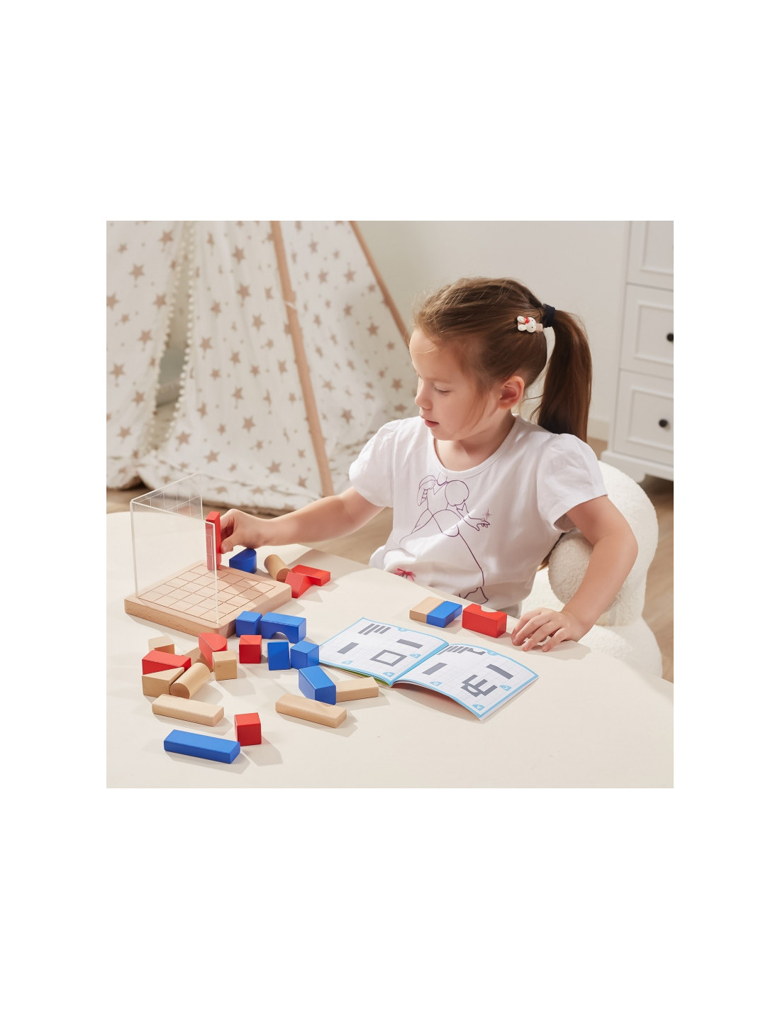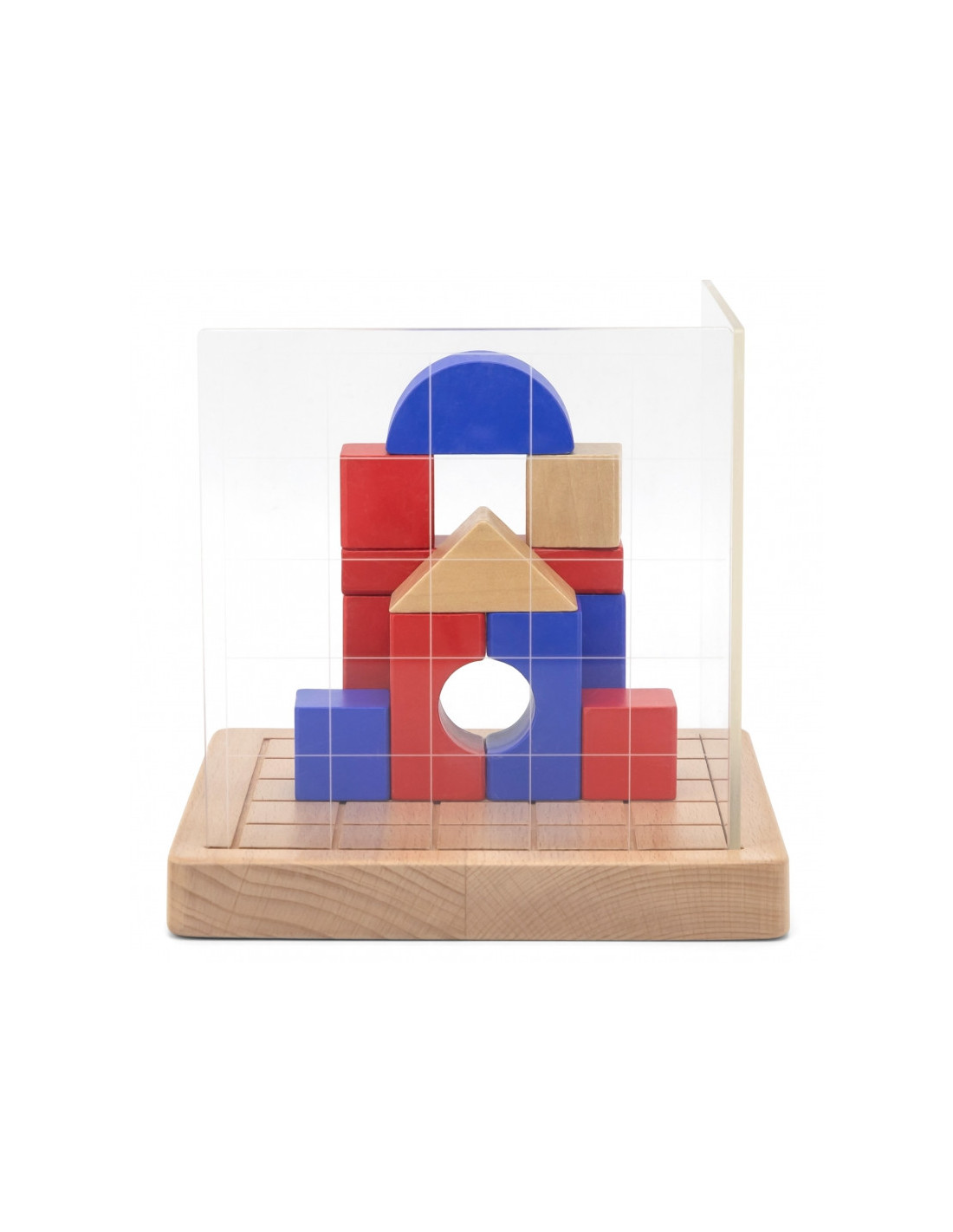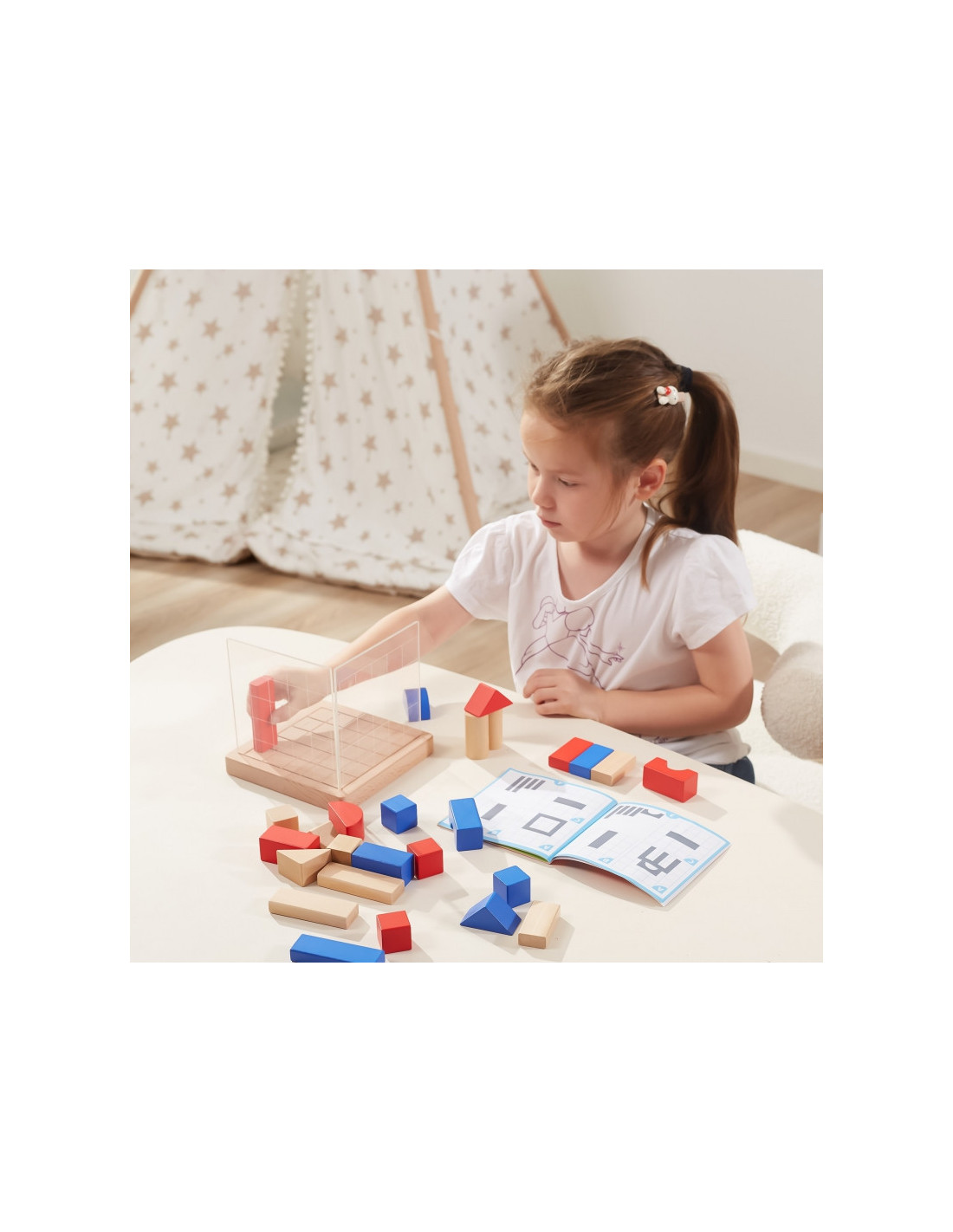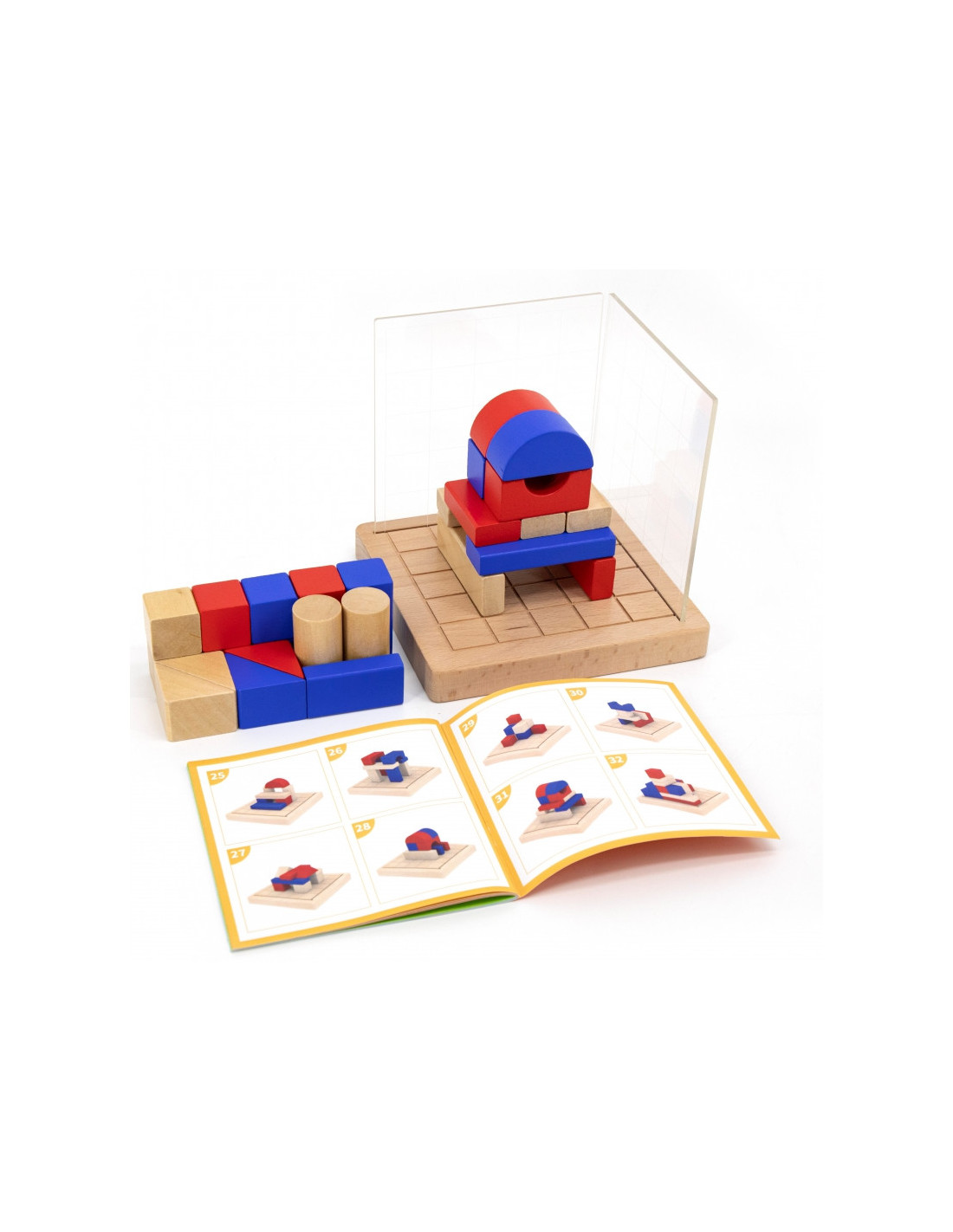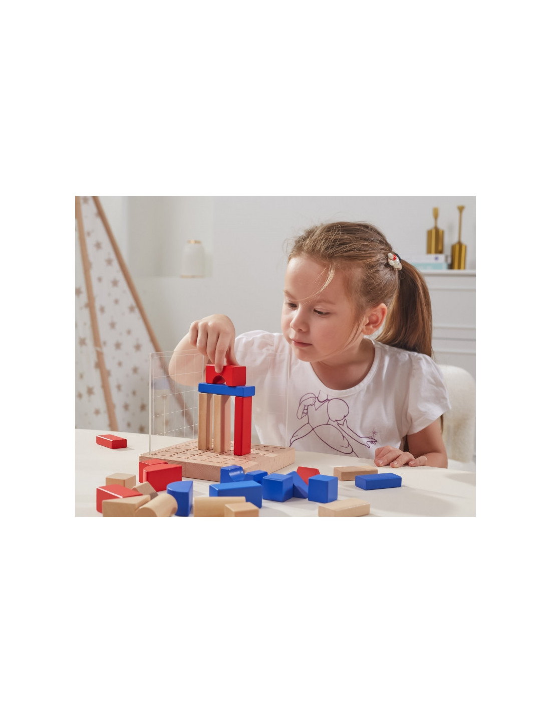 - - zawiera 26 drewnianych klocków, 2 panele akrylowe, 1 podstawkę i 1 książeczkę z 32 propozycjami konstrukcji,
