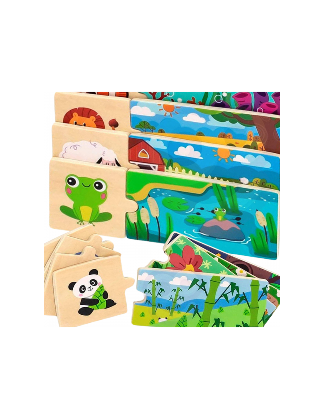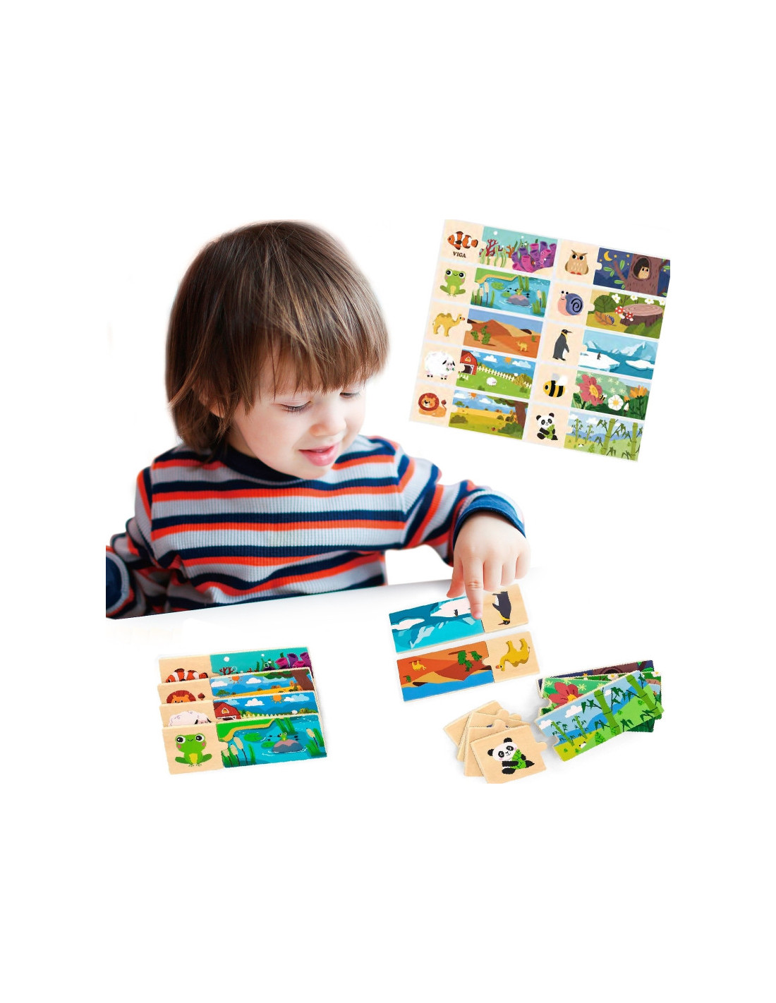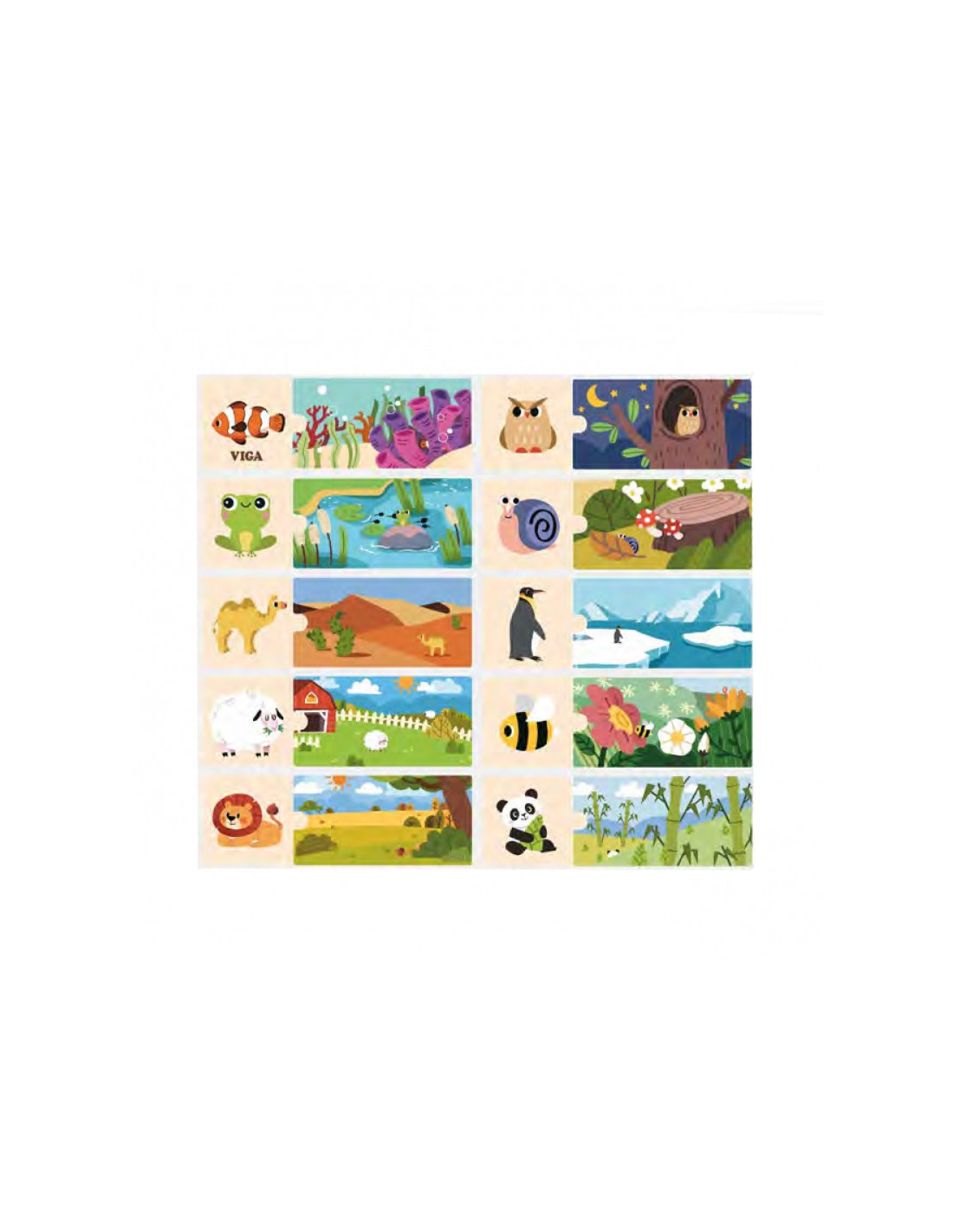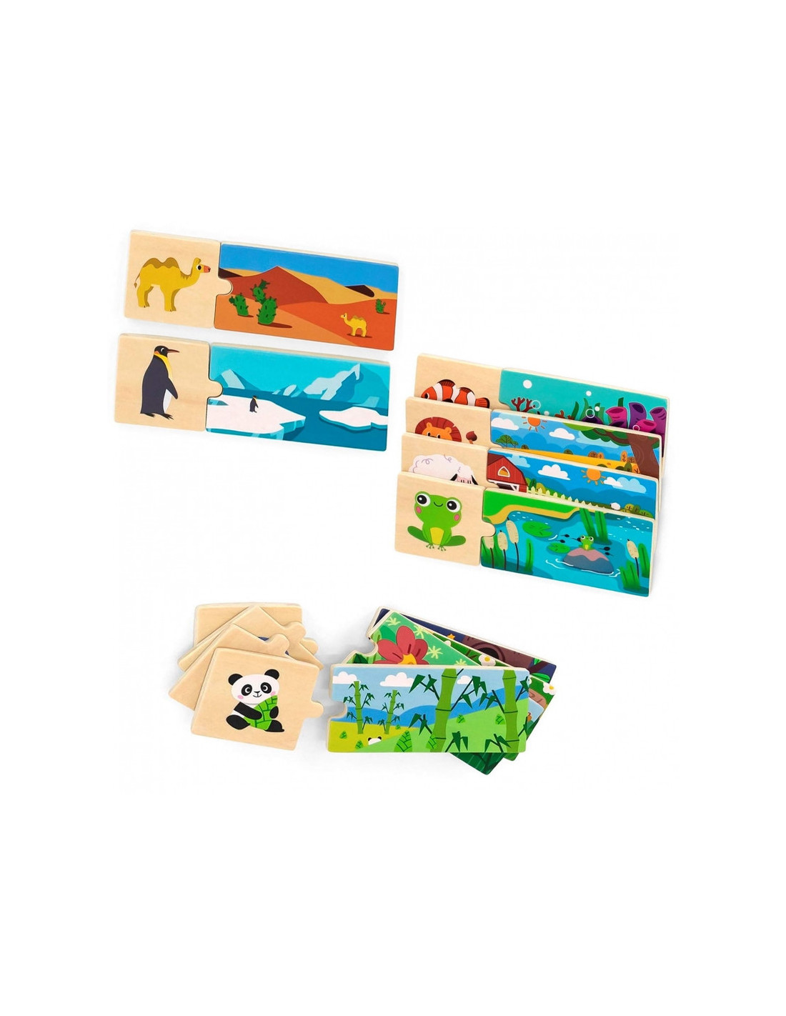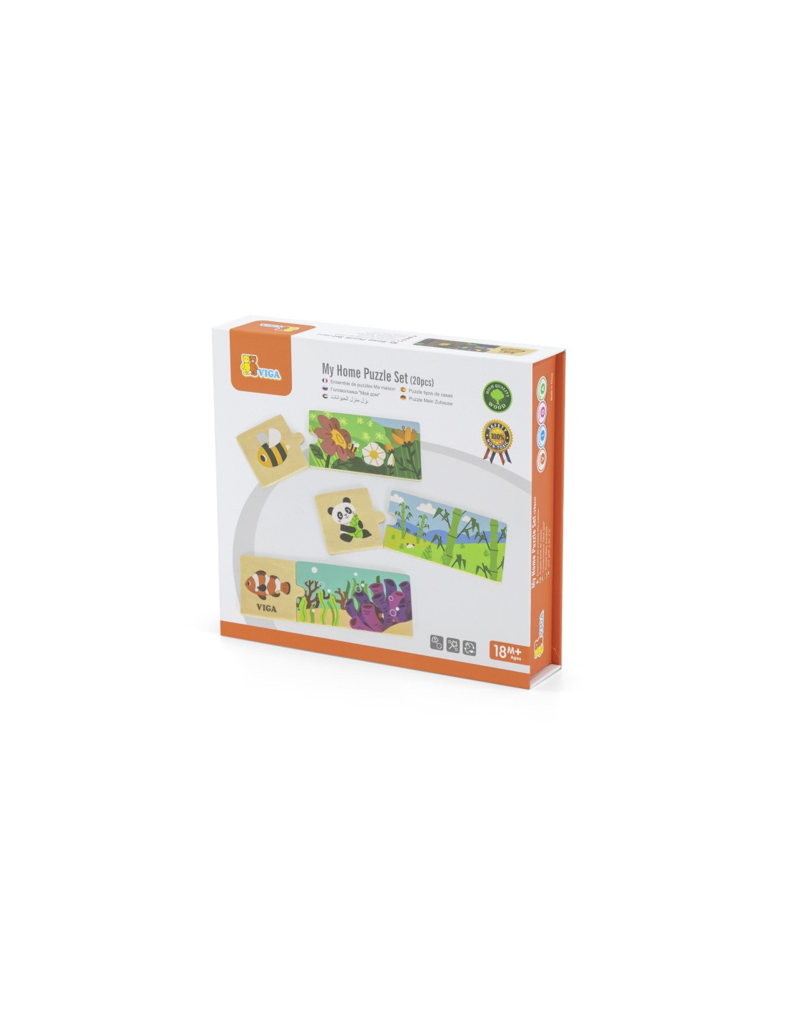 Logiczne puzzle od marki VIGA - zabawa polega na połączeniu puzzli pasujących do siebie. Zestaw składa się z 20 elementów, które trzeba ze sobą połączyć w taki sposób aby dane zwierzątko było przyporządkowane do swojego naturalnego miejsca bytowania. Elementy są bardzo dobrze dopasowane, oraz posiadają kolorowe obrazki.