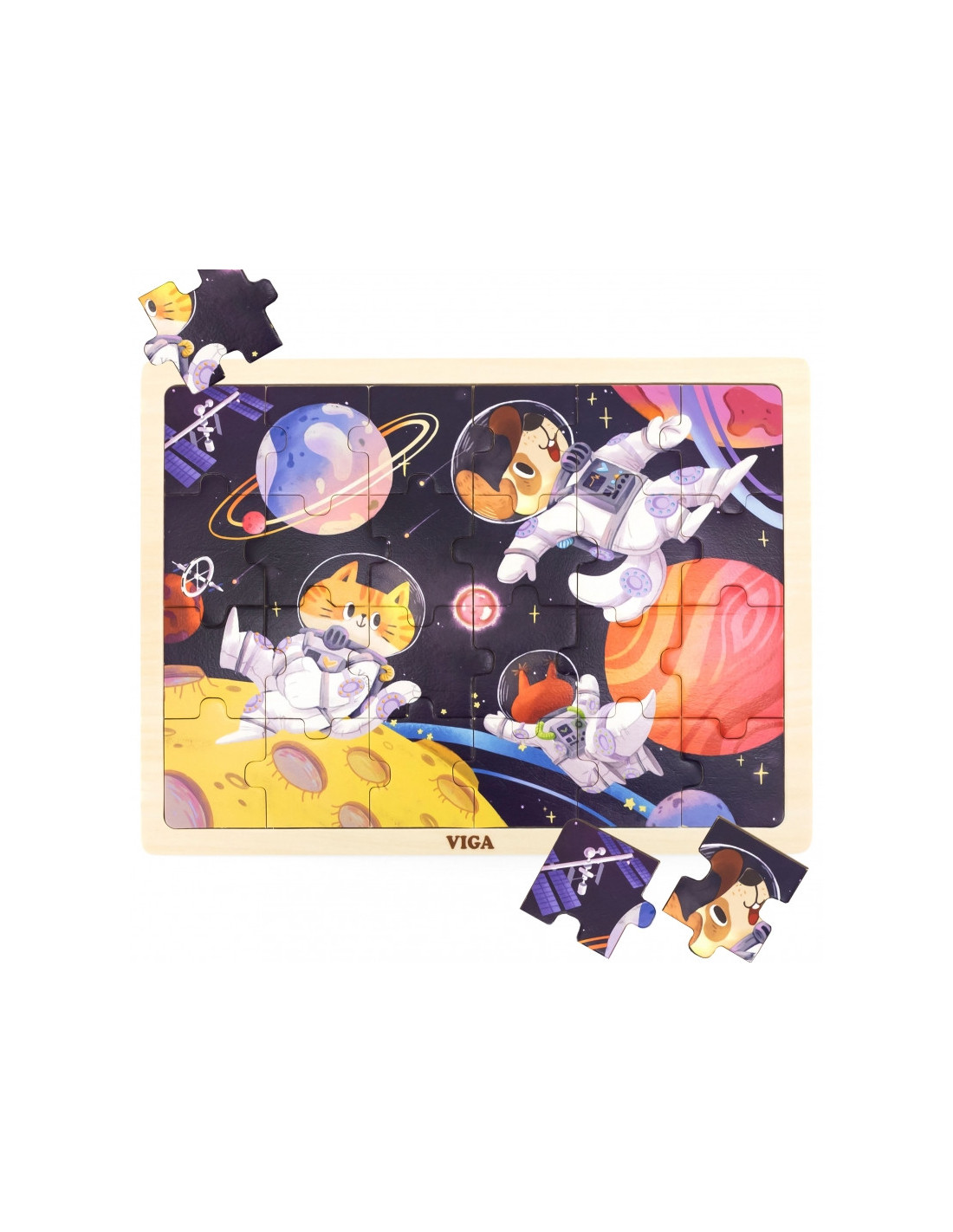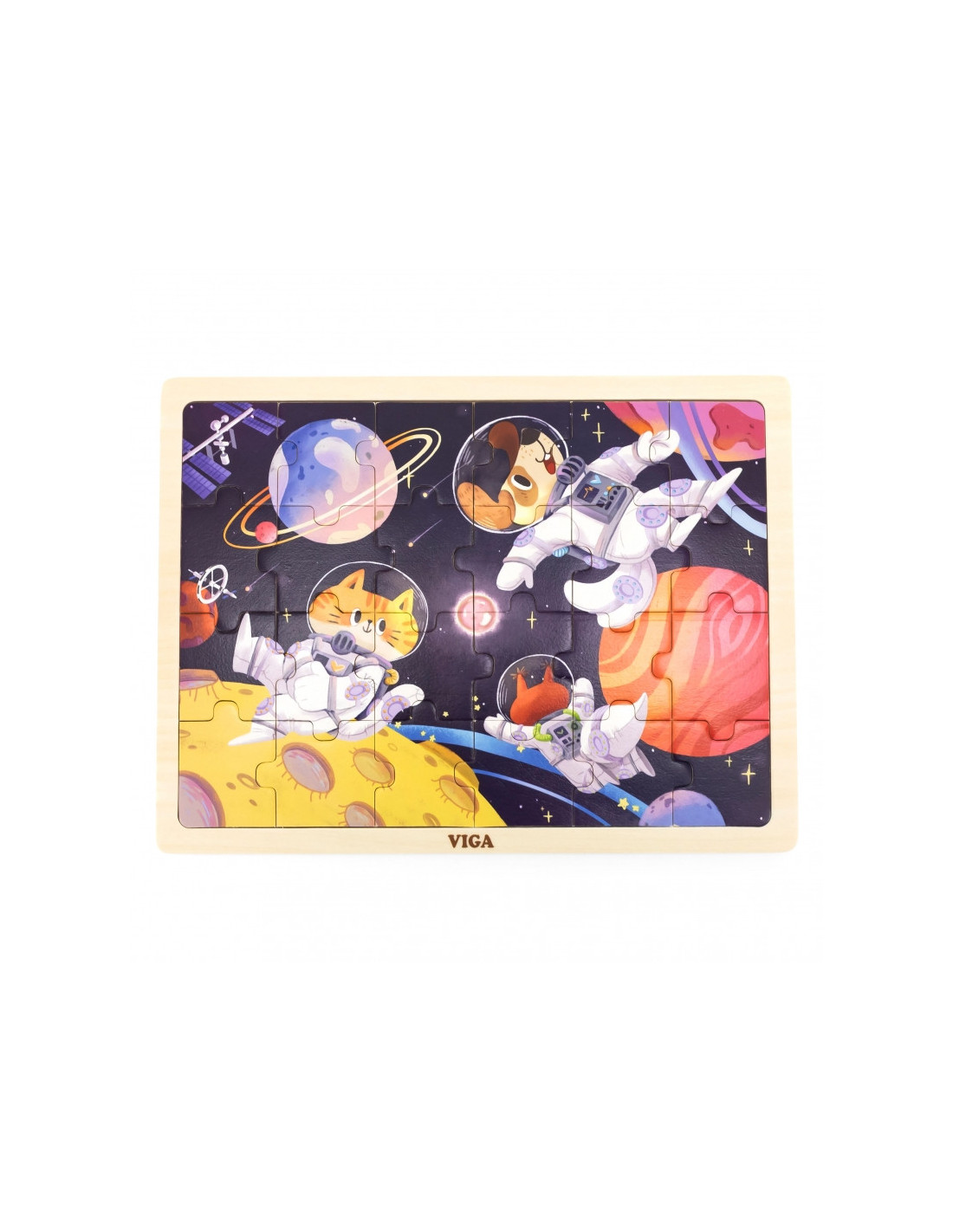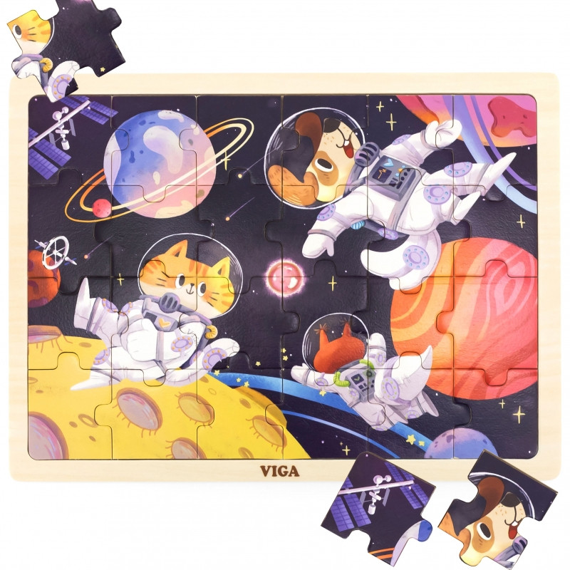 Puzzle Kosmiczna Przygoda od marki VIGA to układanka będąca elementem serii. Wszystkie puzzle z serii znajdują się w drewnianej podstawce, która nie tylko zapewni stabilną powierzchnię do ułożenia puzzli, ale również zawiera obrazek, który dziecko powinno ułożyć. Dodatkową pomocą jak i też elementem, który można wykorzystać do dalszej nauki jest to, że wszystkie elementy układanki są ponumerowane od 1 do 24. Dzięki tym pomocom dziecko nie powinno się zniechęcić przy układaniu. Układanka Kosmiczna Przygoda zawiera obrazek z kosmosem, planetami, gwiazdami, statkami kosmicznymi oraz słodkimi zwierzątkami w strojach astronautów.