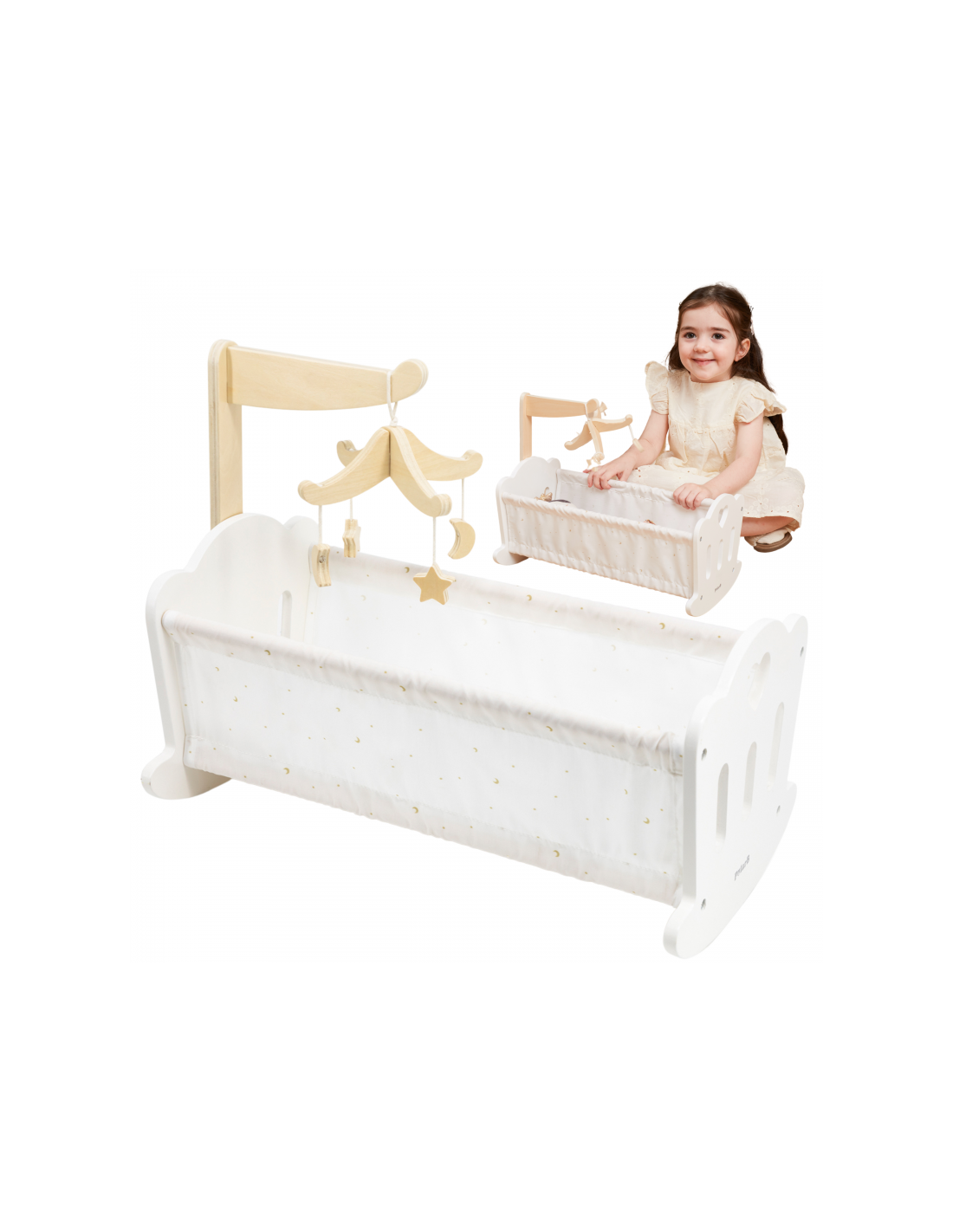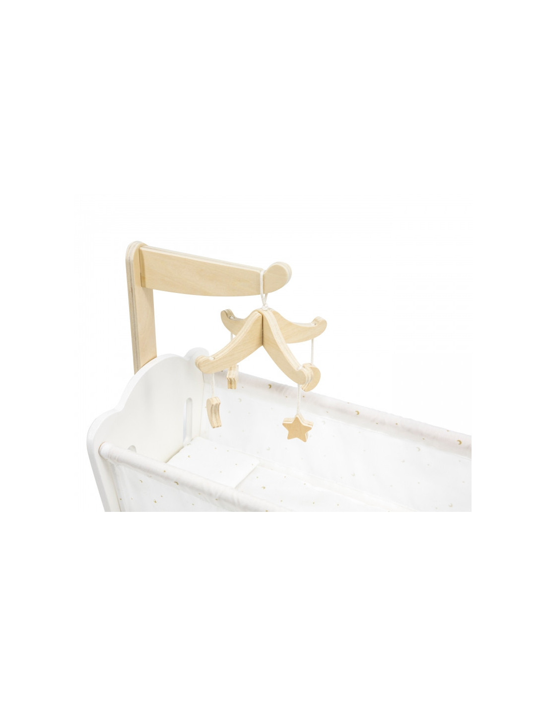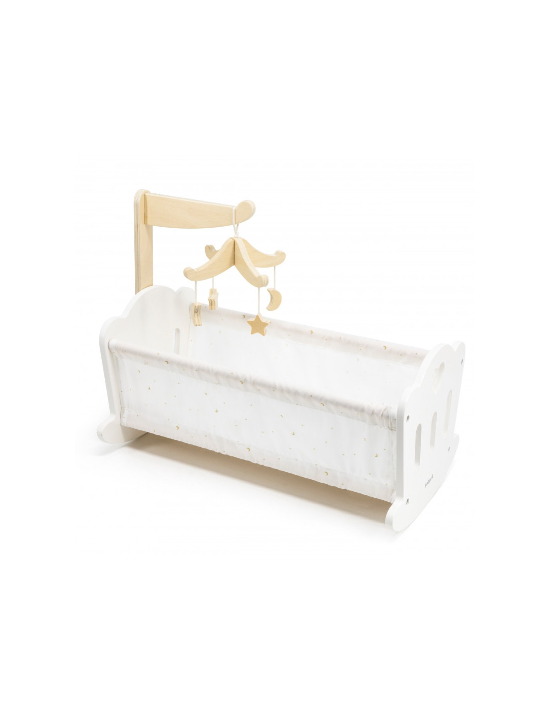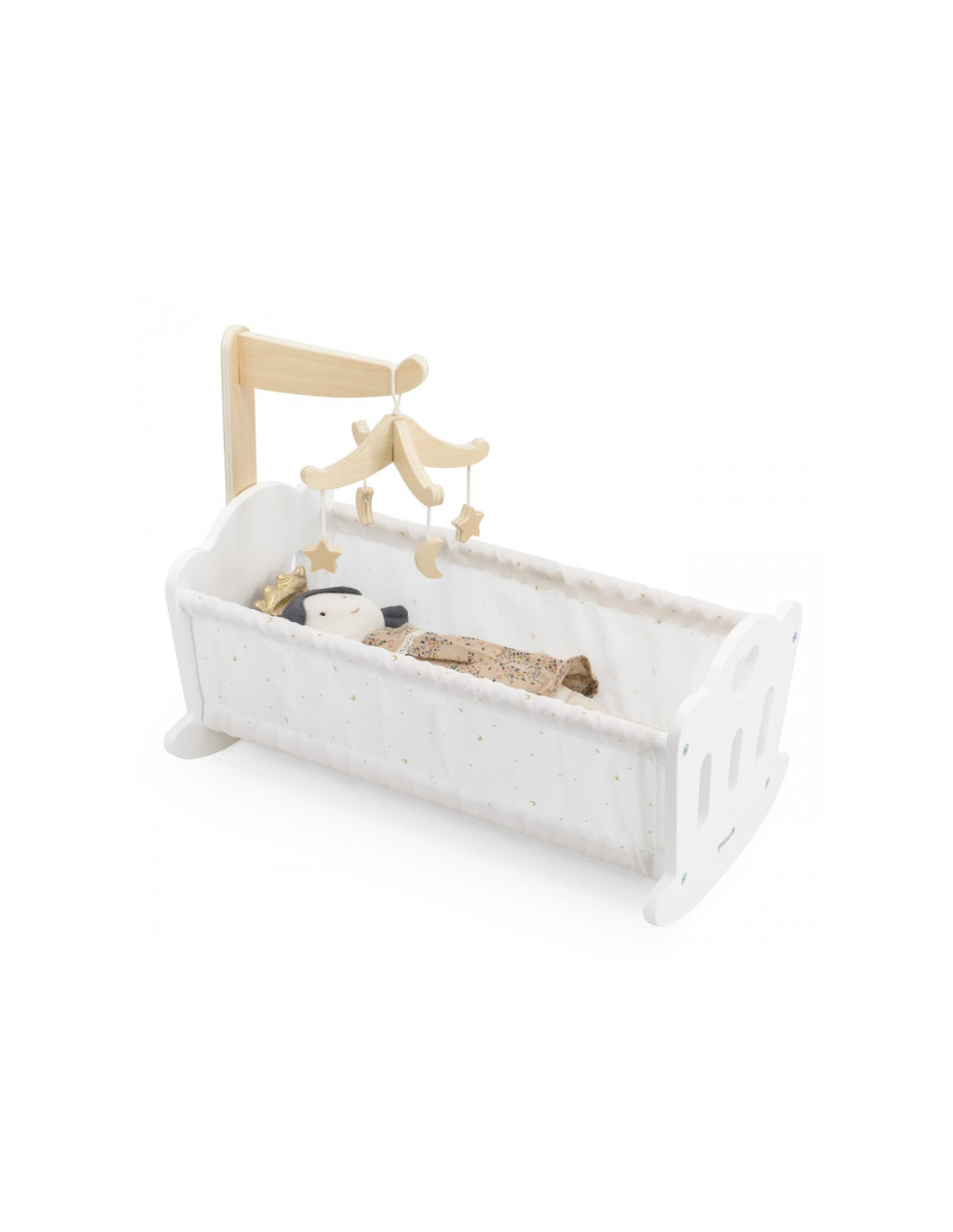 Połóż swoją lalkę do snu w pięknie wykonanej kołysce z serii PolarB marki VIGA. Kołyska posiada miękką bawełnianą poduszkę i kołderkę ze słodkim nadrukiem gwiazd i księżyca oraz uroczą karuzelę do łóżeczka. Pasuje do lalek o wysokości do 38 cm.
