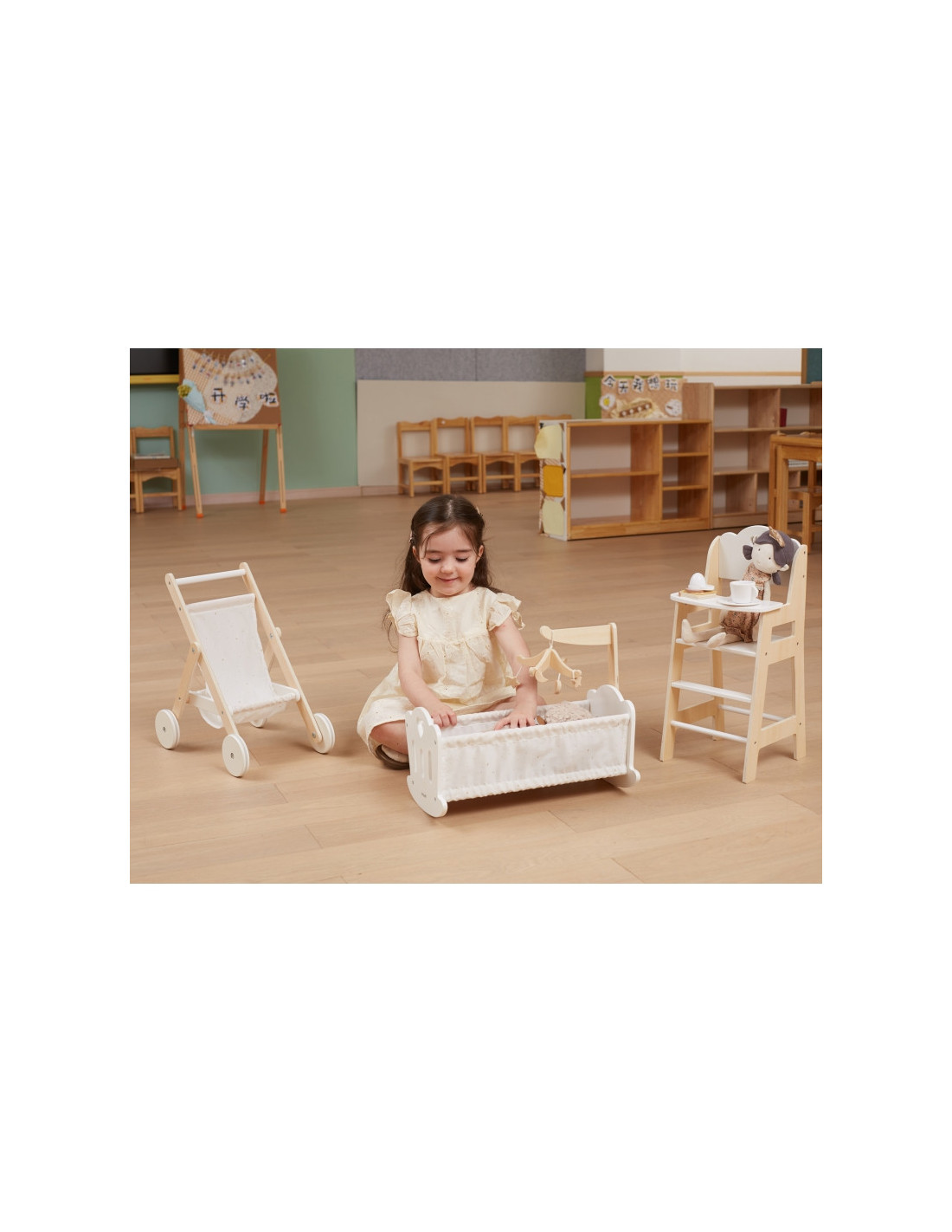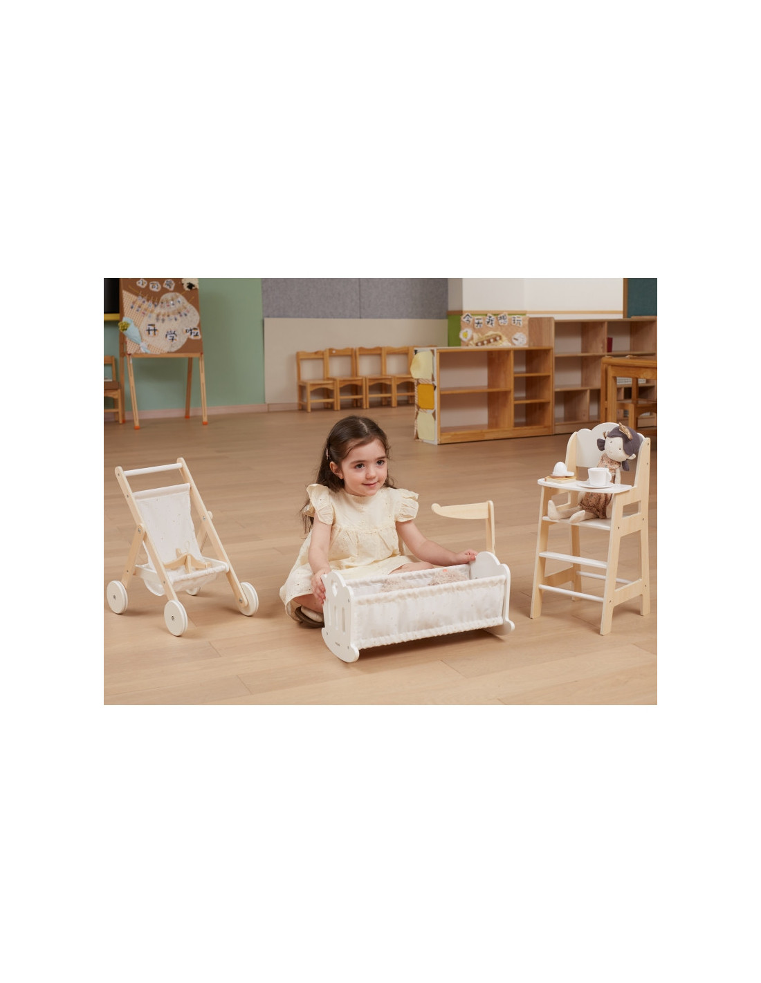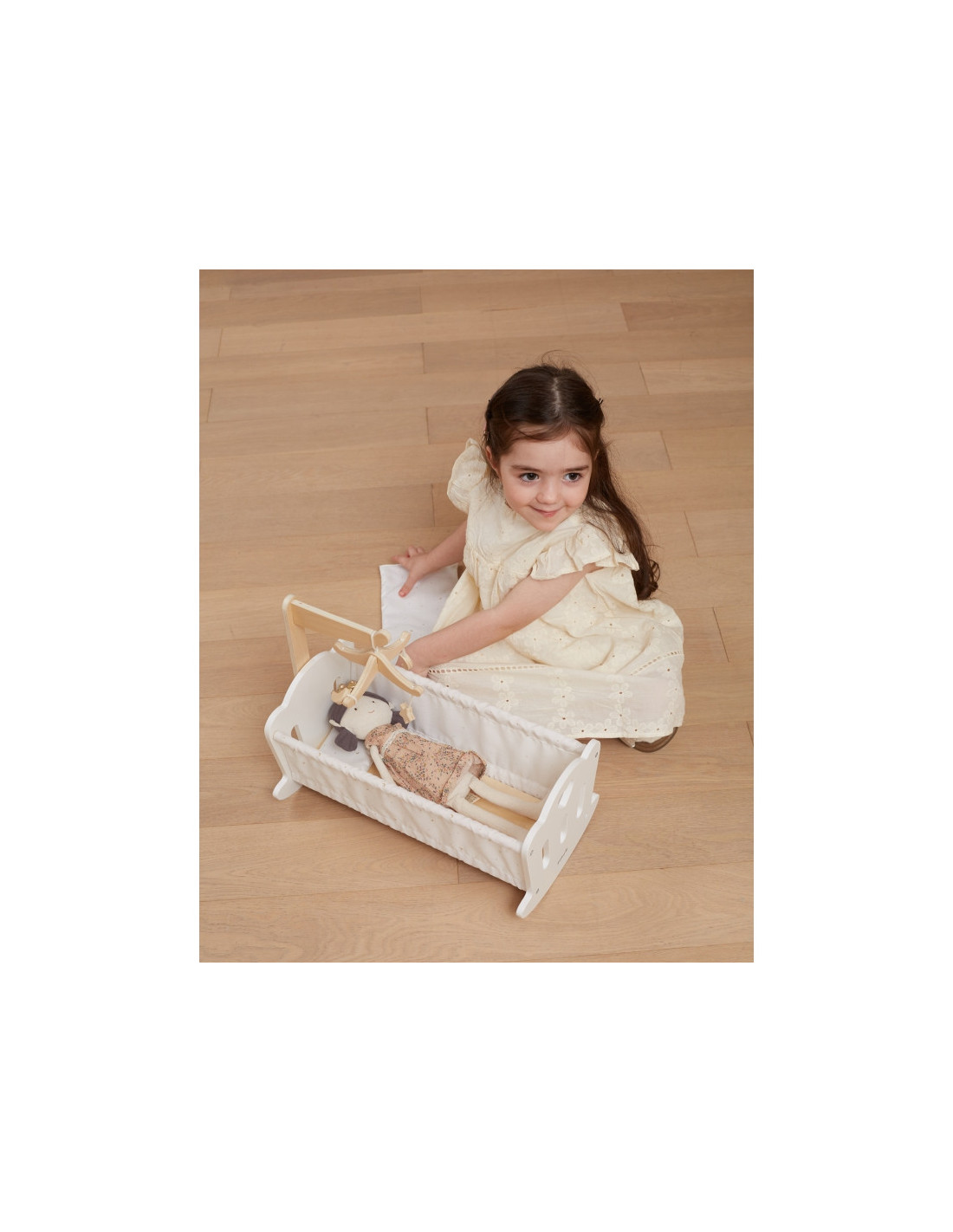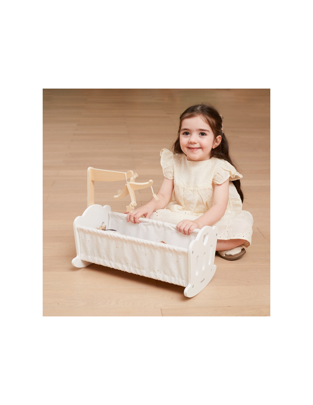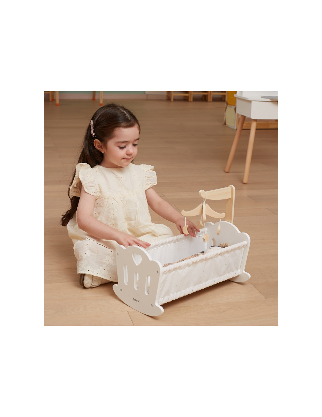 Połóż swoją lalkę do snu w pięknie wykonanej kołysce z serii PolarB marki VIGA. Kołyska posiada miękką bawełnianą poduszkę i kołderkę ze słodkim nadrukiem gwiazd i księżyca oraz uroczą karuzelę do łóżeczka. Pasuje do lalek o wysokości do 38 cm.