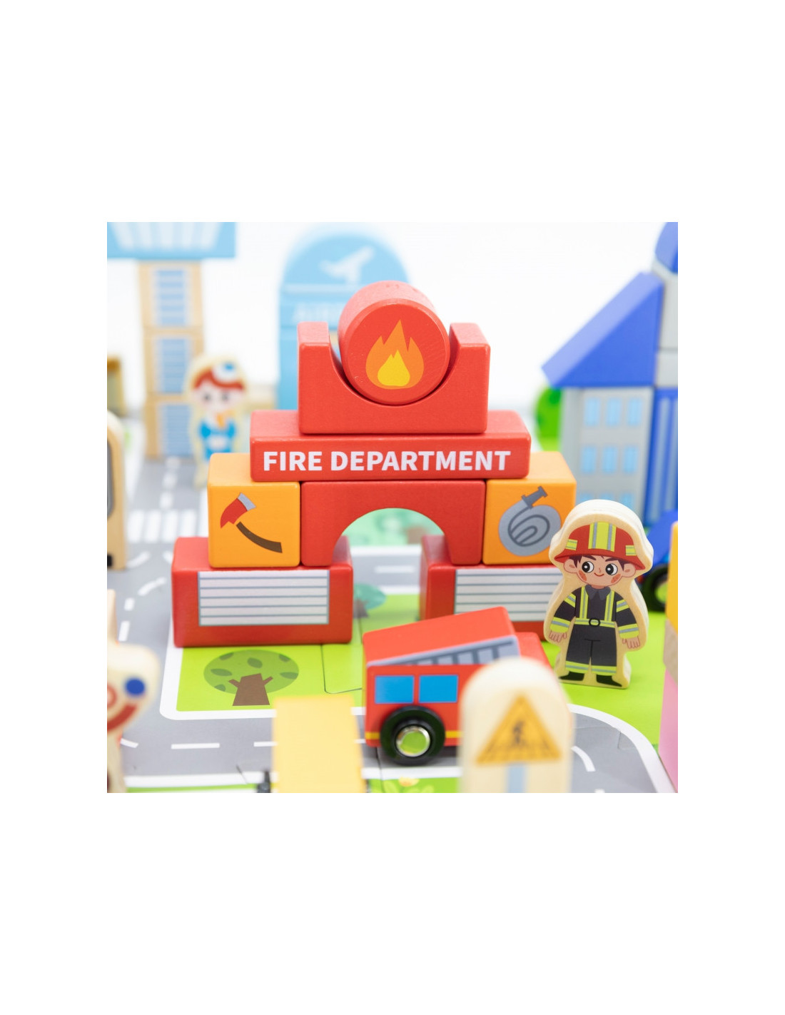 Drewniana Zestaw Klocków Miasto od marki Viga to idealna zabawka dla przyszłych architektów, którzy chcą stworzyć plan własnego miasta. Rozłóż makietę i za pomocą klocków o różnych kształtach i w pięknych kolorach zbuduj miasto! W zestawie znajdziemy 60 klocków, z których może być zbudowana szkoła, szpital, komisariat, straż pożarna, lotnisko, cukiernia oraz cyrk, a później możemy rozłożyć je w dowolnym miejscu na planszy miasta. Oprócz samych budynków w zestawie znajduje się 5 pojazdów, 6 figurek postaci z różnych zawodów odpowiadającym budynkom miasta oraz dodatkowe akcesoria: w tym znaki drogowe, drzewka. Całość wygodnie zapakowana w wiaderku dla łatwiejszego przechowywania.