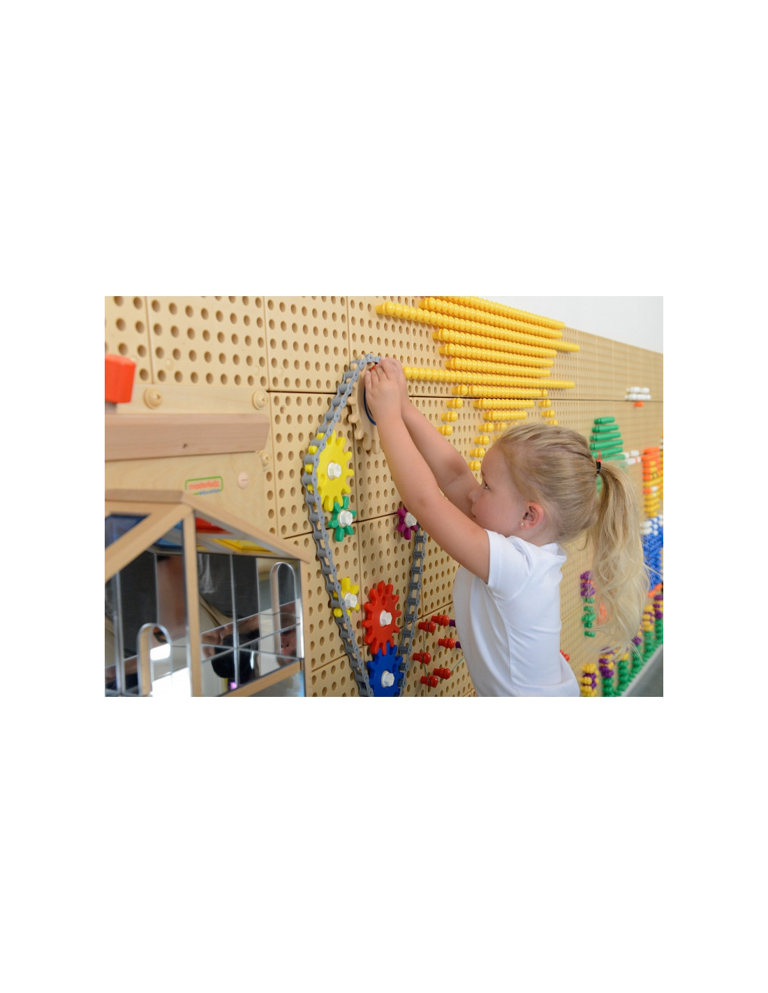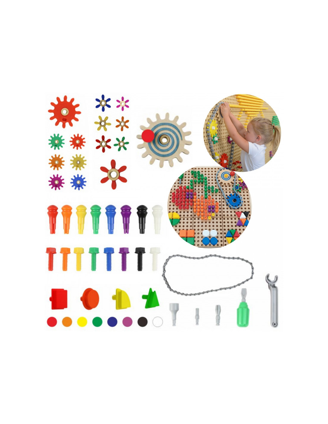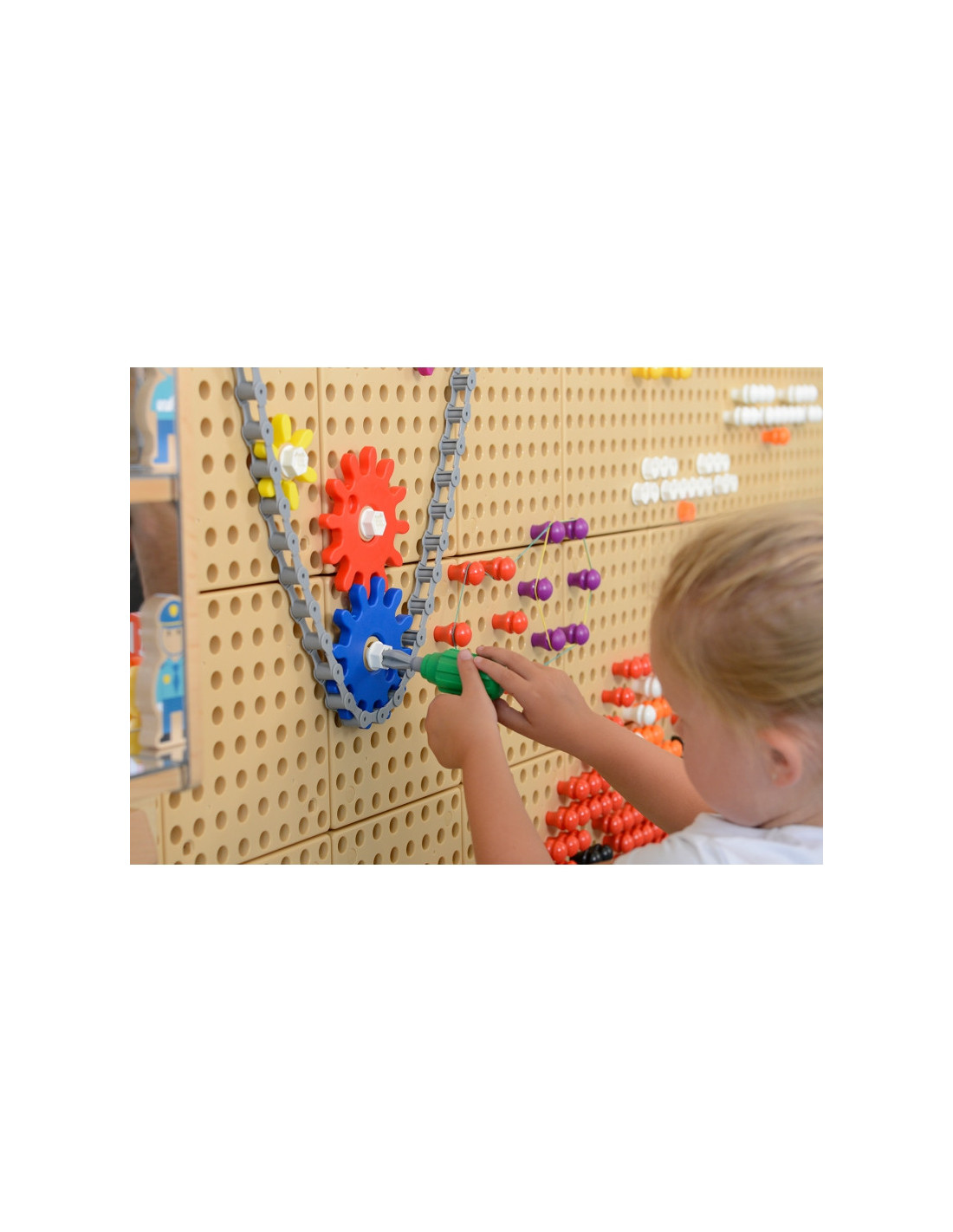Zestaw Akcesoriów STEM od marki Masterkidz zawiera w sobie podstawowe akcesoria do zabawy z systemem STEM Masterkidz. Znajdziemy w nim 128 szt. kołeczków, 128 szt. śrubek, 64 szt. kołeczków geometrycznych, 2 zestawy narzędzi, 18 szt. kół zębatych, koło z uchwytem oraz łańcuch. Zestaw ten jest zaprojektowany do kreatywnej zabawy i poznawania świata nauki poprzez eksperymentowanie i konstruowanie. Dzieci mogą używać tych akcesoriów do tworzenia różnorodnych wzorów i konstrukcji, co rozwija ich zdolności manualne, logiczne myślenie oraz zrozumienie podstawowych zasad mechaniki i inżynierii. Ten zestaw to doskonały start dla zabawy z systemem STEM od Masterkidz. Jest kompatybilny zarówno z tablicami ściennymi, jak i wolnostojącymi, przy czym do rozpoczęcia zabawy wymagana jest jedna z nich.