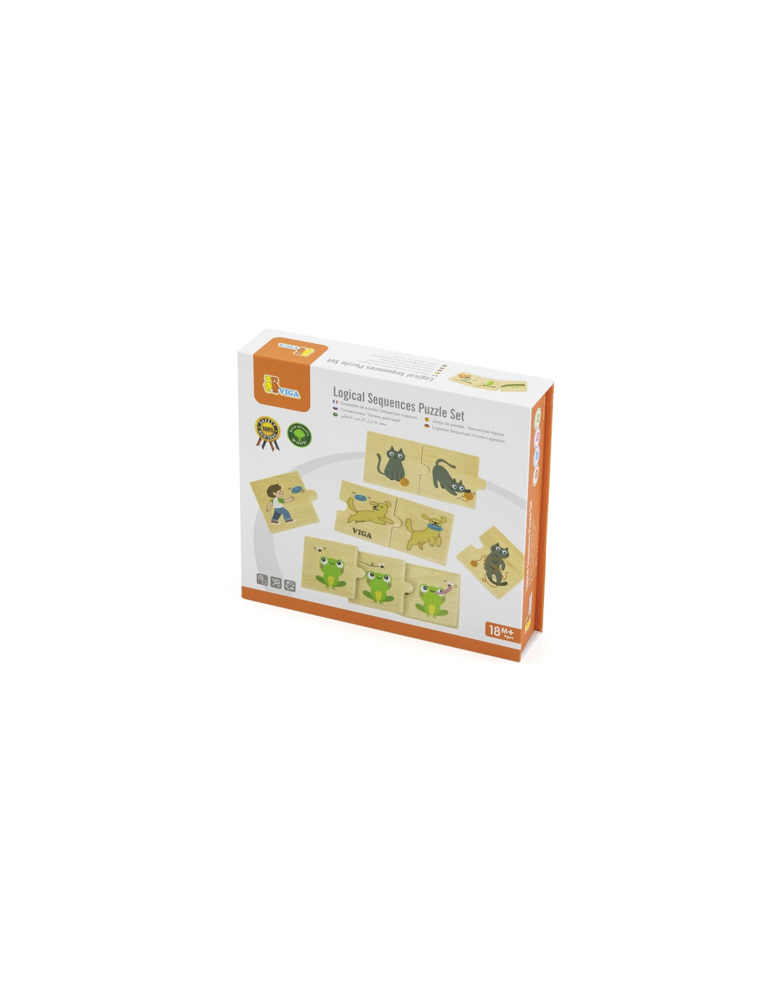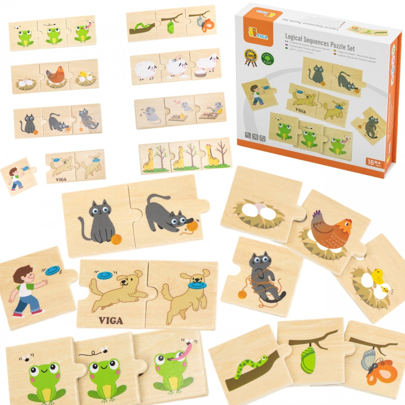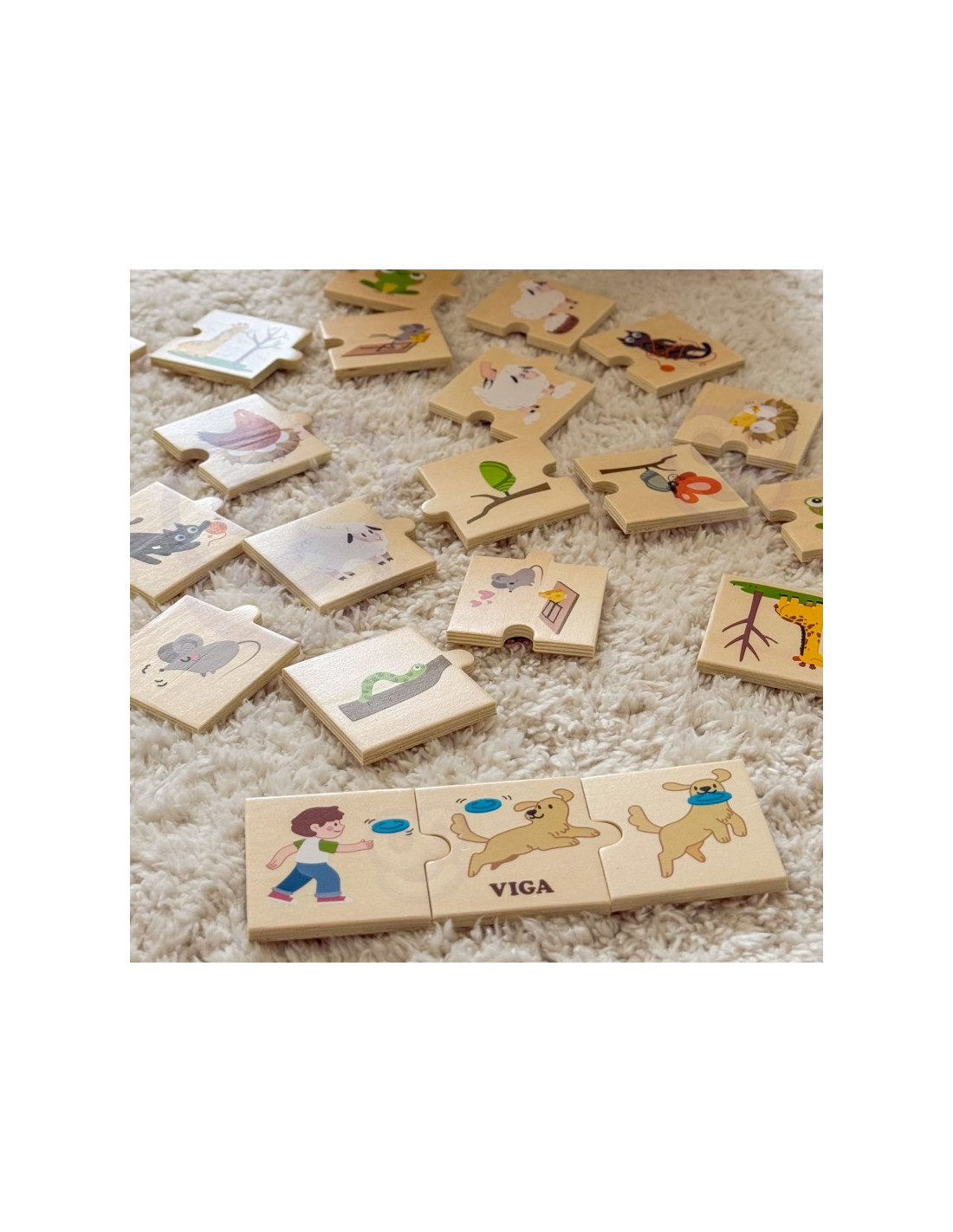 Drewniana układanka puzzle dopasuj czynności od firmy VIGA to puzzle w których dziecko ma za zadanie dopasować 8 zestawów kolorowych puzzli z czynnościami jakie wykonują zwierzęta takie jak na przykład aportowanie przez psa czy jedzenie roślin z drzew przez żyrafę. Jest to znakomita zabawka dla dzieci pozwalająca nauczyć się i utrwalić wiedzę w rozpoznawaniu i opisaniu danej czynności. Dzięki temu zestawowi puzzli mamy wiele możliwości rozwijania relacji z naszym dzieckiem. Pomóż dzieciom zrozumieć sekwencję codziennych czynności i rozwijaj umiejętności logicznego rozumowania i opowiadania historii. Świetny sposób na rozwijanie nowego słownictwa, koncentracji i umiejętności motorycznych małych dzieci oraz tworzenie skojarzeń i relacji. Podstawową funkcją tej układanki jest nie tylko nauka. Wspomaga również: spostrzegawczość, koncentrację, małą motorykę i koordynację wzrokową. Jest to niezwykle rozwojowa zabawka!