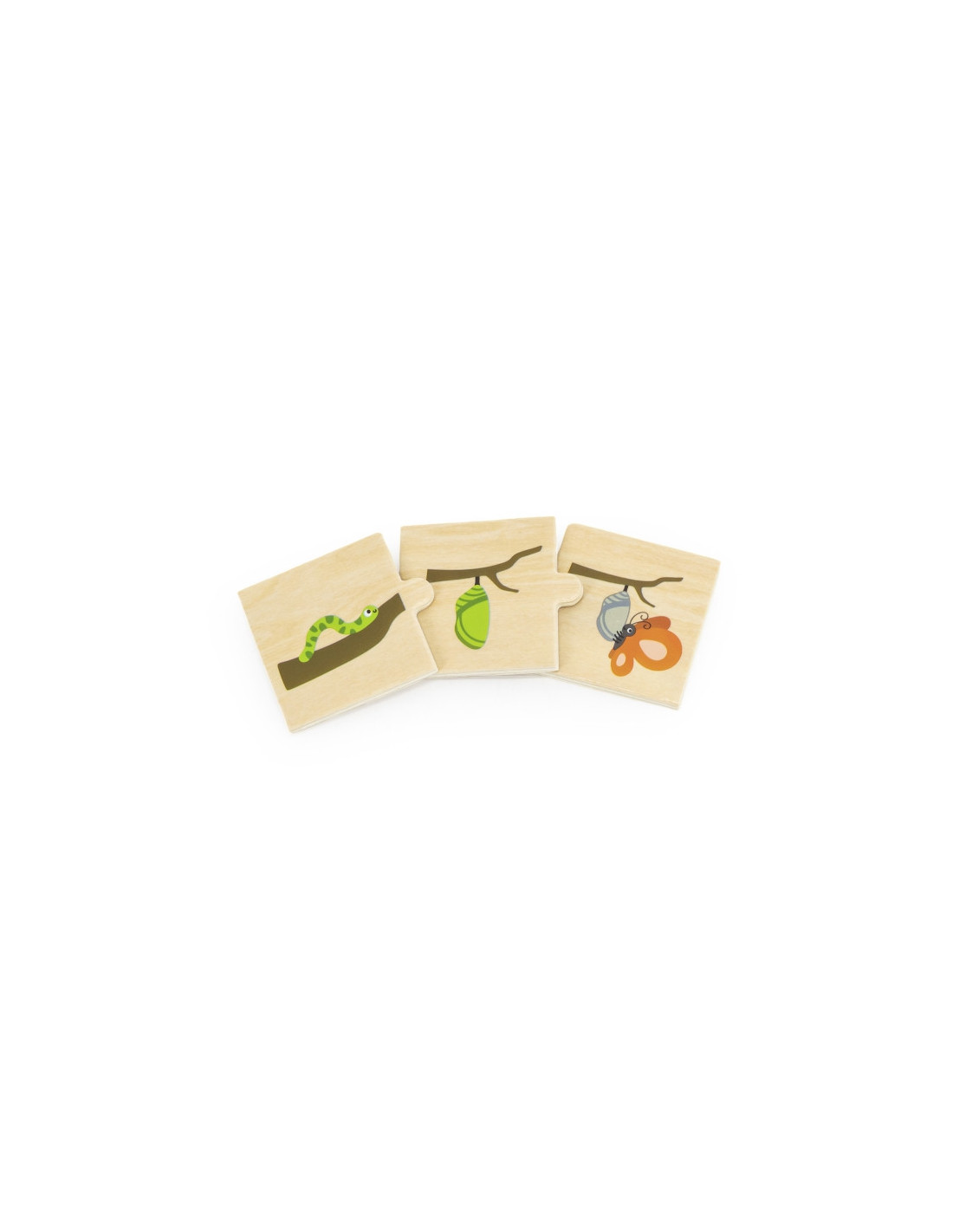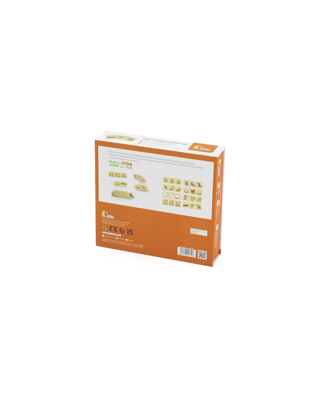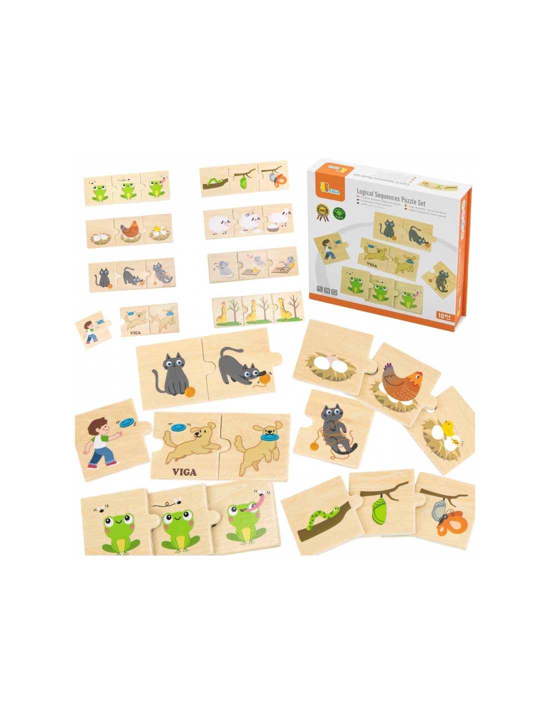 Drewniana układanka puzzle dopasuj czynności od firmy VIGA to puzzle w których dziecko ma za zadanie dopasować 8 zestawów kolorowych puzzli z czynnościami jakie wykonują zwierzęta takie jak na przykład aportowanie przez psa czy jedzenie roślin z drzew przez żyrafę. Jest to znakomita zabawka dla dzieci pozwalająca nauczyć się i utrwalić wiedzę w rozpoznawaniu i opisaniu danej czynności. Dzięki temu zestawowi puzzli mamy wiele możliwości rozwijania relacji z naszym dzieckiem. Pomóż dzieciom zrozumieć sekwencję codziennych czynności i rozwijaj umiejętności logicznego rozumowania i opowiadania historii. Świetny sposób na rozwijanie nowego słownictwa, koncentracji i umiejętności motorycznych małych dzieci oraz tworzenie skojarzeń i relacji. Podstawową funkcją tej układanki jest nie tylko nauka. Wspomaga również: spostrzegawczość, koncentrację, małą motorykę i koordynację wzrokową. Jest to niezwykle rozwojowa zabawka!