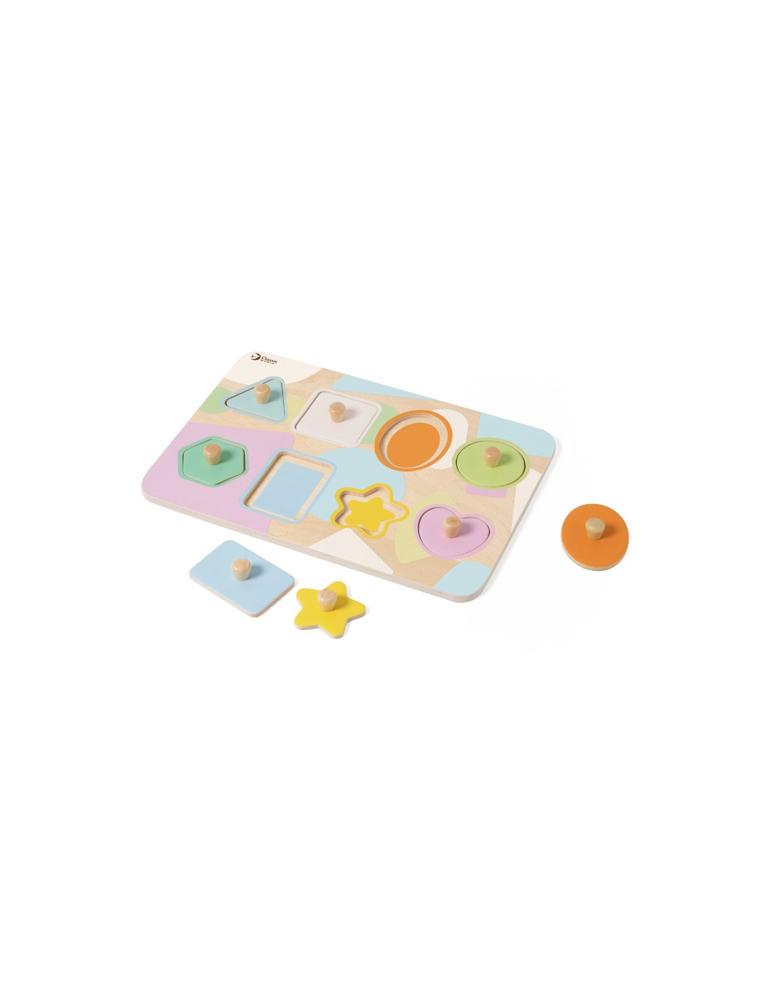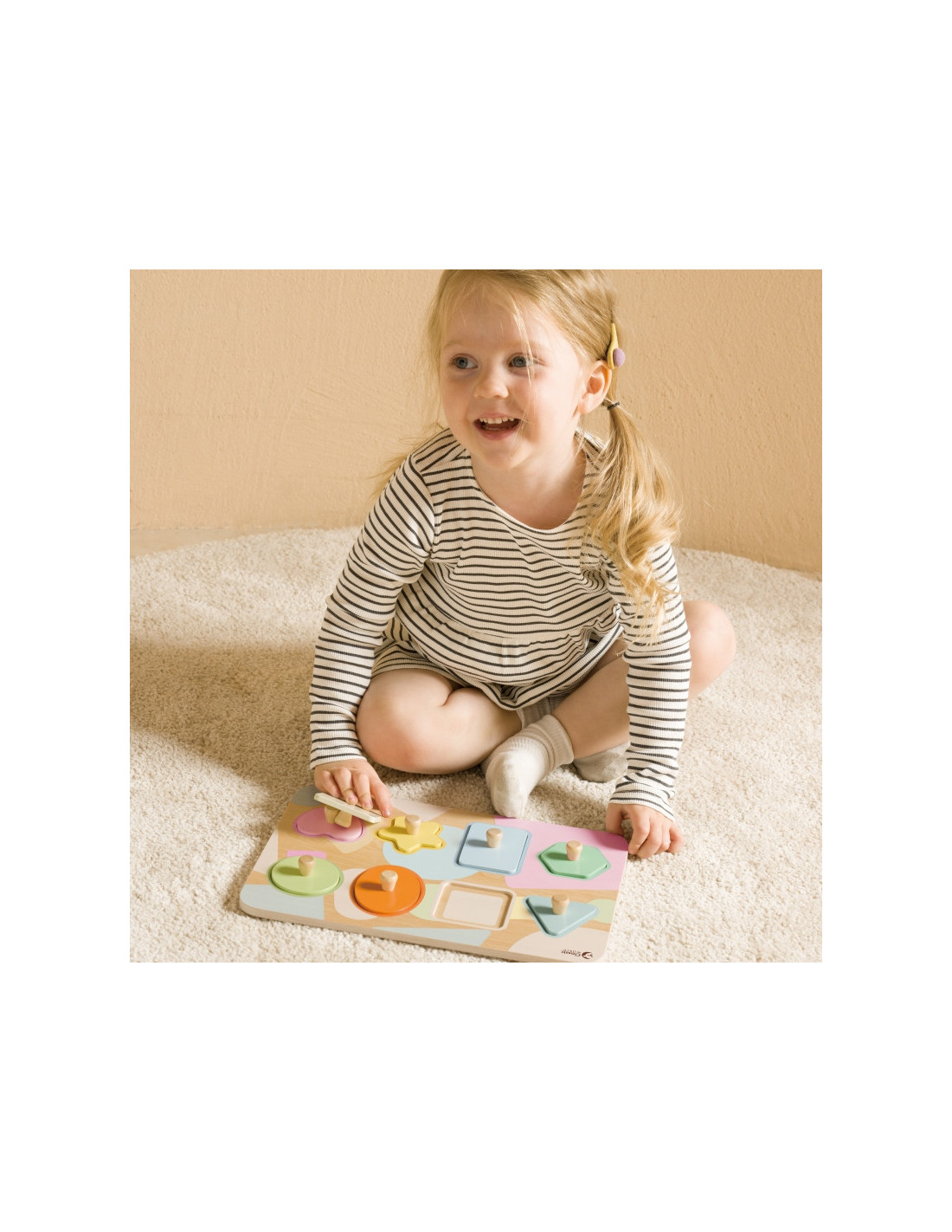 Ta drewniana łamigłówka z kołkami do układania od marki CLASSIC WORLD składa się z bardzo grubej planszy z różnymi geometrycznymi kształtami w pastelowych kolorach. Pomaga dziecku w rozpoznawaniu płaskich figur geometrycznych zarówno wzrokowo, jak i dotykowo. Gdy dzieci starają się dopasować kształty puzzli do odpowiednich miejsc lub tworzyć kombinacje, rozwijają umiejętności rozróżniania kształtów i kolorów już we wczesnym wieku.
