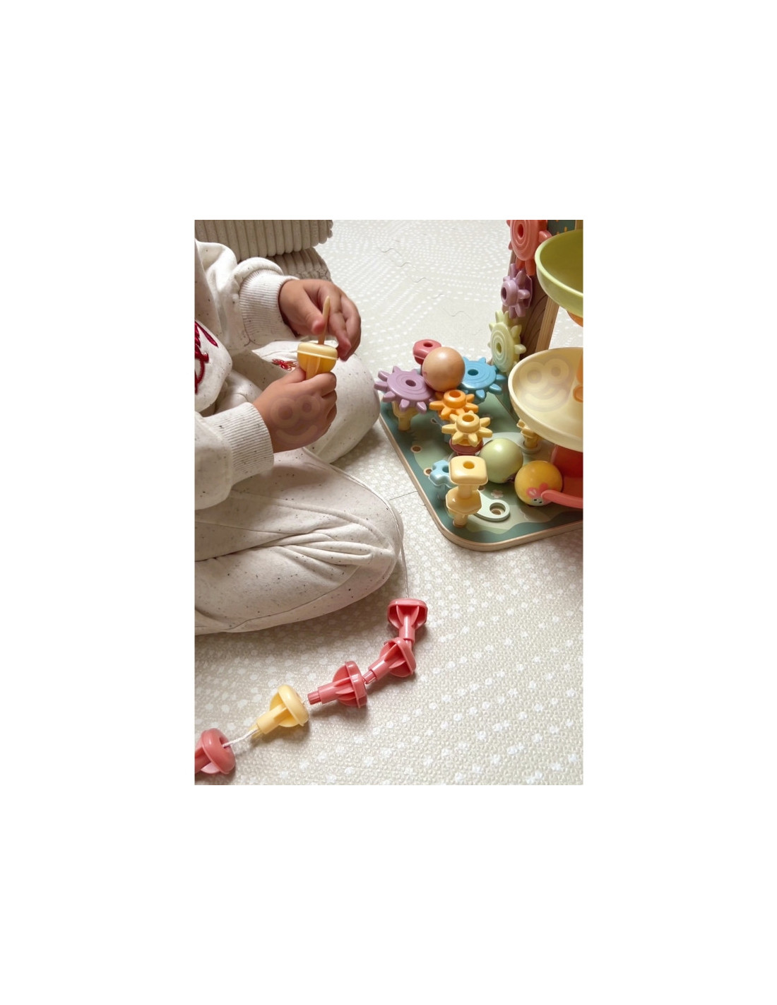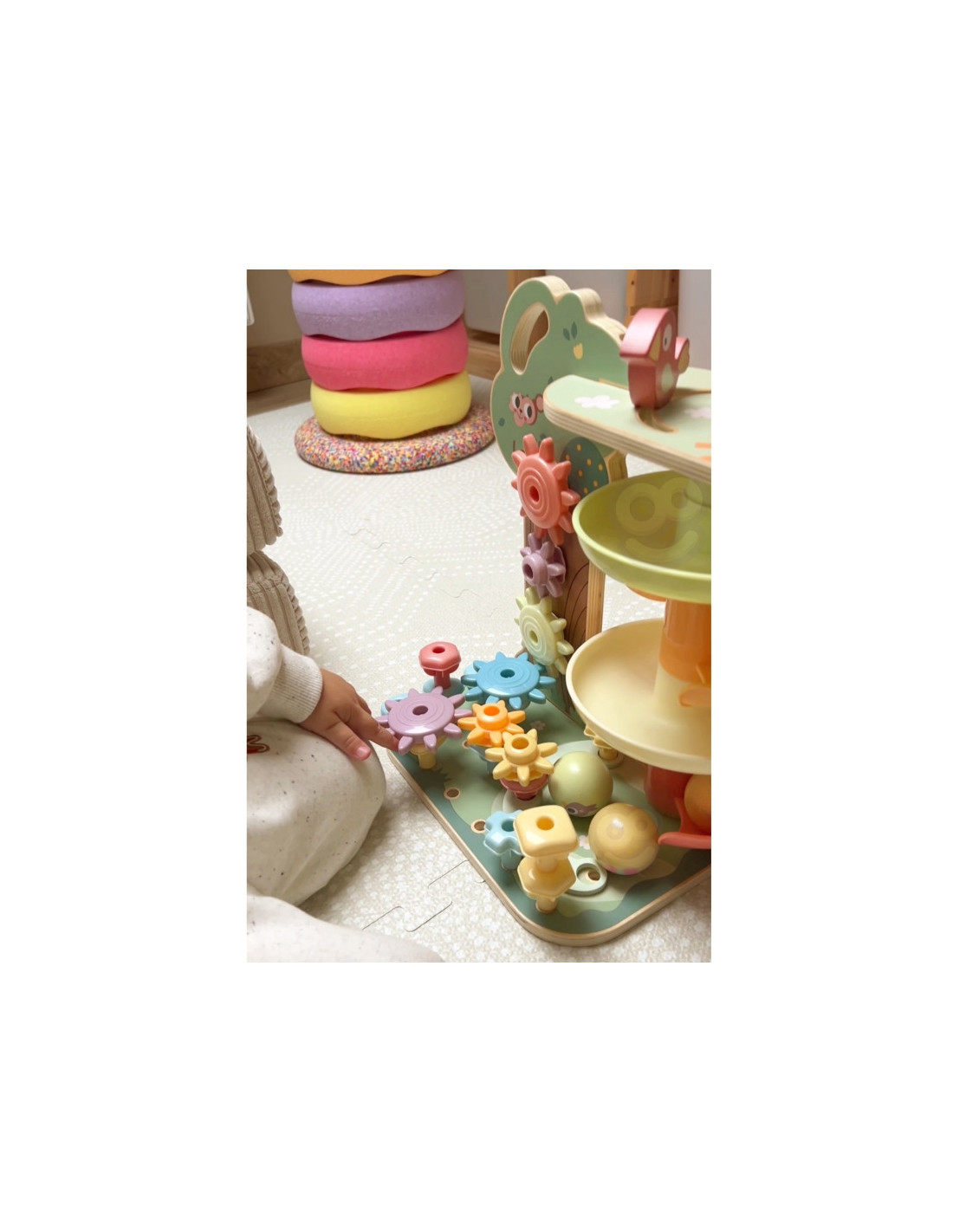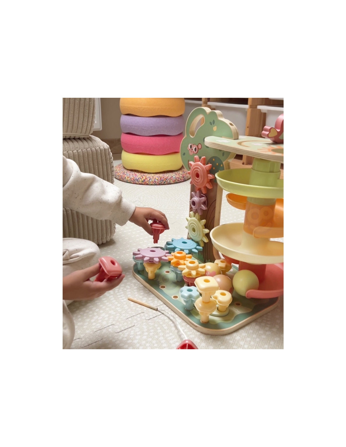 Kolorowa wieża kulodromowa, sensoryczne koła zębate, kołeczki do wbijania i kreatywna nawlekanka – wszystko to w pięknej, pastelowej oprawie i wykonane z bezpiecznych, trwałych materiałów
