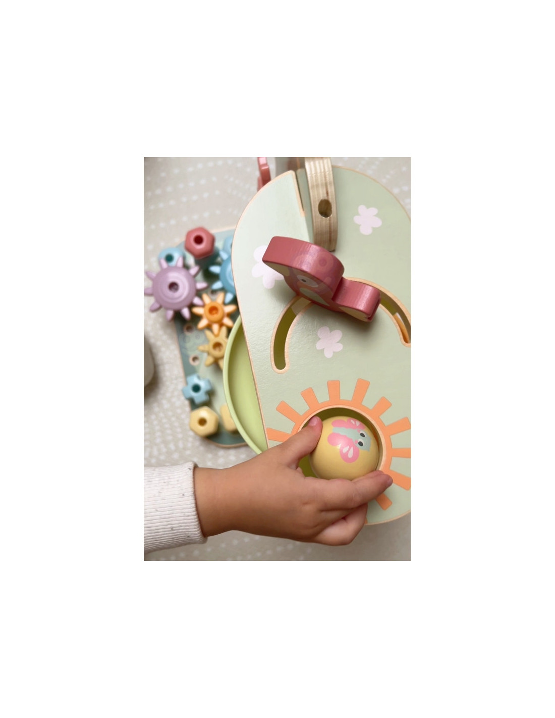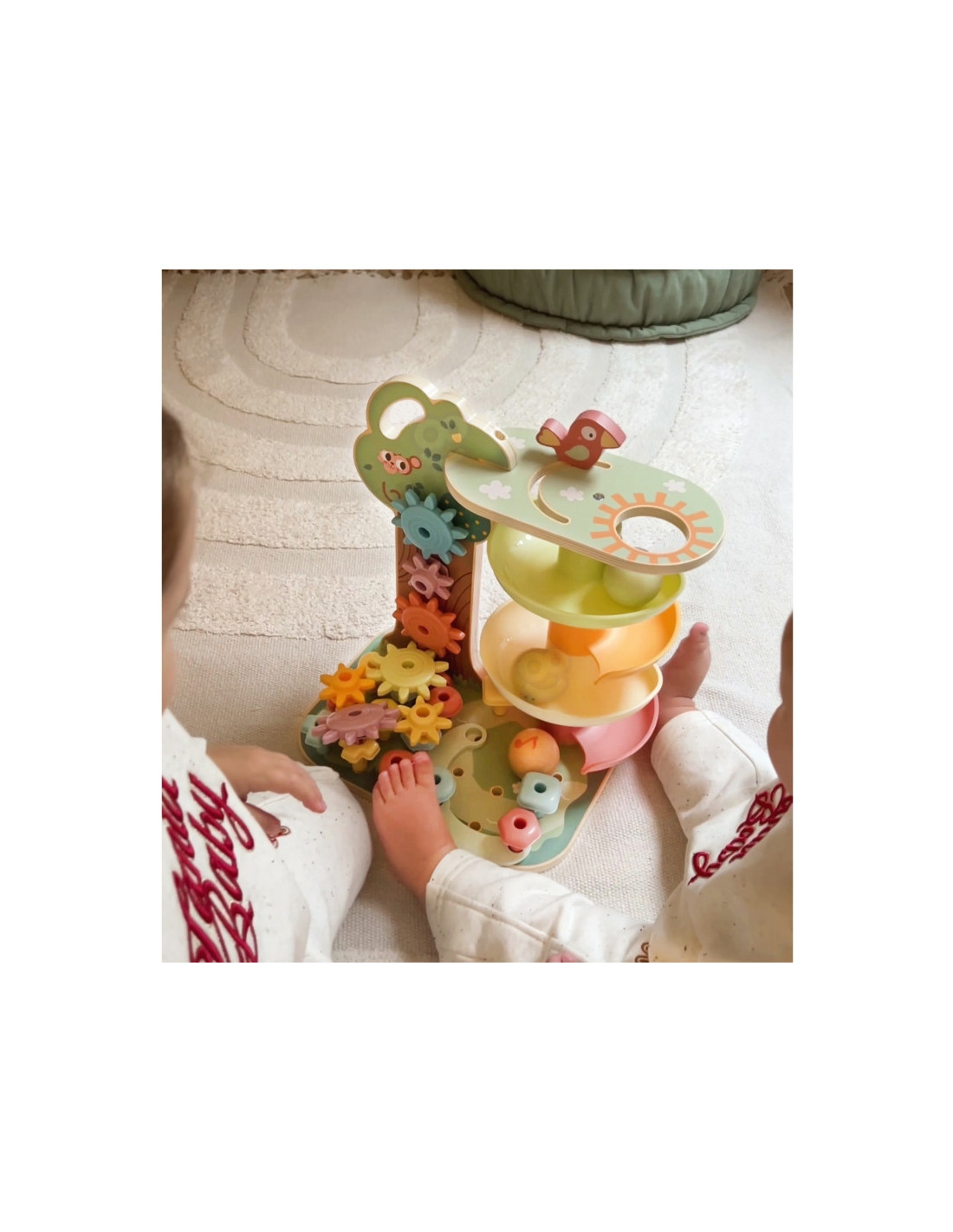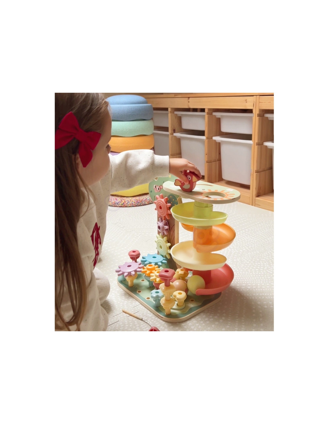 Kolorowa wieża kulodromowa, sensoryczne koła zębate, kołeczki do wbijania i kreatywna nawlekanka – wszystko to w pięknej, pastelowej oprawie i wykonane z bezpiecznych, trwałych materiałów