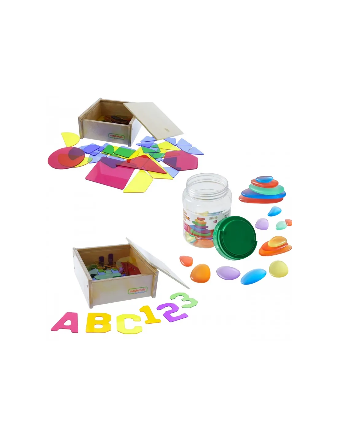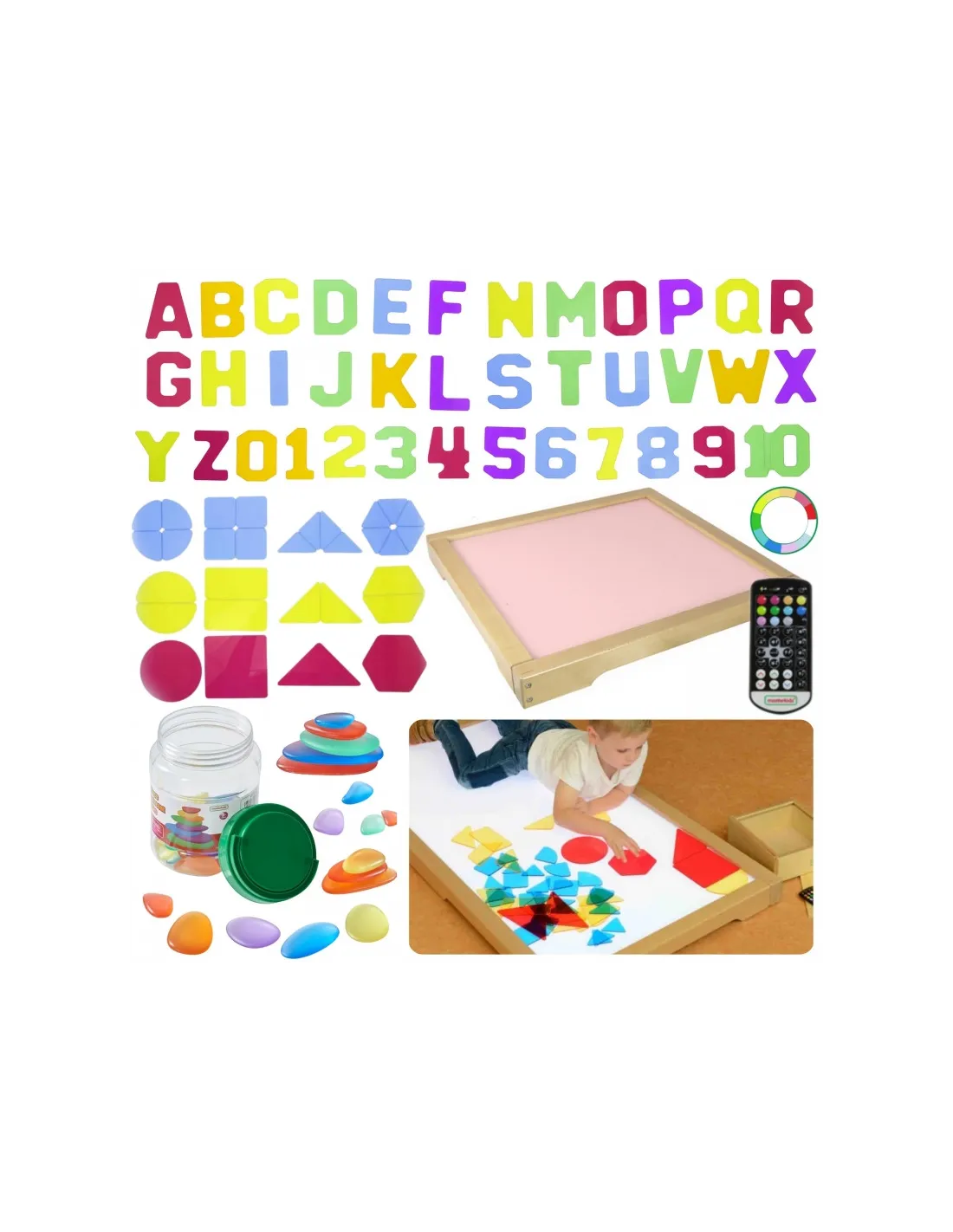 - 4 paczki - Skrzynia LED: 74 x 74 x 18 (cm) / Kolorowe kamienie: 15 x 13 x 13 (cm) / Cyfry i litery: 24 x 21 x 10 (cm) / Kształty geometryczne 25 x 22 x 10 (cm)