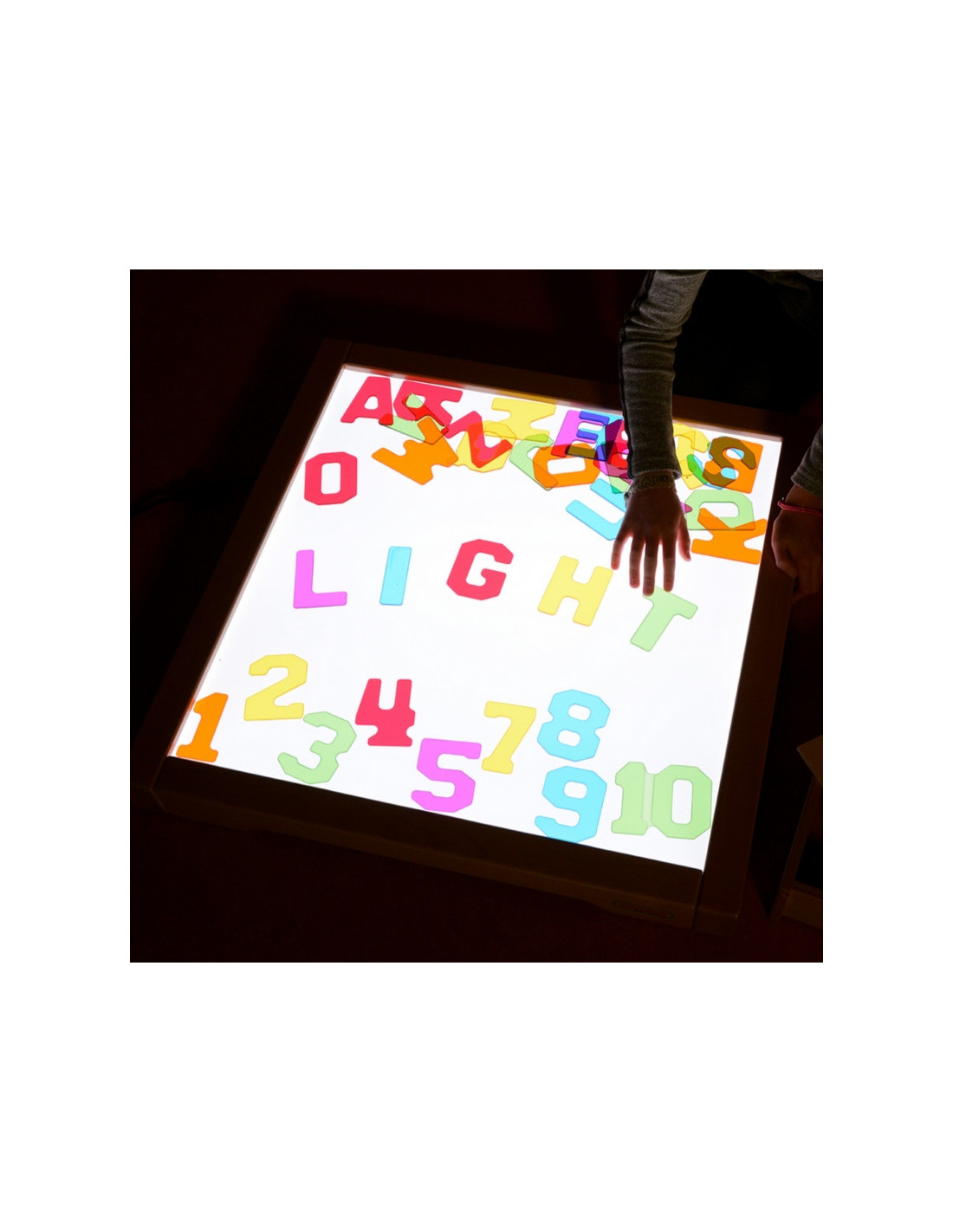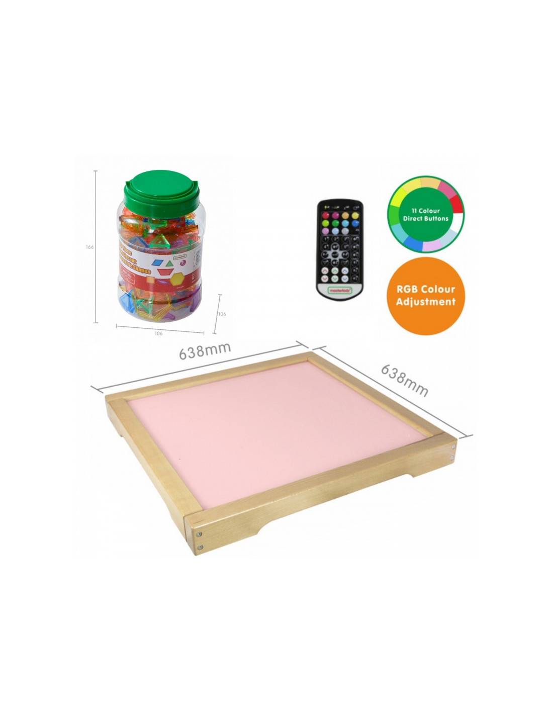 Panel Skrzynia LED Sensoryczna Masterkidz to solidna, drewniana skrzynka z podświetleniem LED emitującym kolorowe światło z możliwością dowolnej konfiguracji dzięki dołączonemu pilotowi, użytkownik może ustawić panel na jeden z 11 zaprogramowanych kolorów, lub ręcznie zmienić emitowany kolor bazując na podstawowych barwach światła: czerwonej, zielonej i niebieskiej. Urządzenie pozwala także na płynne przechodzenie pomiędzy kolorami oraz zapamiętywanie wybranych barw do ponownego użycia. Panel świetlny LED umożliwia różnorodne aktywności wspierające rozwój kreatywności, takie jak mieszanie kolorów czy nauka poprzez system STEM. Efektowne rezultaty uzyskuje się, gdy światło przenika przez różne materiały – liście, papier, tackę z piaskiem czy przezroczystą wodą. Panel doskonale współpracuje z dołączonymi do zestawu przezroczystymi kolorowymi figurami geometrycznym, które wspierają rozwój kreatywności oraz wyobraźni podczas zabawy.