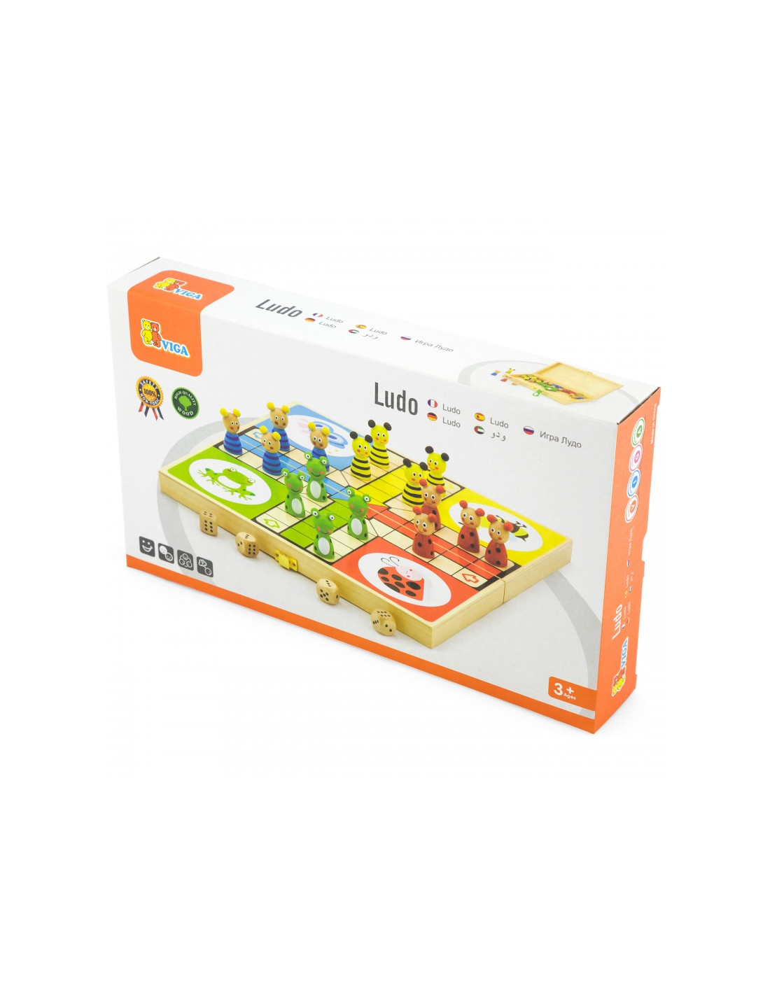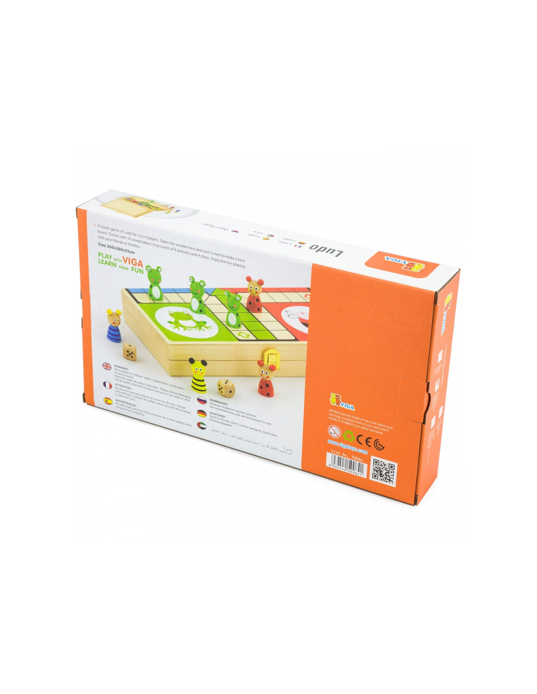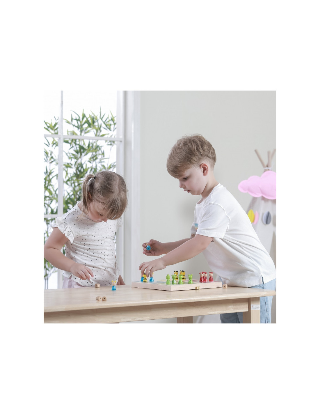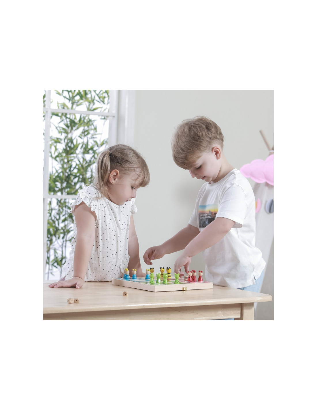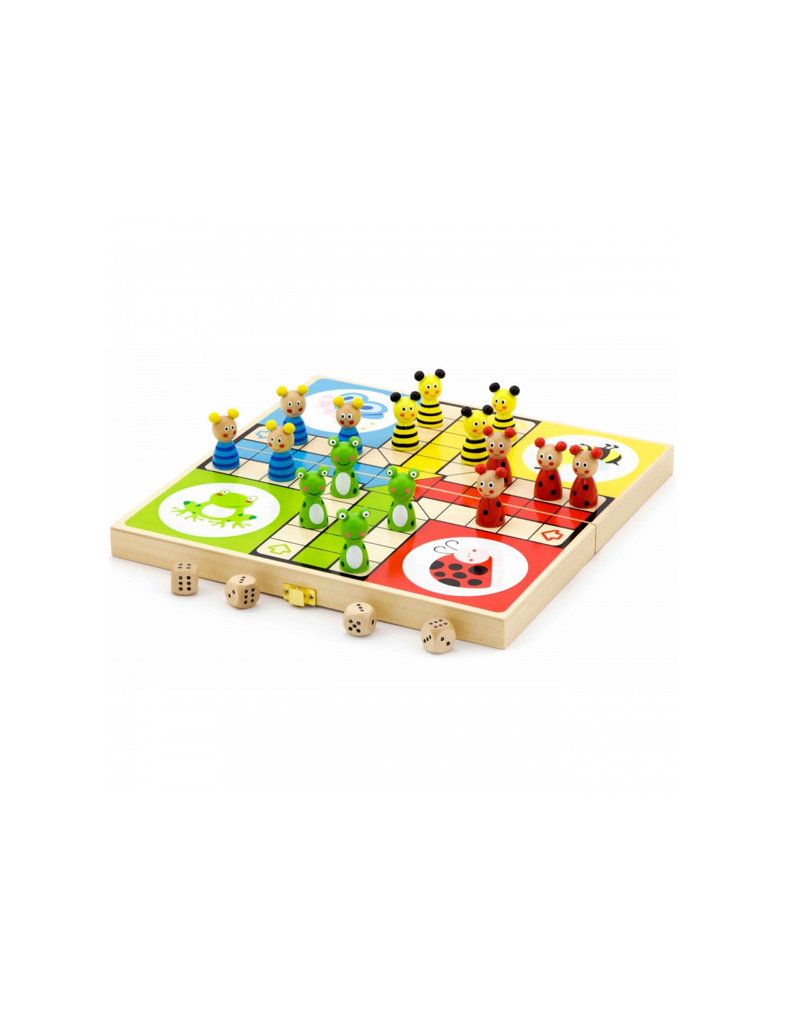 Gra planszowa Chińczyk jest dobrze znana dzieciom i dorosłym na całym świecie. Firma Viga przygotowała jej zupełnie nową odsłonę, która oczaruje malców. Zestaw zawiera cztery kostki, planszę-pudełko oraz szesnaście pięknie wykonanych figurek przedstawiających żabki, pszczółki, biedronki i motylki.