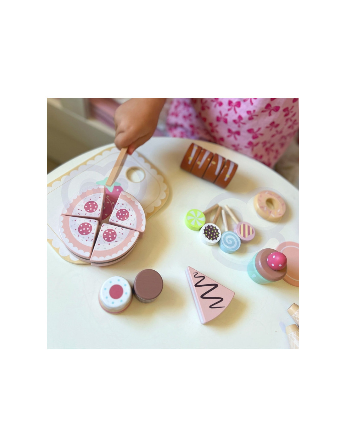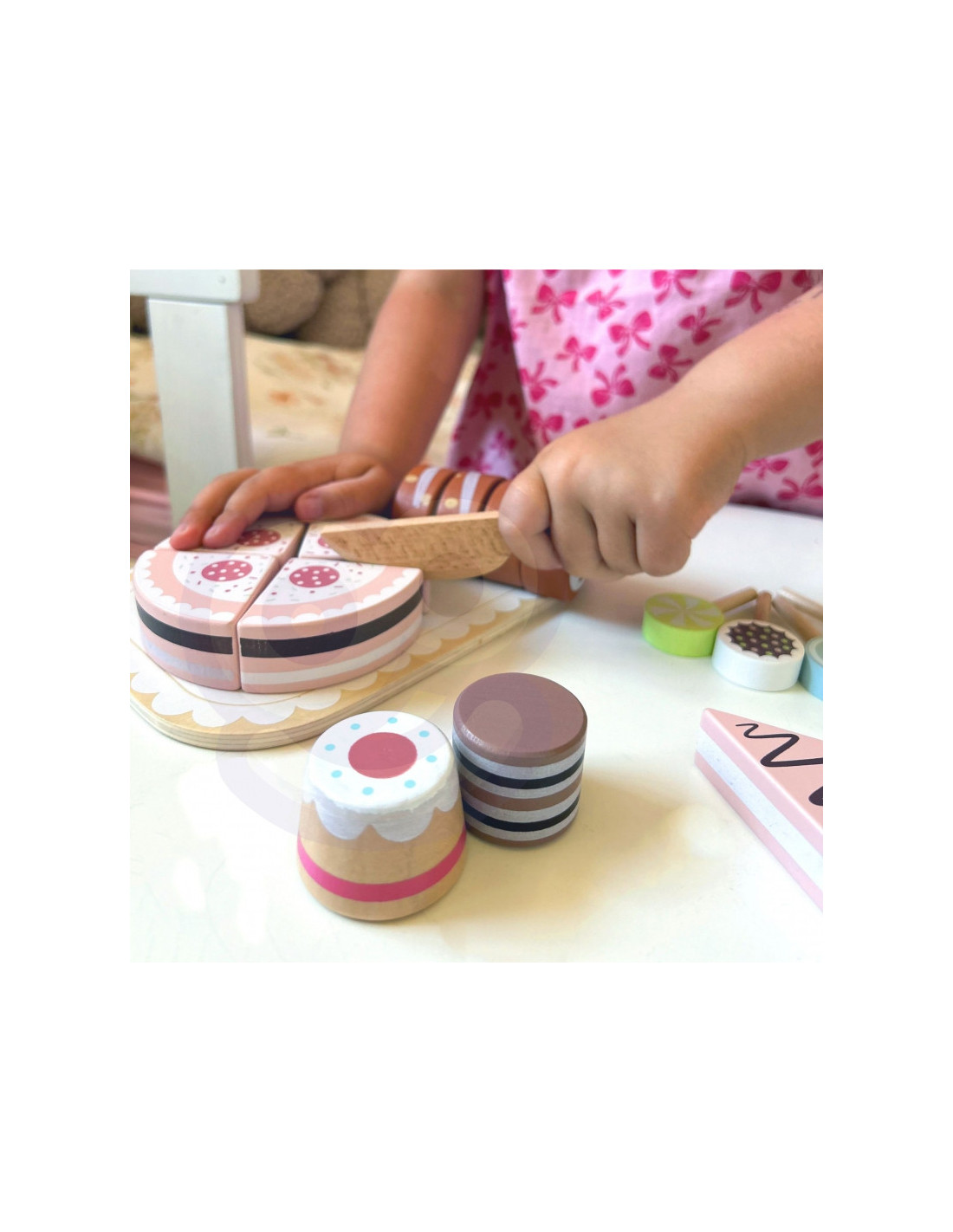 - - Zestaw zawiera: Pudełko, tort, roladę, babeczkę, muffinkę, ciastko, pączka, kawałek ciasta, 4 lizaki, 2 lody w wafelku, 2 filiżanki, 2 łyżeczki, 2 widelce, nożyk