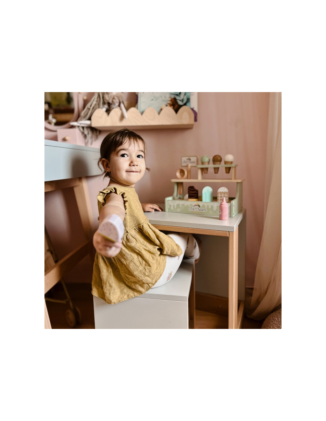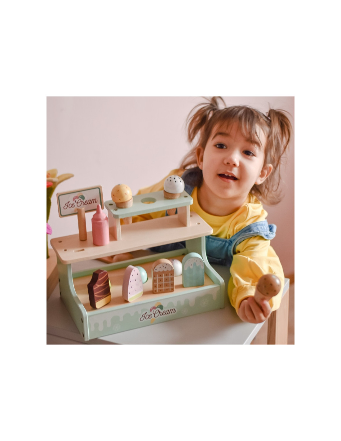 Ten pastelowy zestaw to wymarzona zabawka dla małych kucharzy i cukierników. Dzieci mogą bawić się w sklepik, serwując pyszne lody z wafelkiem, gałkami i lodami na patyku – wszystko wykonane z bezpiecznego drewna i pięknie pomalowane. Dzięki magnetycznym gałkom i dołączonemu menu maluch może wcielić się w rolę lodziarza i rozwijać wyobraźnię oraz zdolności manualne podczas zabawy.