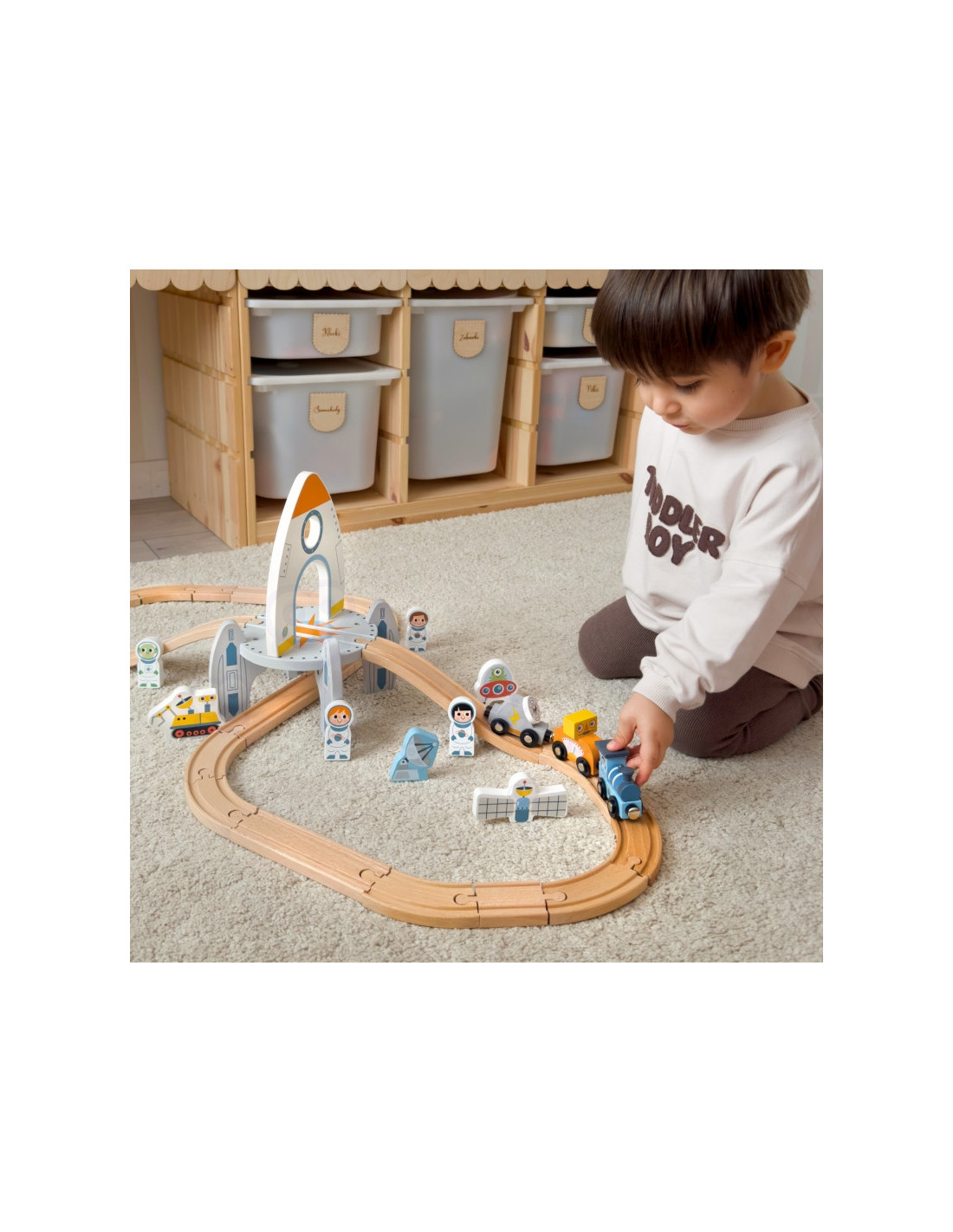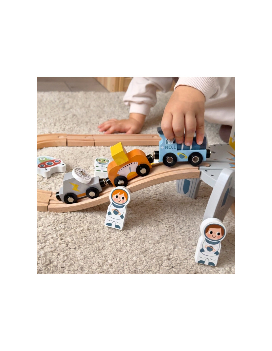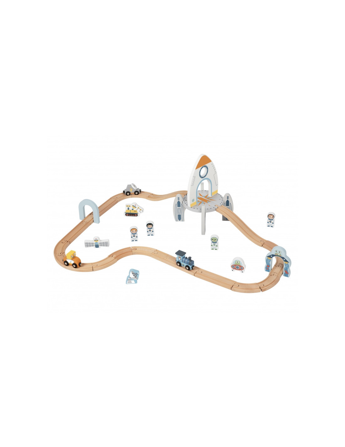 - - zestaw zawiera drewniane tory składane, pociąg z dwoma wagonikami, postacie kosmonautów, akcesoria kosmiczne m.in satelitę, łazik i latający spodek oraz rakietę i łuk z wizerunkiem kosmity,
