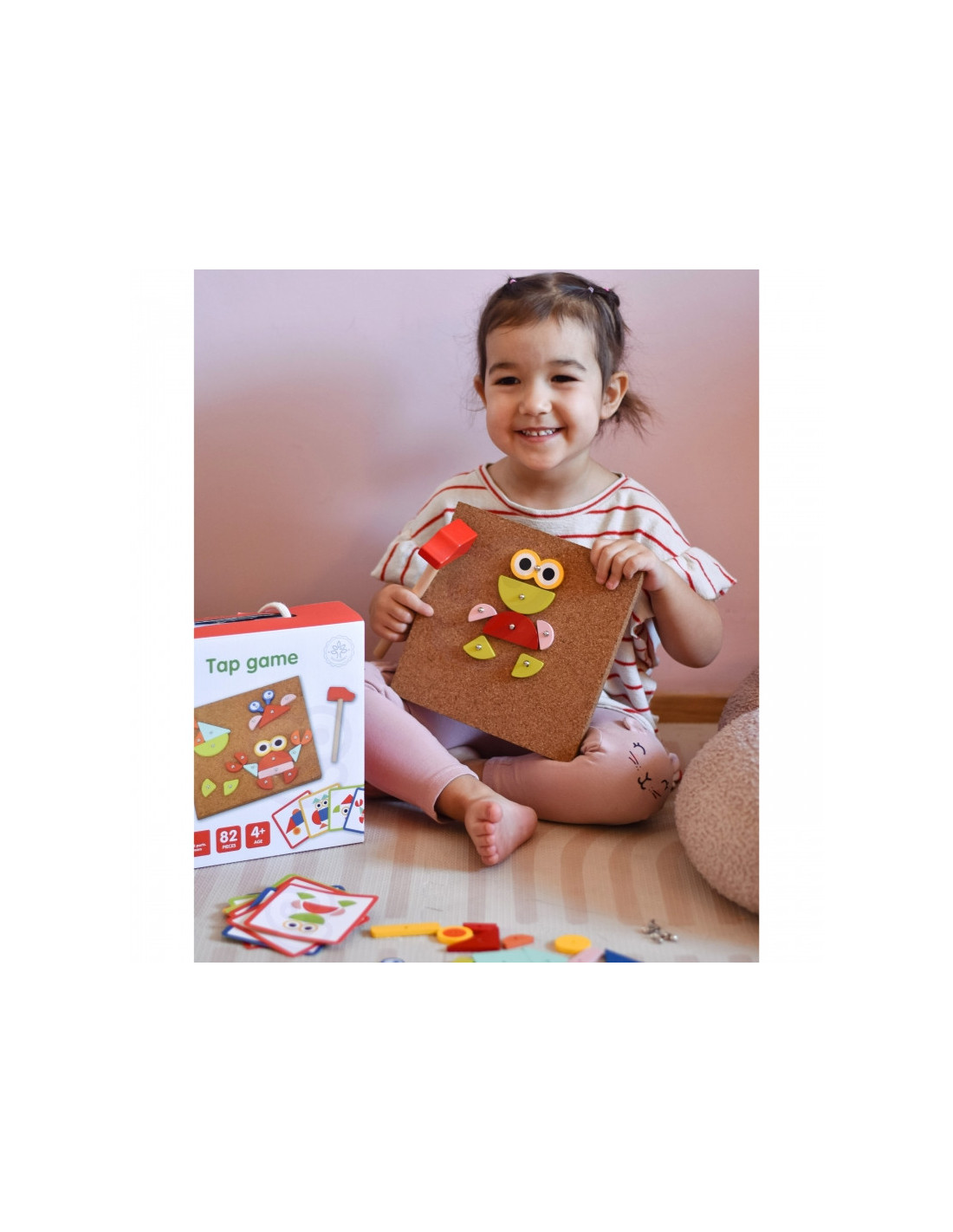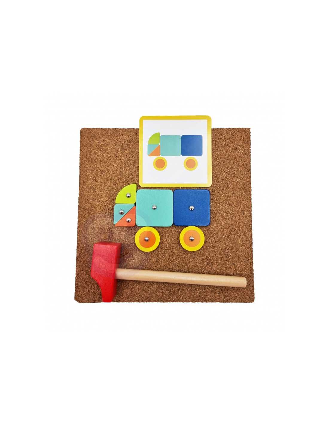 - - zestaw zawiera 82 el.: 30 klocków, 40 pinezki, 10 kart z 20 wzorami, tablice korkową oraz młotek