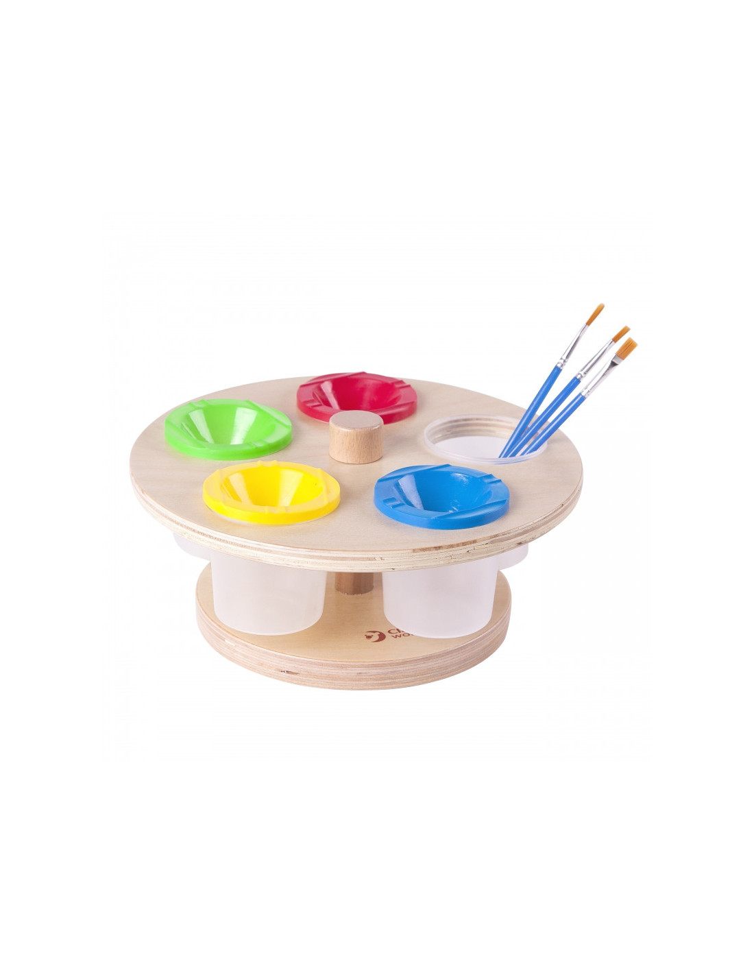 Posiada on 5 plastikowych kubeczków na farby z zamknięciem. Stojak jest odpowiedni dla dzieci- nie posiada ostrych krawędzi oraz jest stabilny. Dzięki zamykanym pojemnikom farby są chronione przed wyschnięciem. Obrotowy stojak na farby idealnie nada się także do przedszkoli i innych placówek edukacyjnych, dzięki niemu dzieci nie będą przewracały farbek brudząc przy tym siebie i swojej najbliższej przestrzeni. To także świetny pomysł do użytku domowego, jeśli twoja pociecha jest małym artystą- od dziś pomalowane będą tylko kartki !