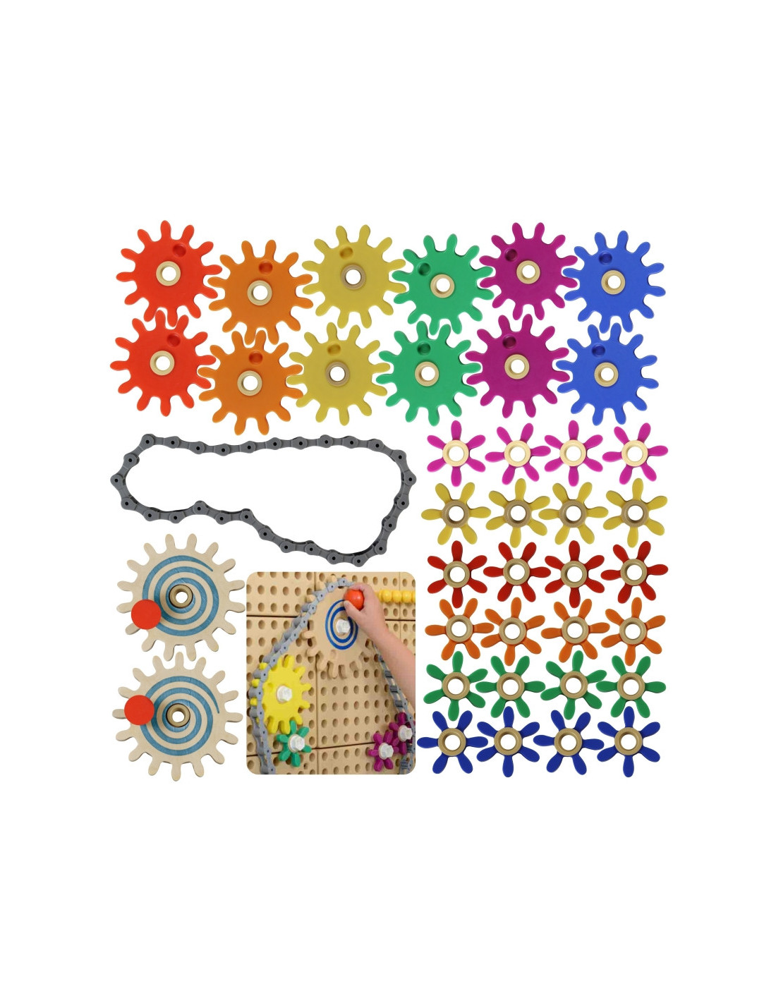 Zestaw kolorowych trybików i kół zębatych Masterkidz zapewnia dzieciom łatwy dostęp do prawdziwych, działających elementów inżynieryjnych. Każde koło zębate zawiera centralne łożysko, które po zamocowaniu nadal będzie się płynnie obracać. Zaokrąglone końce zębów umożliwiają łatwe łączenie kół w linii prostej lub nawet pod kątem 90 stopni względem siebie. Różnorodność rozmiarów kół pozwala dzieciom zrozumieć zasady przełożeń, a łańcuch zębaty umożliwia przenoszenie siły obrotowej. Zestaw kompatybilny z tablicami STEM