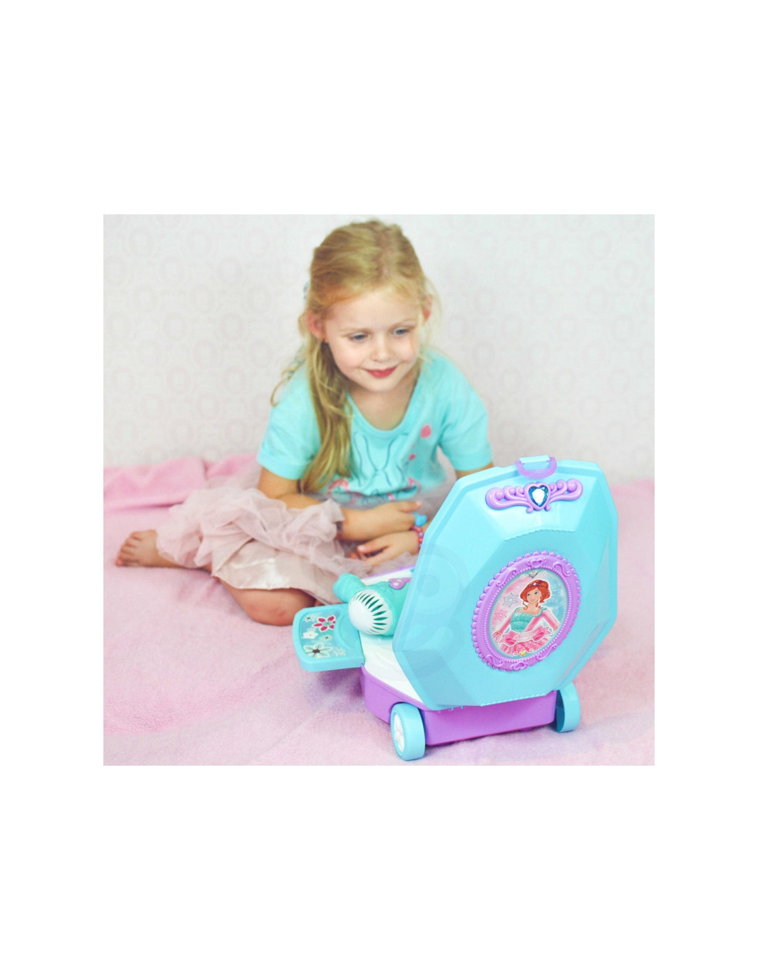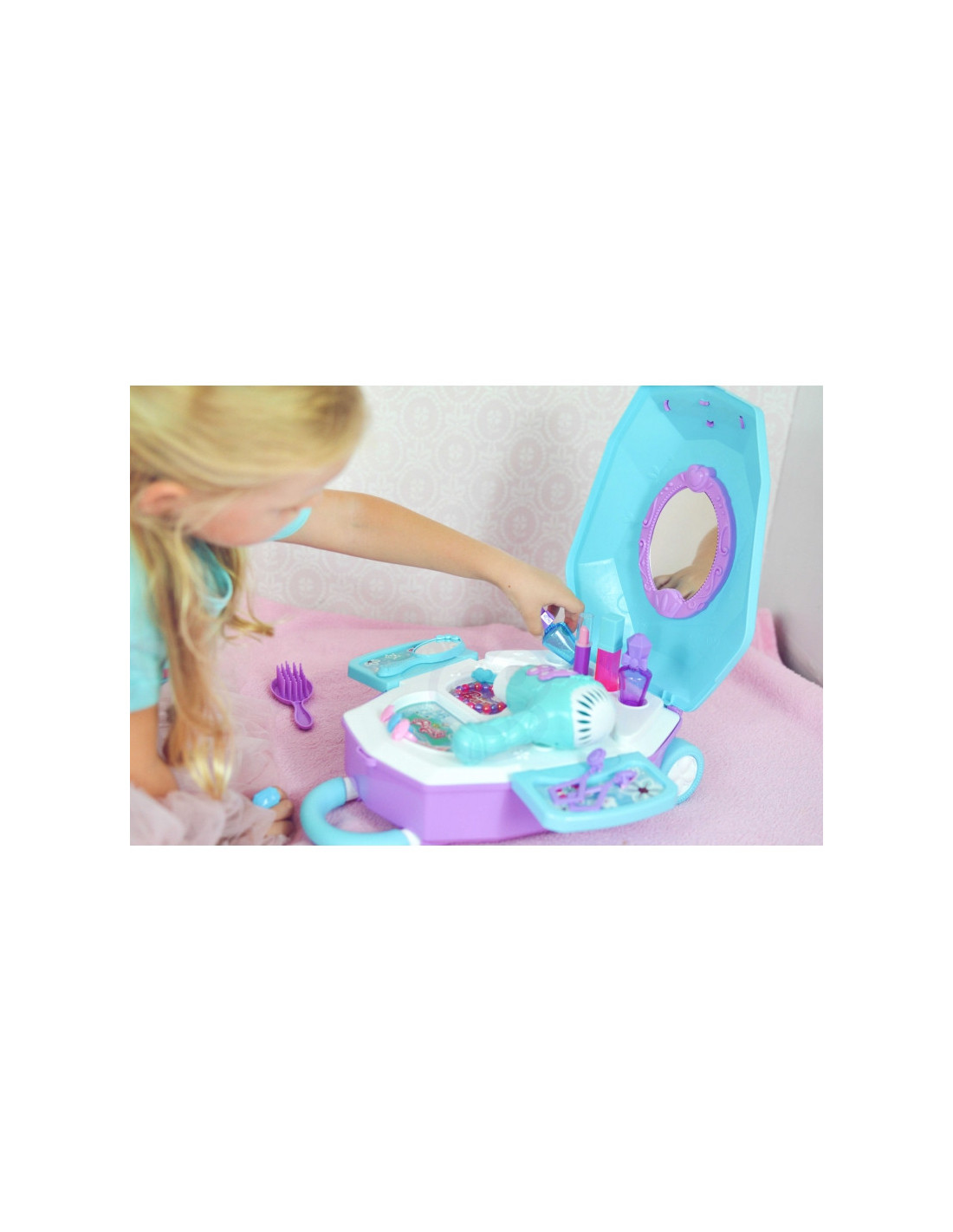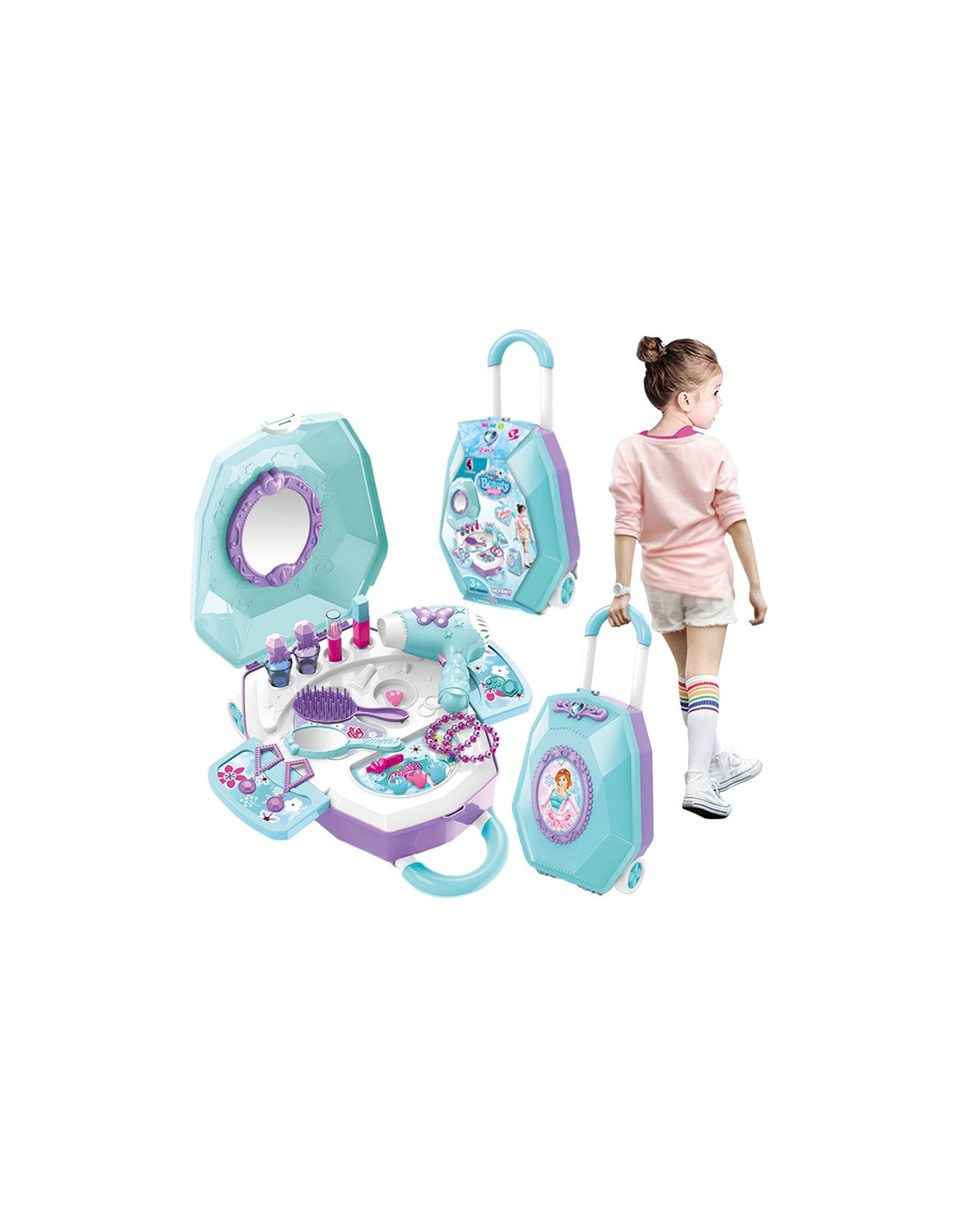 Toaletka dla Dziewczynki 2w1 Salon Piękności w Walizce od marki WOOPIE to idealna propozycja dla wszystkich małych księżniczek. Dzięki temu zestawowi dziecko może poczuć się jak prawdziwa księżniczka oraz posiada wszystko, aby przygotować się na wielki bal lub wyjście z przyjaciółmi. Wewnątrz walizki znajduje się lusterko i rozkładany blat toaletki. Zestaw oprócz akcesoriów jak lusterko, spinki czy szczotkę posiada, również suszarkę na baterię, która działa jak prawdziwa - dmucha powietrzem. Kosmetyki i inne akcesoria idealnie odwzorowują rzeczywiste przedmioty, co pozwoli wcielić się w małą księżniczkę!