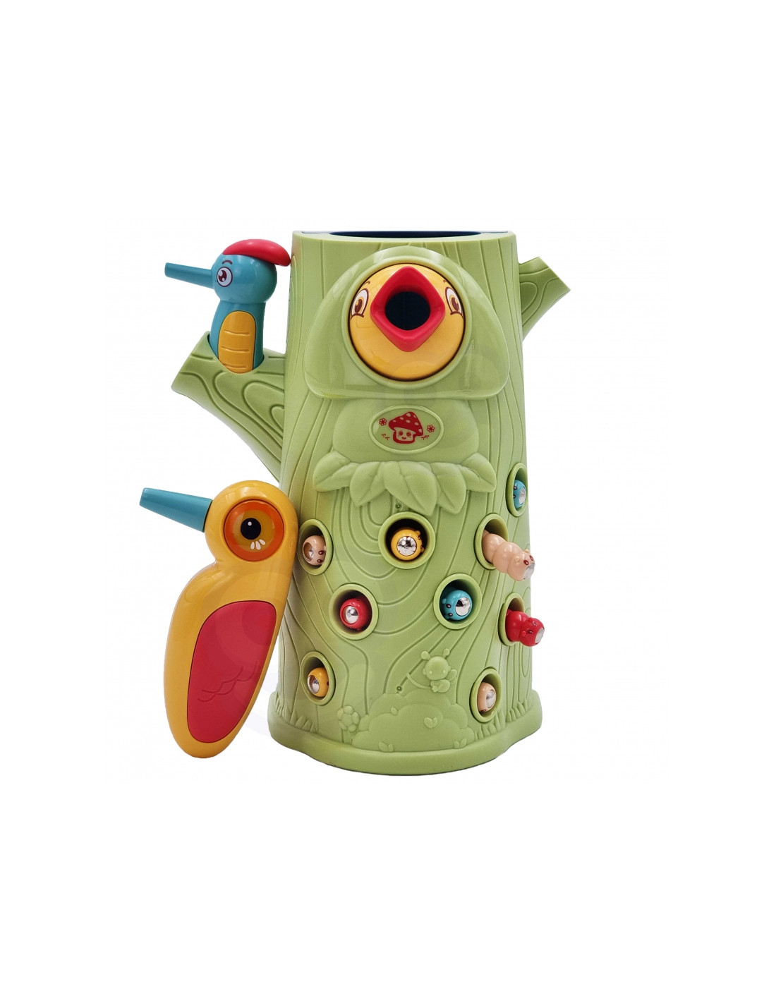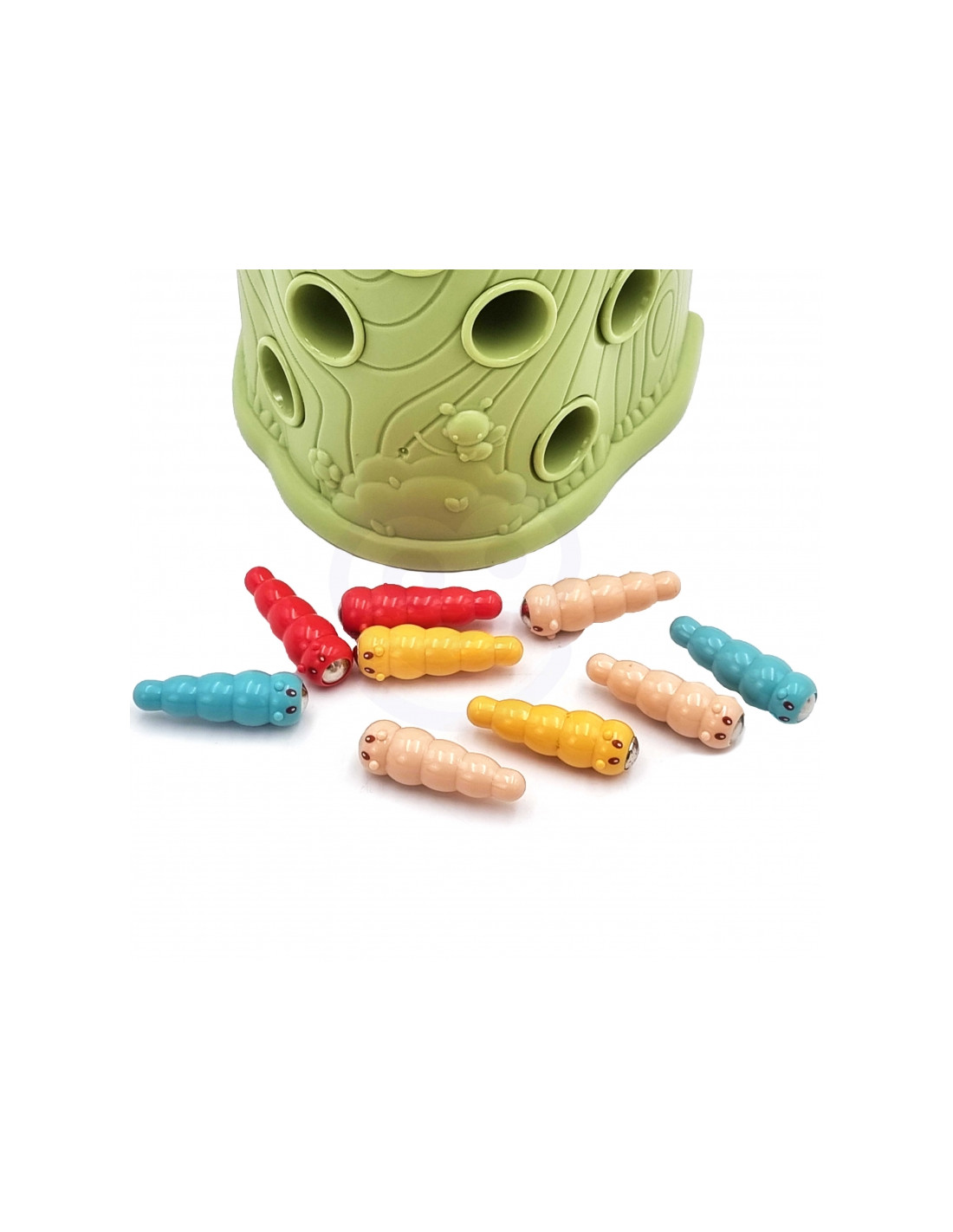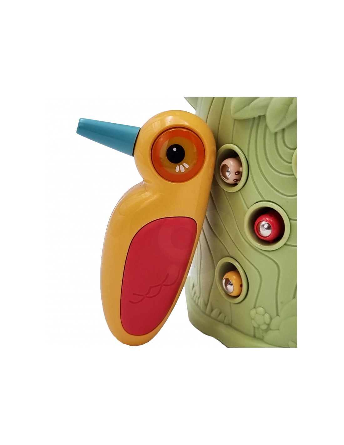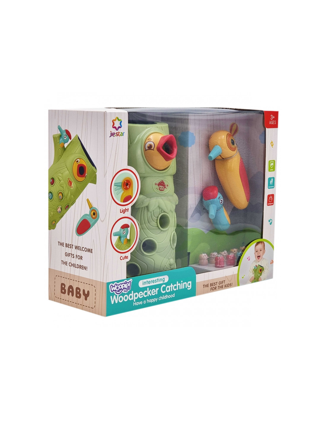 Gra Zręcznościowa Złap Robaczka od marki WOOPIE to doskonały sposób na wspólne spędzanie czasu z dzieckiem. Proste zasady oraz intuicyjna obsługa sprawiają, że zagrać w nią może praktycznie każdy. Zabawa polega na chwytaniu dzięciołem zakończonym magnesem robaczków ukrytych w otworkach znajdujących się w drzewie, a następnie na ich ponownym wkładaniu w dziób ptaszka. W zestawie oprócz dwóch dzięciołów do karmienia pisklaka i kłody z pisklakiem, znajduję się aż 9 robaków. Większy dzięcioł posiada dodatkowe funkcje: świeci, rusza dziobem i wydaję dźwięk oraz melodię. Wystarczy nacisnąć na trzon i zapala się oko dzięcioła oraz wydobywa się skoczna przyjemna melodia, ptak może też ruszyć dziobem w dół., a jego oko zaświeci się przy dźwięku ćwierkania. Zestawem może się bawić jednocześnie dwoje dzieci. Gra uczy przez zabawę - pomoże rozwinąć m. in. umiejętności motoryczne (ruchowe) oraz wzrokowe. Zabawka jest sporym wyzwaniem dla malucha, wymaga skupienia uwagi oraz sprawności manualnej, ale przez to niezwykle zaciekawi dziecko.