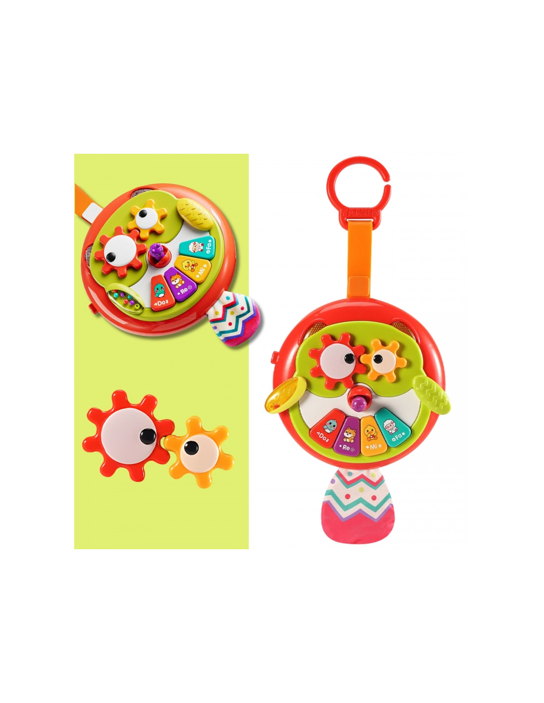 Interaktywna zawieszka w kształcie sowy od marki WOOPIE to urocza i funkcjonalna zabawka dla najmłodszych, która łączy w sobie edukację i zabawę. Kolorowa sówka została zaprojektowana tak, aby przyciągać uwagę dziecka różnorodnymi bodźcami – wzrokowymi, dotykowymi i dźwiękowymi. Skrzydełka sowy są ruchome, dzięki czemu maluch może je poruszać podczas zabawy. Z dzioba wystaje robaczek, który po pociągnięciu aktywuje ruch zębatek w oczach sowy. Na brzuszku sowy znajduje się kolorowe pianinko z oznaczeniami dźwięków (do, re, mi, fa). Po naciśnięciu klawiszy dziecko usłyszy delikatne, przyjazne melodie, które wspomagają rozwój słuchu i uczą rozróżniania tonów. Ogonek sówki wykonano z szeleszczącego materiału, a zawieszka jest wyposażona w uchwyt, który umożliwia jej przypięcie do wózka, łóżeczka czy fotelika.