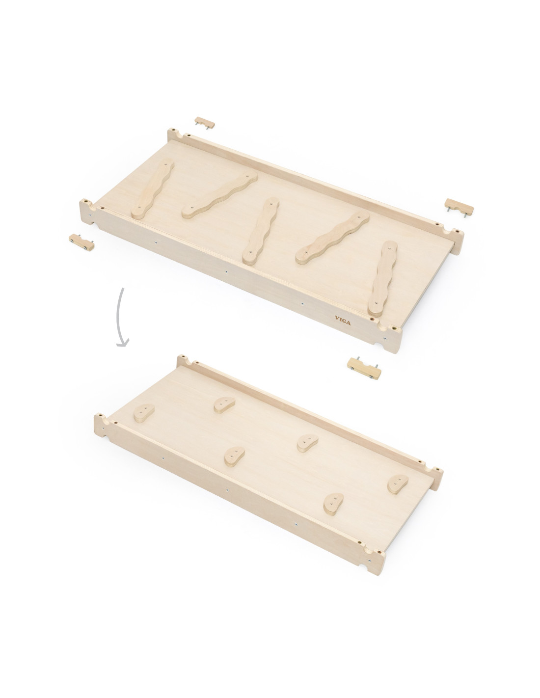 - Strona z wypustkami: Pełni rolę ścianki wspinaczkowej, ułatwiając wejście na wyższe elementy. Zjeżdżalnia wykonana jest z wysokiej jakości drewna bukowego i sklejki, co gwarantuje jej trwałość i stabilność.