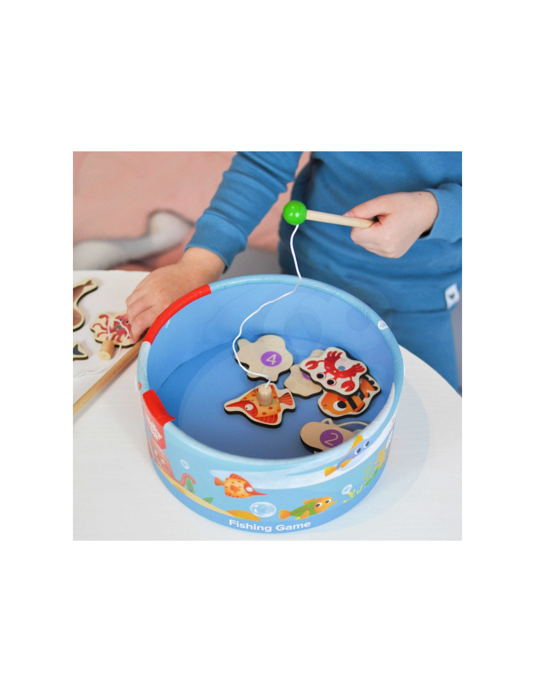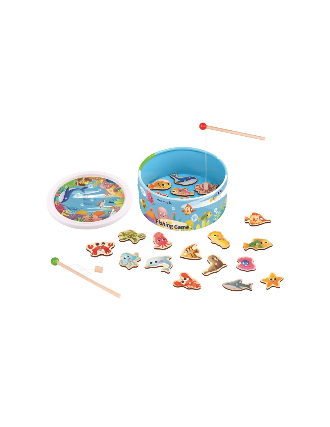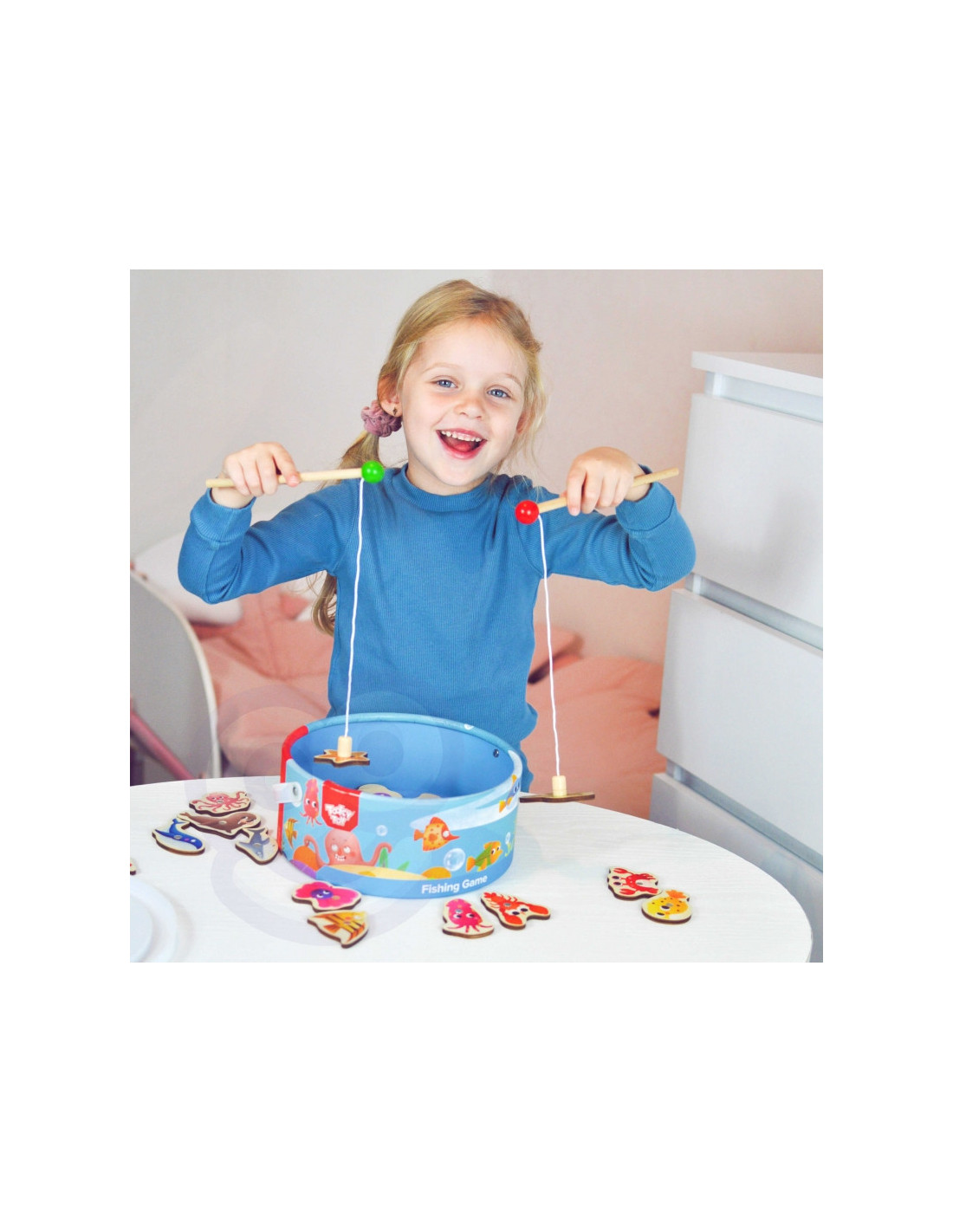 TOOKY TOY Gra Łowienie Ryb zestaw składający się z 22 elementów z wizerunkiem zwierząt oraz z wbudowanymi magnesami. Dwie drewniane wędki oraz wiaderko imitujące świat podwodny zapewni długie godziny zabawy. Gra pozwala na zabawę nie tylko jednej osoby, ale i gromadki urwisów. Całość wykonana została z drewna lakierowanego i pomalowana nietoksycznymi farbami w żywe barwy, które zadowolą każdego użytkownika i dadzą mnóstwo radości z zabawy. Gra ćwiczy koordynację ruchową i wspiera relację ręka-oko oraz uczy cierpliwości i skupienia. Wędki w dłoń i czas zacząć łowy!