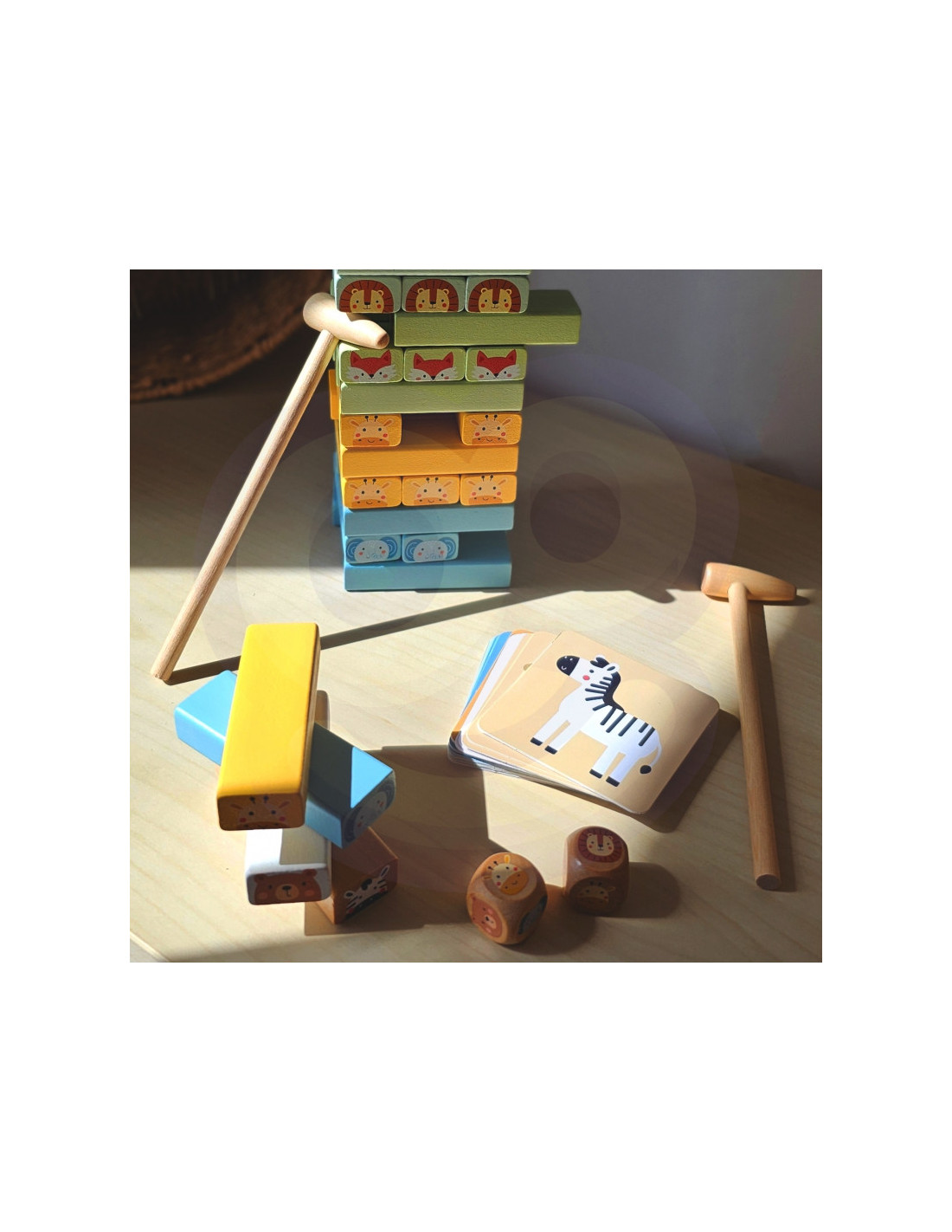 2. Układanie krzywej wieży z kostką - rzucamy kostką, wyciągamy klocek z wylosowanym zwierzakiem i kładziemy na górę wieży. Przegrywa osoba, której wieża się przewróci