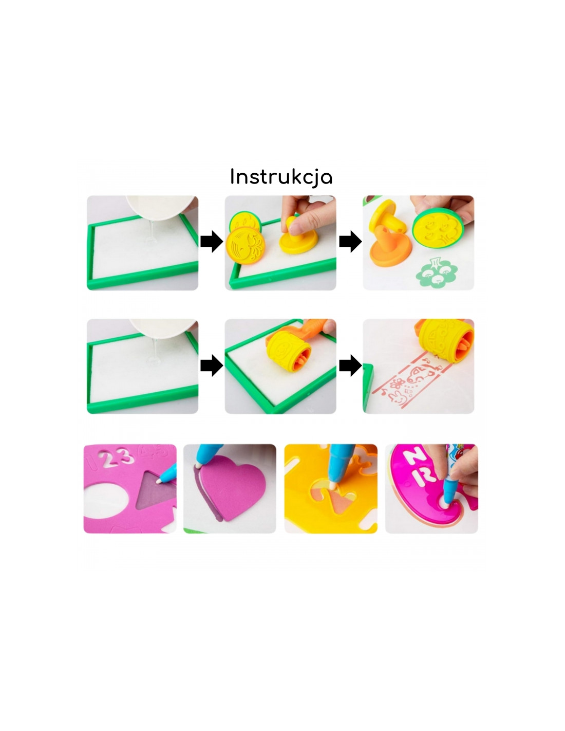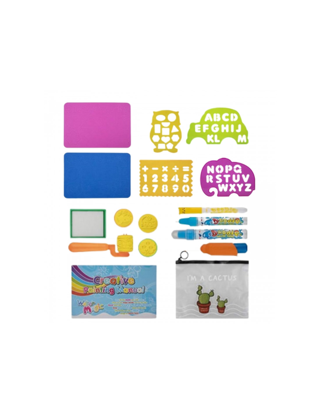 - - Kolorowe tematyczne strefy rysowania – zwierzęta, cyfry, alfabet, zegar, figury geometryczne