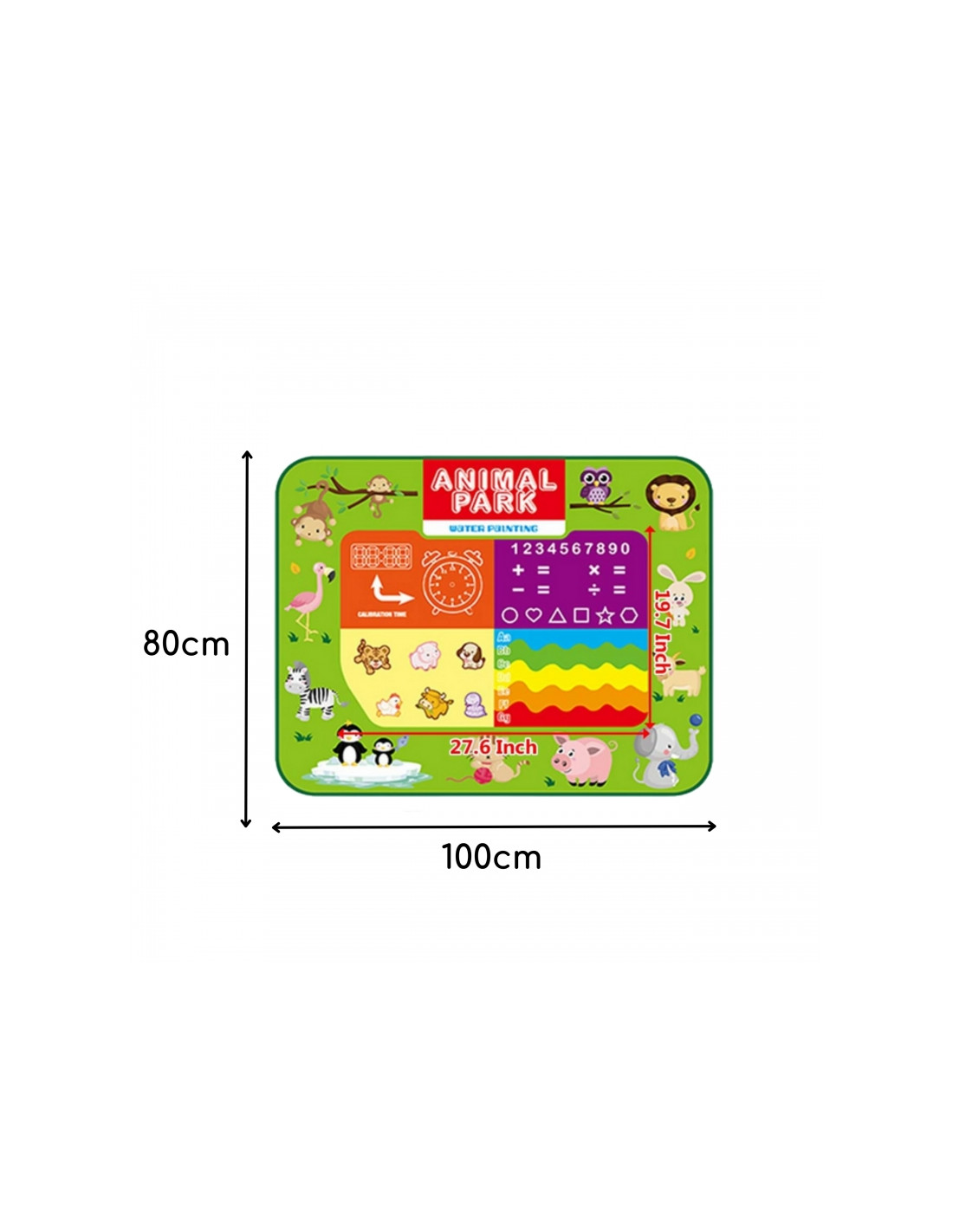 - - Dwustronny nadruk edukacyjny – jedna strona z alfabetem, cyframi i zwierzętami, druga z zadaniami matematycznymi i zegarem