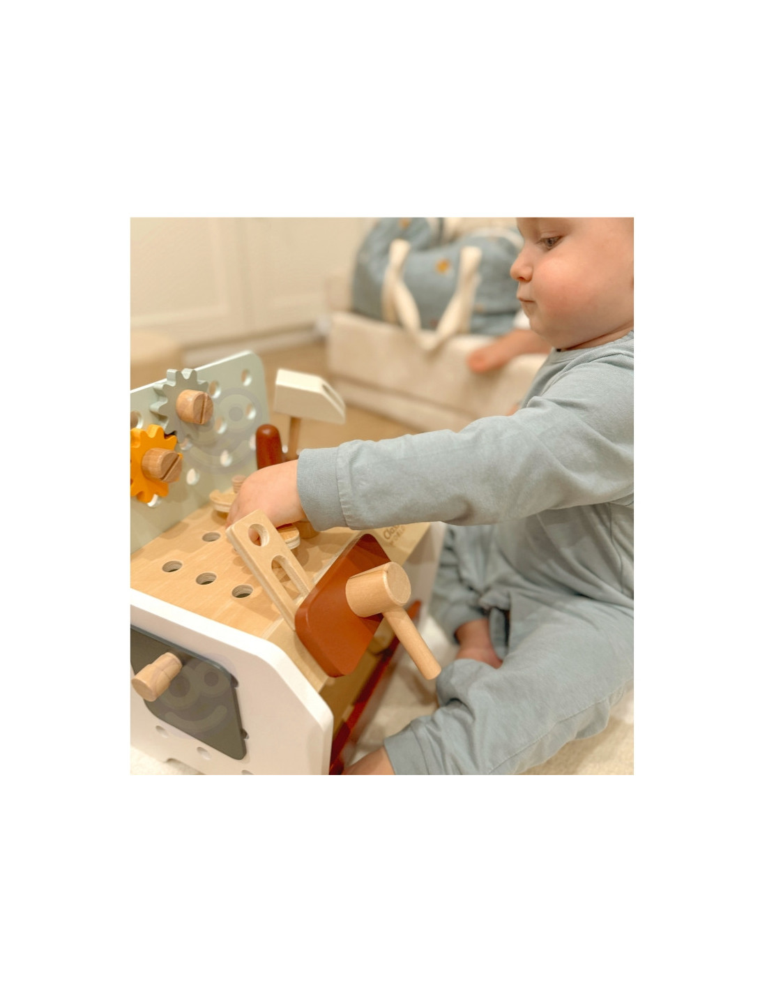 Drewniany stół warsztatowy od marki Classic World zapewni wspaniałą zabawę każdemu małemu majsterkowiczowi. Dzięki wielu narzędziom w zestawie, zabawa w majsterkowanie wspomoże rozwój zdolności manualnych, zaciekawi i rozpali dziecięcą wyobraźnię. Od teraz każdy maluch będzie miał okazje doskonalić swoją kreatywność gdyż zestaw zawiera wszystko co mu potrzebne do reperowania, wkręcania, wbijania gwoździ i wszelkich innych prac remontowych. Zestaw został wykonany z wysokiej jakości drewna, nie zawiera ostrych krawędzi, dzięki czemu jest bezpieczny dla dzieci i środowiska.