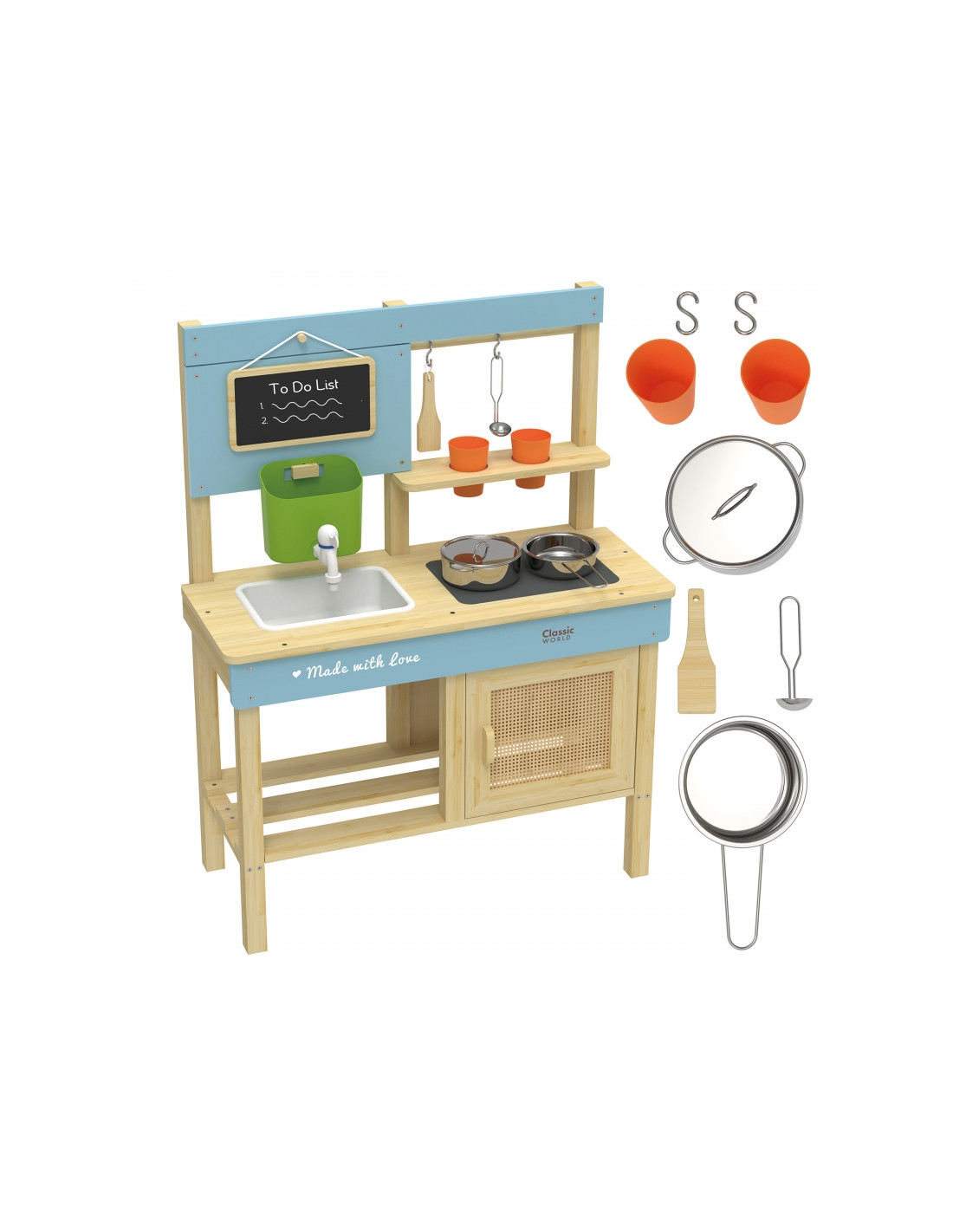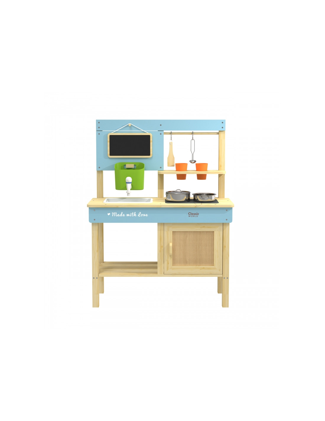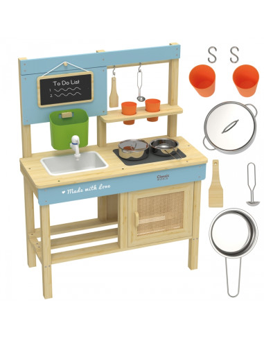Naśladowanie dorosłych to dla dzieci fantastyczna zabawa! Drewniana kuchnia błotna marki Classic World to idealna zabawka dla małych miłośników gotowania na świeżym powietrzu! Zaprojektowana z dbałością o szczegóły, wykonana z naturalnego certyfikowanego drewna, z uroczymi pastelowymi akcentami – stworzona, by rozwijać kreatywność, zdolności manualne i wyobraźnię dziecka poprzez zabawę w dorosłe życie. Zabawka może służyć smykowi do zabawy w restaurację lub sklep. Można ją wykorzystywać na mnóstwo różnych sposobów, a kreatywnej rozrywce nie ma końca! Zbiornik z kranikiem umożliwia obieg wody, dzięki czemu dziecko może bawić się w gotowanie, mycie naczyń lub mieszać błotko.