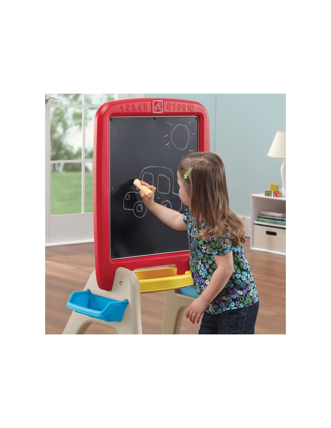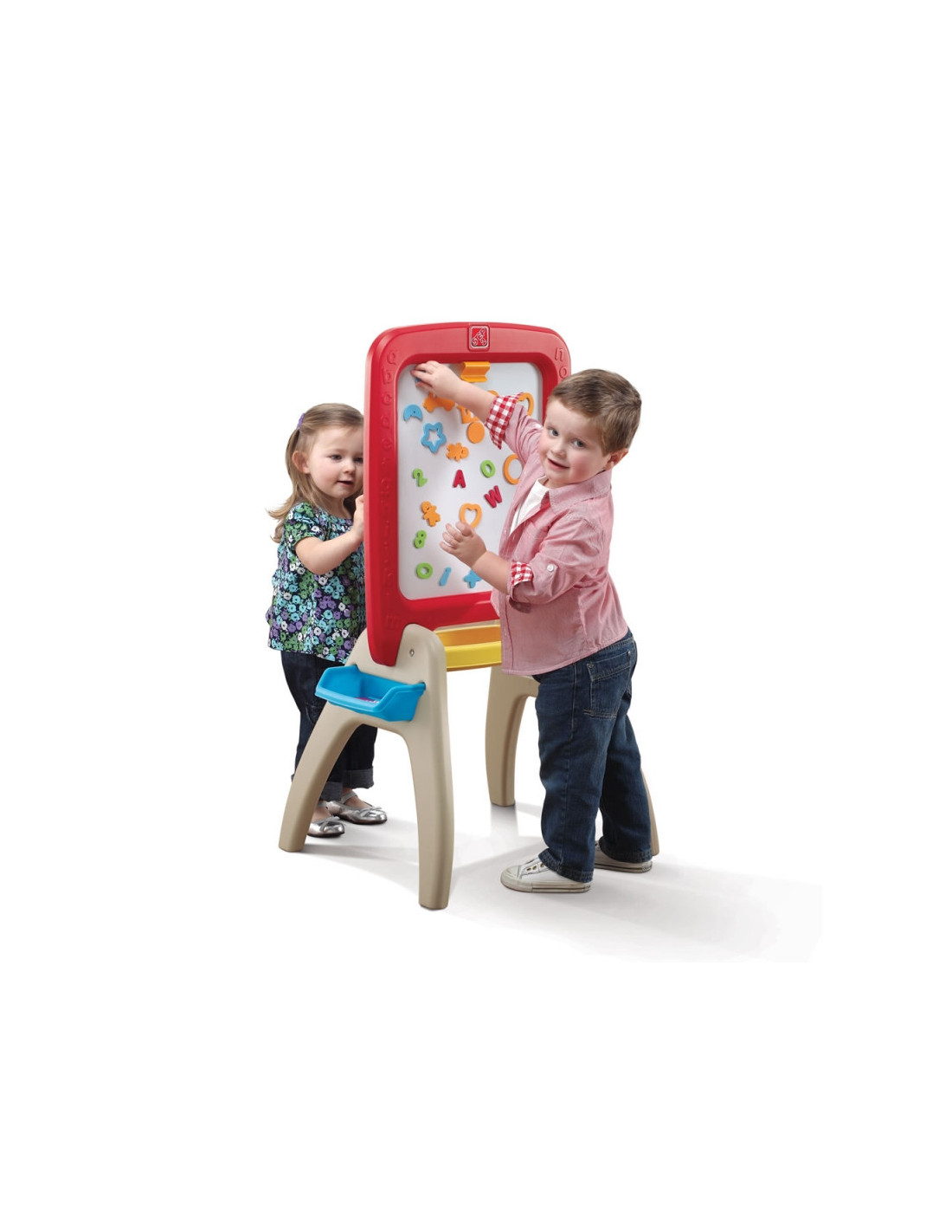 Podwójna tablica Step2 dla maluchów - z jednej strony tradycyjna do pisania kredą, a z drugiej markerem oraz możliwością przyczepiania piankowych, magnetycznych literek, cyferek i symboli. Łącznie w zestawie znajdziemy aż 94 elementy. Przyczyni się do tworzenia dziecięcych dzieł sztuki, oraz pomoże starszakom w nauce. Mali artyści mogą wykazać się kreatywnością, poprawiając swoje umiejętności motoryczne podczas pisania, rysowania i umieszczania magnesów. Wymagając minimalnego montażu dla dorosłych, sztaluga szybko się ustawia i leży płasko w celu łatwego przechowywania. Wyprodukowano w USA i niektóre importowane części.