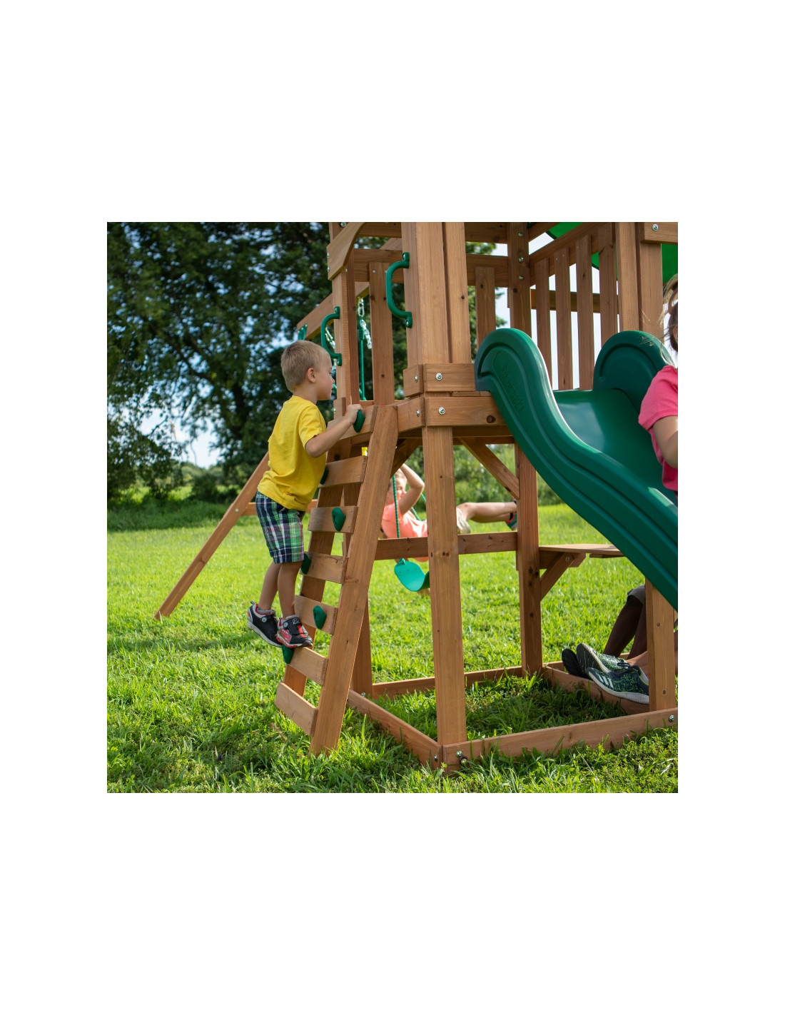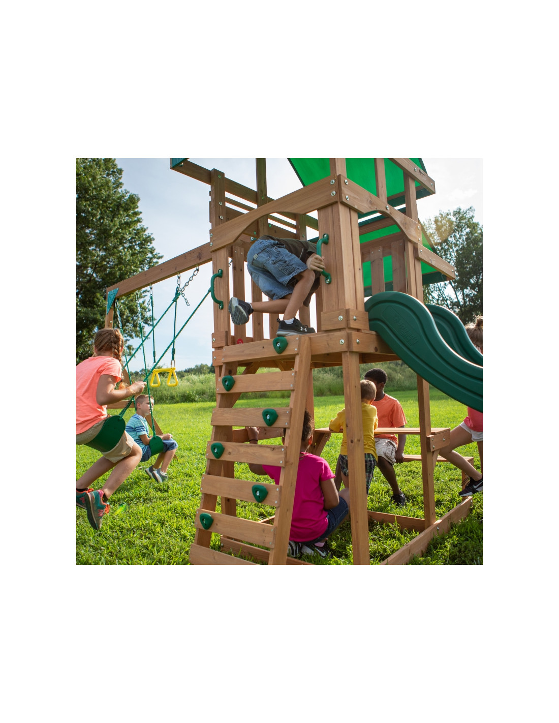 Backyard Discovery Belmont drewniany plac zabaw 6w1 zapewnij dzieciom zabawny sposób na aktywność fizyczną i ćwiczenia. Belmont jest wykonany w 100% z drewna cedrowego, a dzięki małej, zwartej strukturze sęków będzie ono mniej podatne na małe pęknięcia pochodzące z węzłów. Zbudowane zgodnie z najwyższymi standardami jakości.